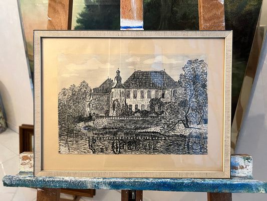 Antiker Kupferstich hinter Museumsglas Blick auf die Kirche 30x40cm