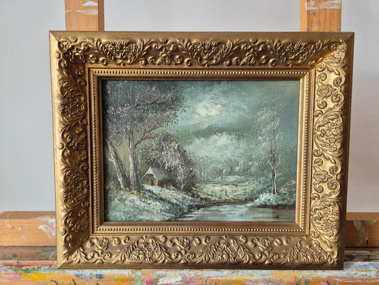 Europäische Schule (XX) Ölgemälde Winterabend am Bach mit Haus 25x31cm