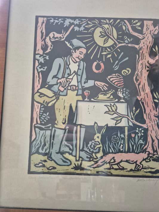 Original-Holzschnitt, handkoloriert, Jagdszene 44 x 38 cm