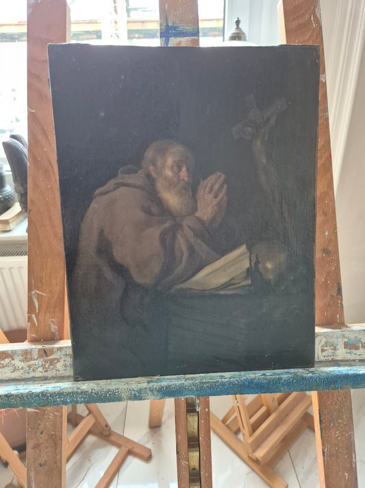 Betender Mönch mit Kruzifix, antikes Ölgemälde 32 x 27 cm