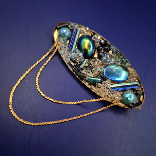 Vintage Brosche im Art-Déco-Stil – Irisierende Glassteine & Kettenverzierung