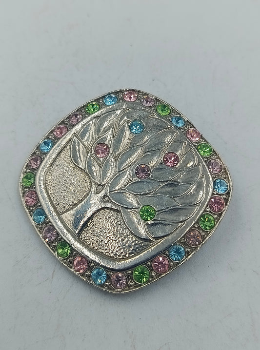 Kunstvolle Brosche Lebensbaum mit bunten Kristallsteinen und silberfarbener Oberfläche