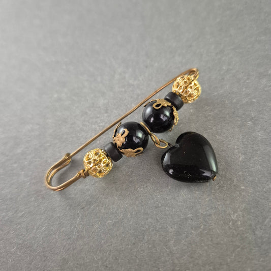 Dekorative Sicherheitsnadel mit schwarzem Herzanhänger – Vintage-Chic