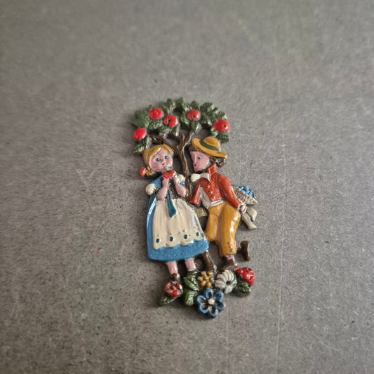 Bunte Vintage Brosche – Ländliches Liebespaar unter Apfelbaum