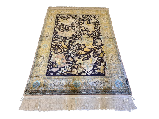 Feiner Handgeknüpfter Perser Seidenteppich Ghoum Kunstwerk Jagdszene 160x105cm