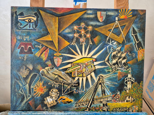 A. Schäfer (XX) Ölgemälde Fortschritt Wissenschaft und Zeitreise 48x38 cm
