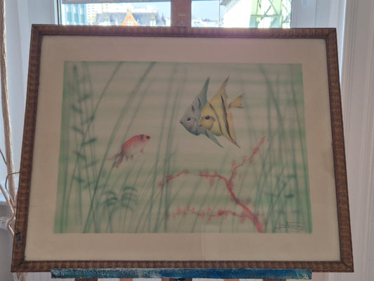 Chinesische Grafik Lithographie Aquarium Fische und Gräser 52x66cm