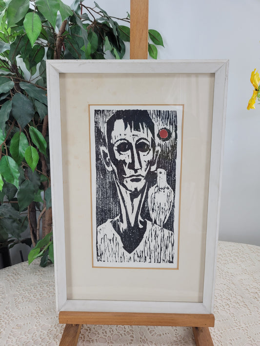Hanka Krawcec (1901-1990) Original Holzschnitt Männerportrait mit Taube