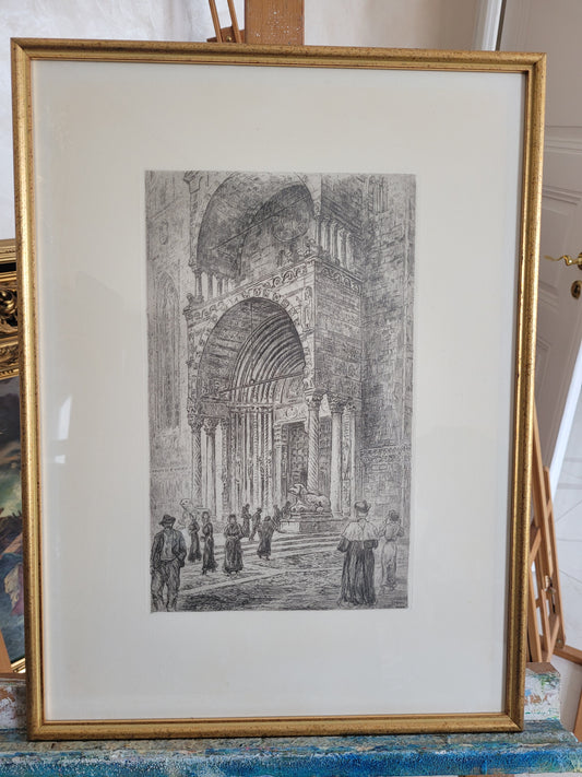 Original Radierung hinter Glas Großer Eingang zur Kathedrale 55x40cm