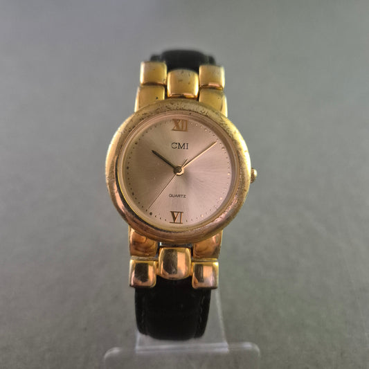 CMI Damen Uhr – Goldfarbenes Gehäuse mit schwarzem Lederarmband