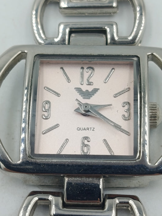 Elegante Armbanduhr aus silberfarbenem Metall mit rechteckigem Gehäuse und Gliederarmband