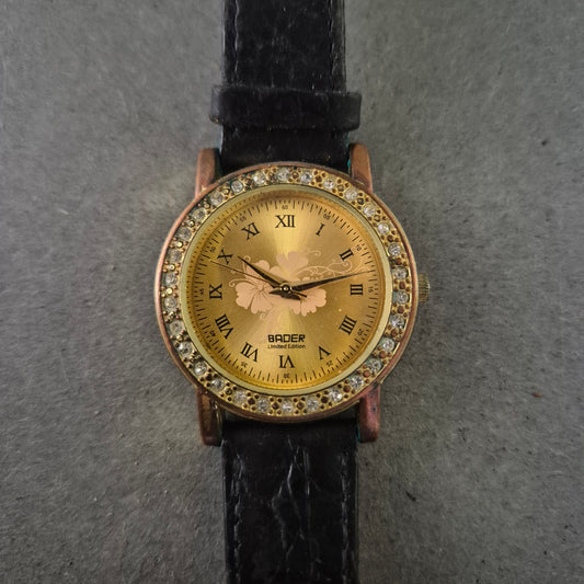 BADER Damenarmbanduhr – Vergoldeter Look mit Strass und Blumenmotiv