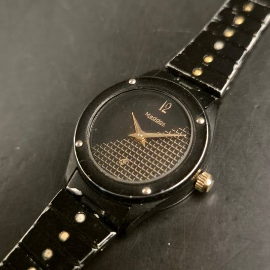 Vintage Maddox Armbanduhr – Schwarz-Gold mit Gittermuster
