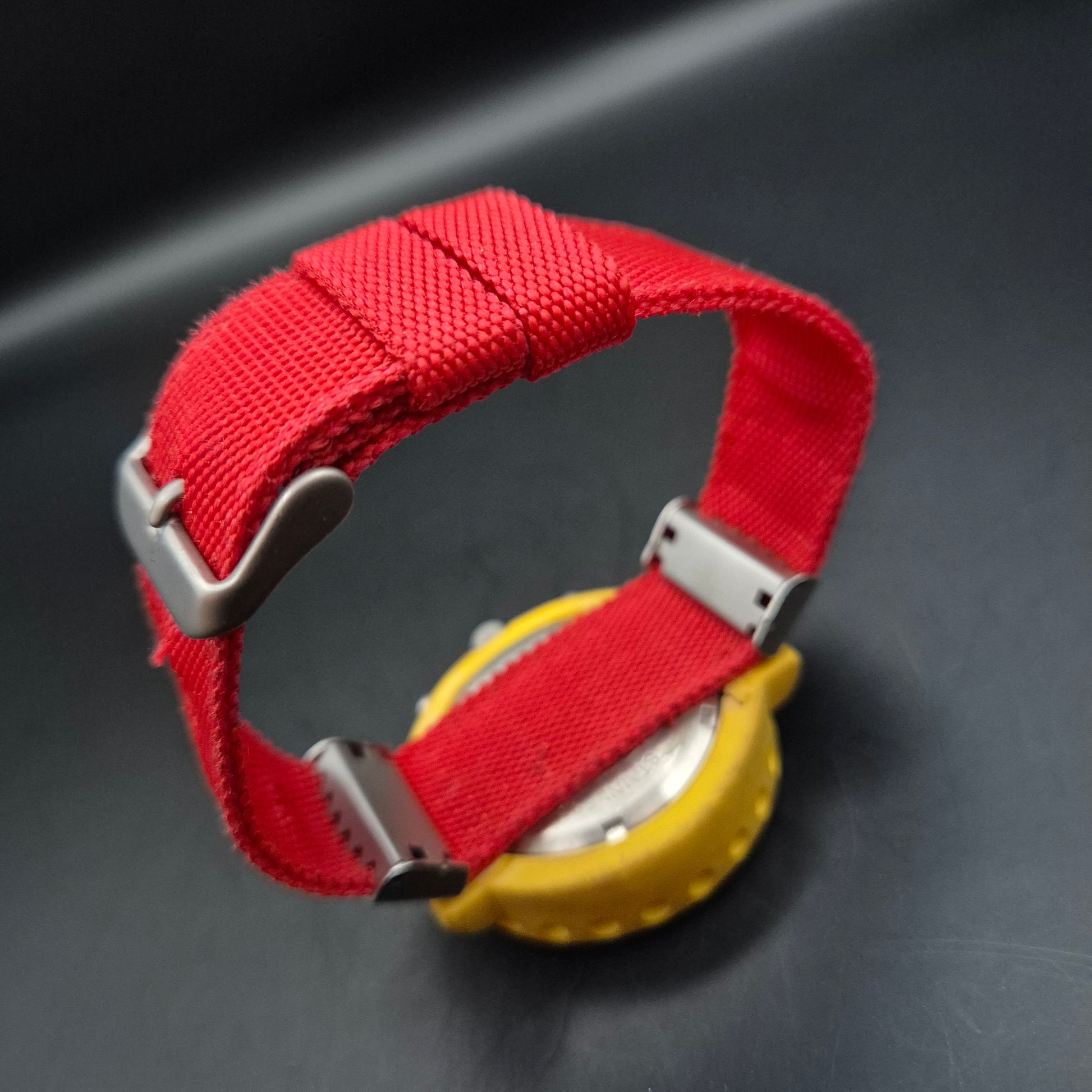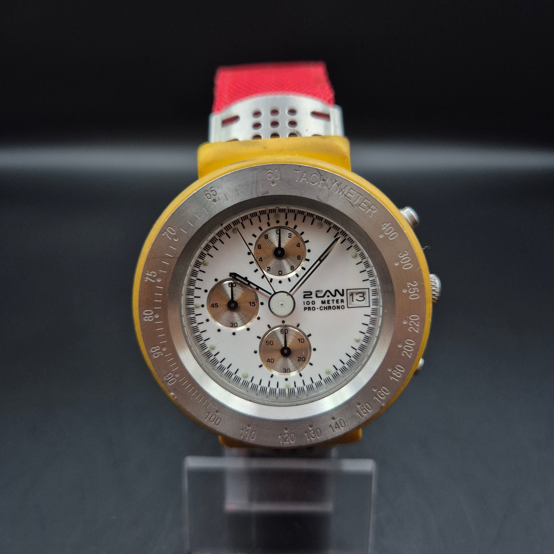 Die 2CAN Herrenarmbanduhr überzeugt durch ihr auffälliges, sportliches Design. Das gelbe Gehäuse kombiniert mit dem roten Textilarmband macht diese Uhr zu einem echten Blickfang. Auf dem weißen Zifferblatt sorgen drei Hilfsanzeigen für die Chronographenfunktionen sowie eine Datumsanzeige bei 4 Uhr für praktische Alltagstauglichkeit.