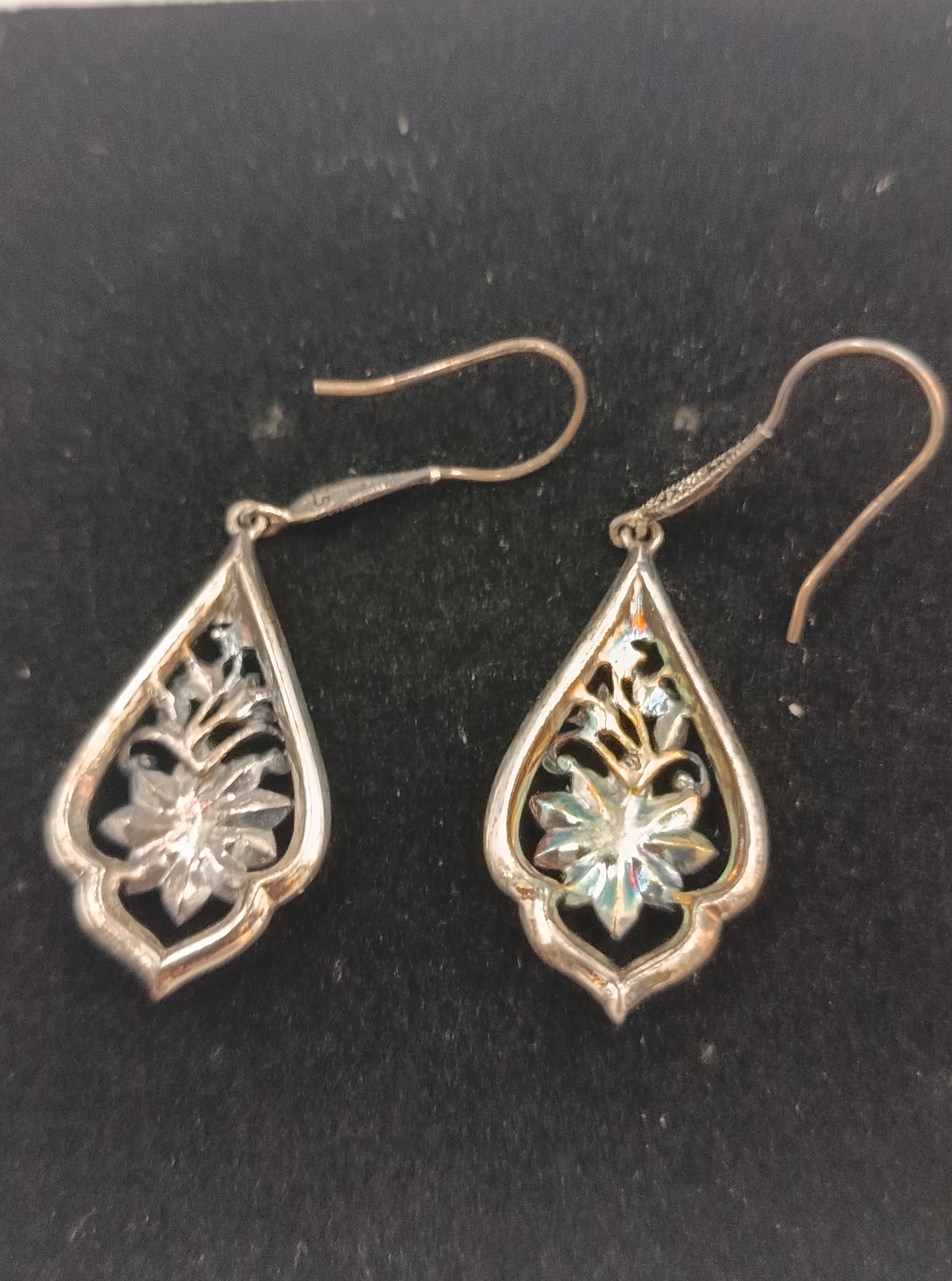 Wunderschöne Ohrringe aus 925er Silber mit filigranem Blumenmuster und farbiger Emaille-Verzierung in Grün-, Blau- und Brauntönen. Das tropfenförmige, orientalisch inspirierte Design verleiht diesen Schmuckstücken eine elegante und zugleich kunstvolle Ausstrahlung.