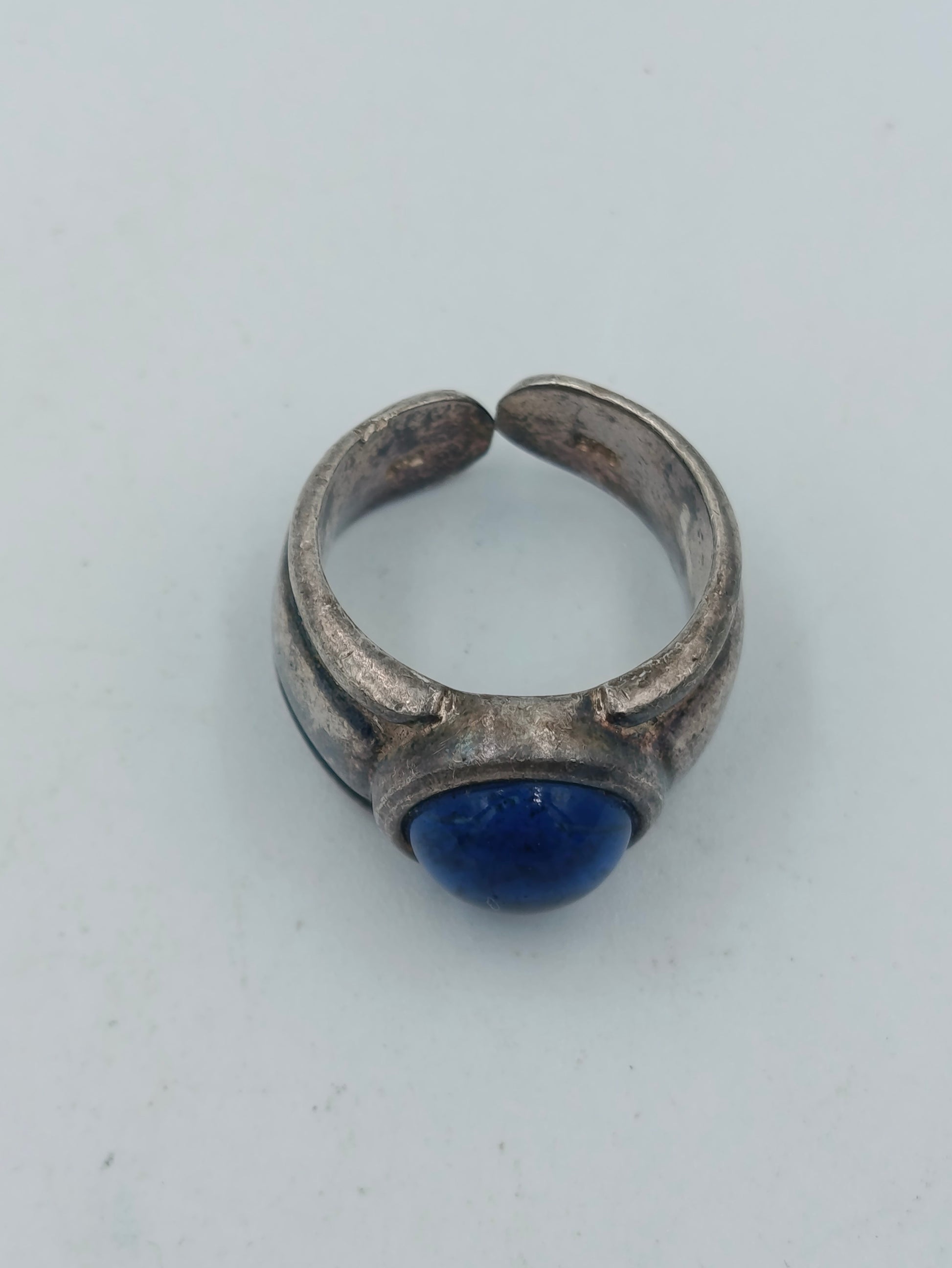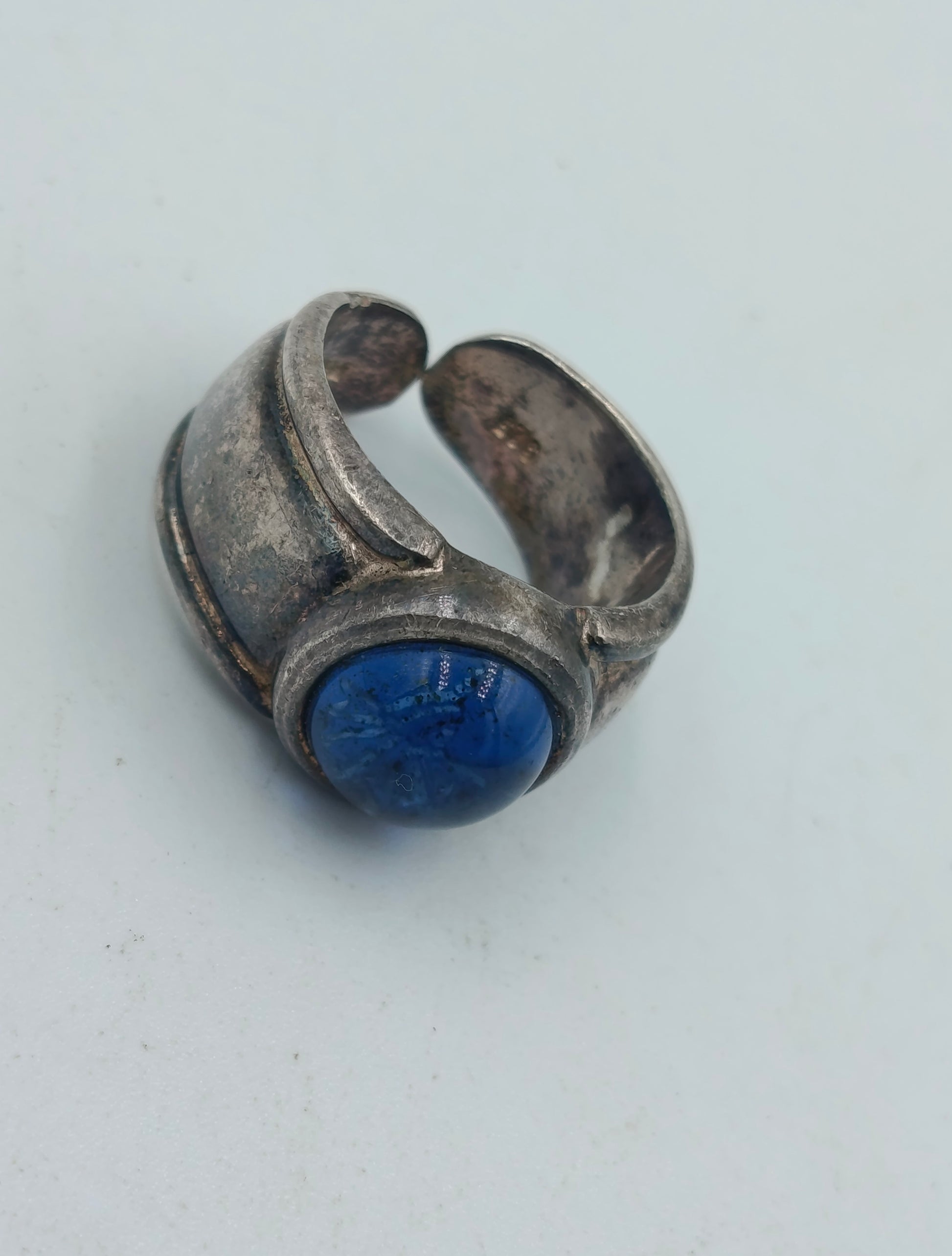 Massiver 925 Silber Ring mit auffälligem blauen Cabochon-Stein in antikem Design. Der Ring besitzt eine offene Rückseite und lässt sich leicht anpassen. Das kräftige Silber mit Patina verleiht ihm einen charaktervollen Vintage-Look – ein besonderes Schmuckstück für Liebhaber von handgearbeitetem Silberschmuck.