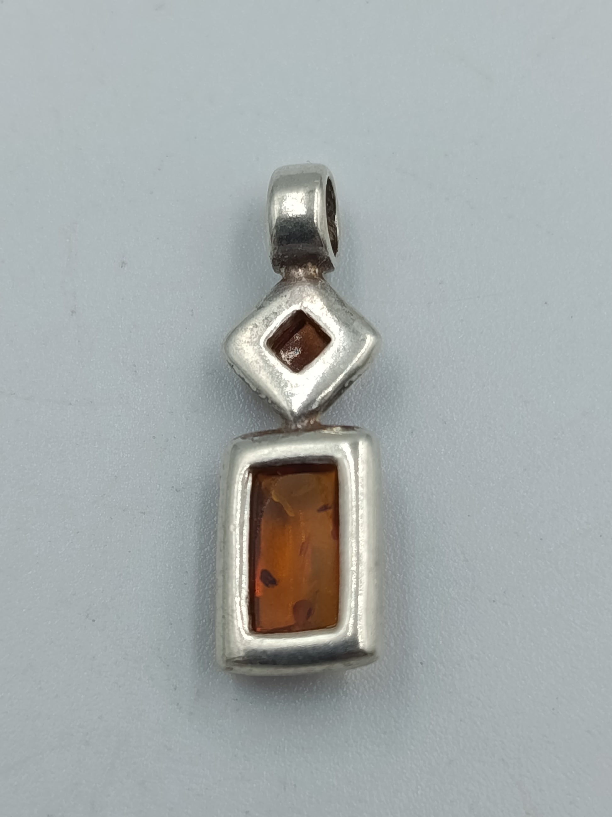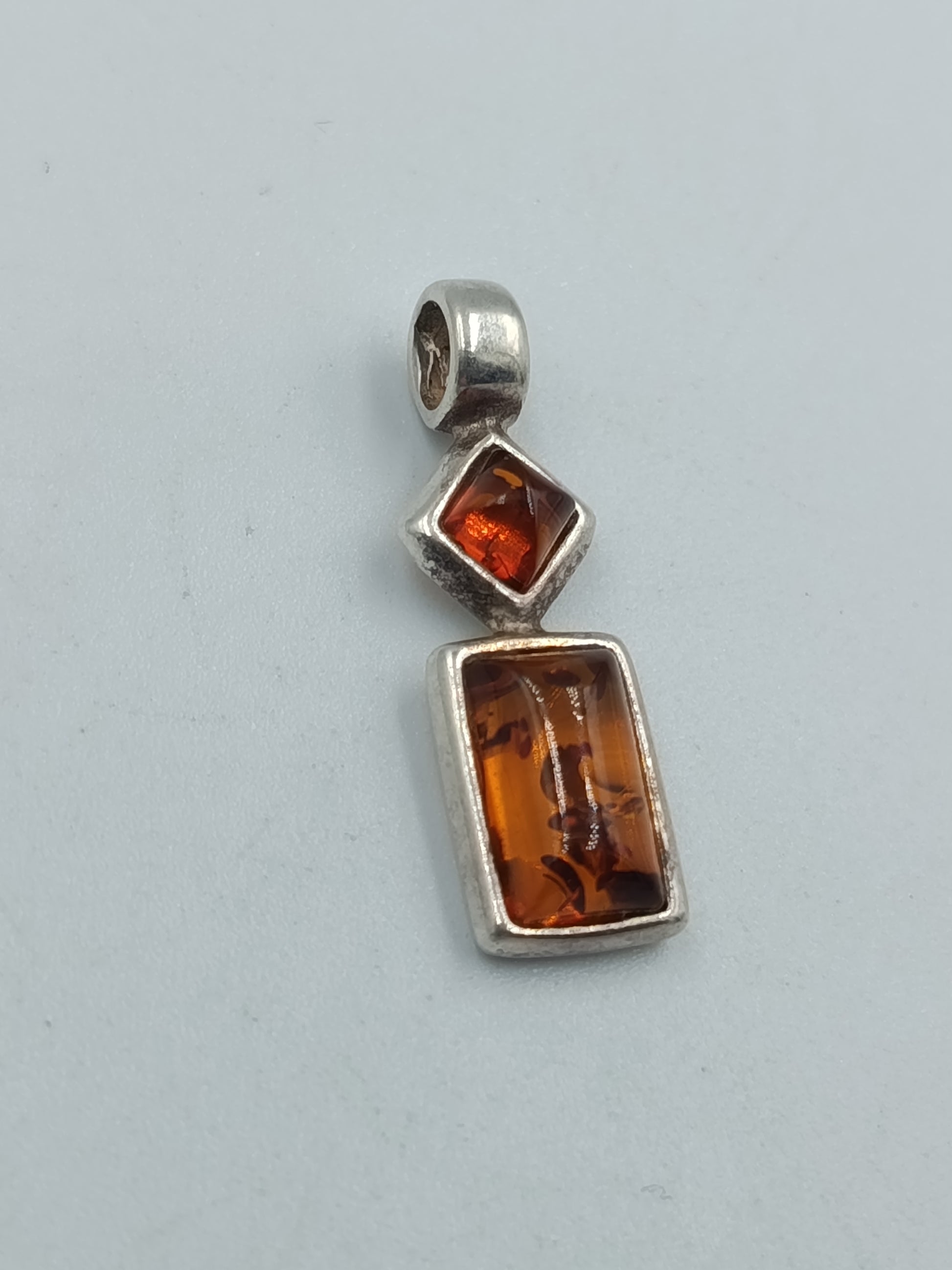 Eleganter Anhänger aus echtem 925er Silber, besetzt mit zwei wunderschönen Bernsteinen in unterschiedlichen Schliffarten. Der rechteckige, größere Bernstein zeigt die typischen warmen Einschüsse und strahlt in kräftigem Honig-Orange, während der kleinere, rhombenförmige Stein darüber einen harmonischen Kontrast bildet. Ein klassisches und zugleich modernes Schmuckstück, das durch Natürlichkeit und Eleganz besticht.