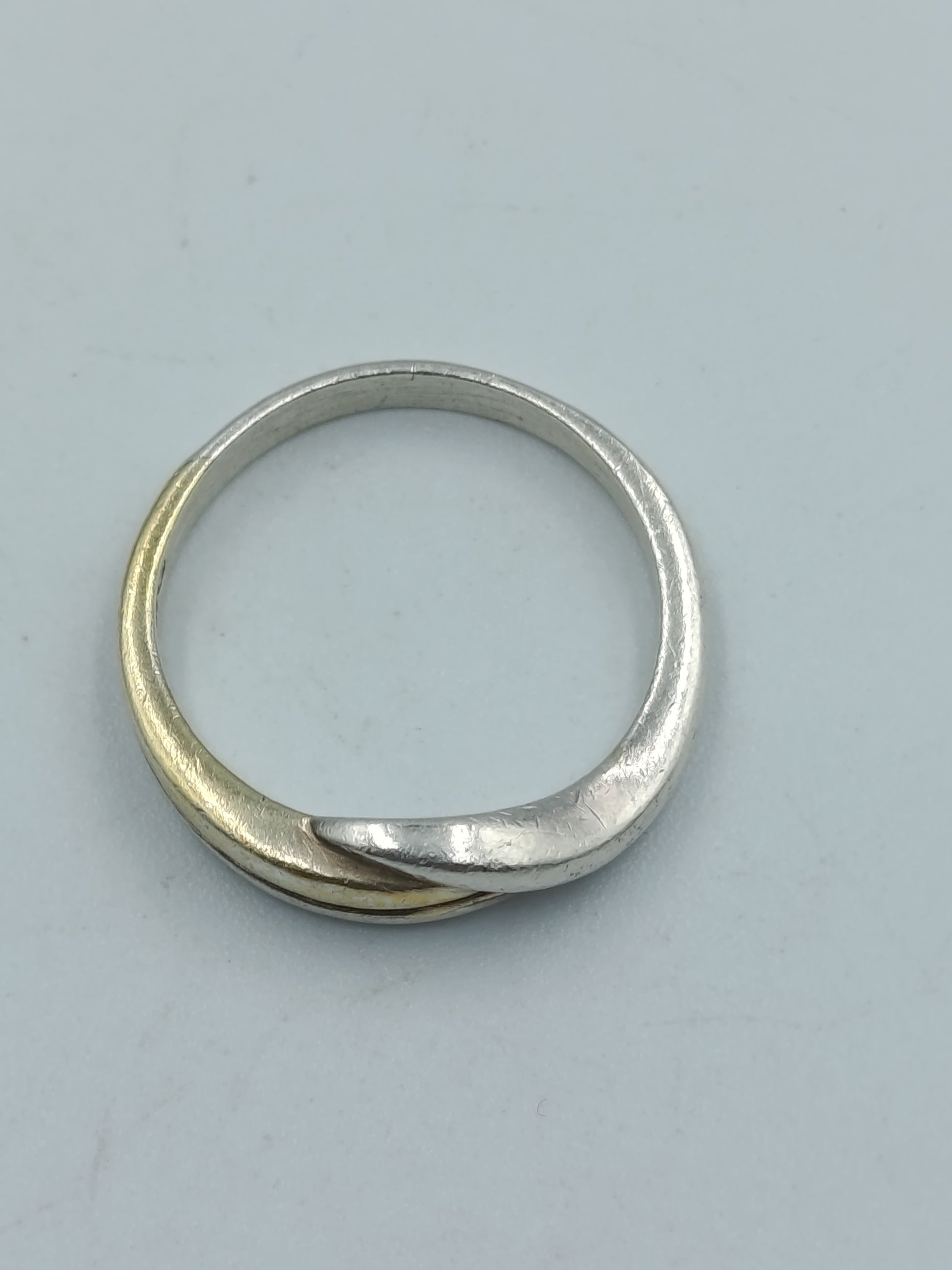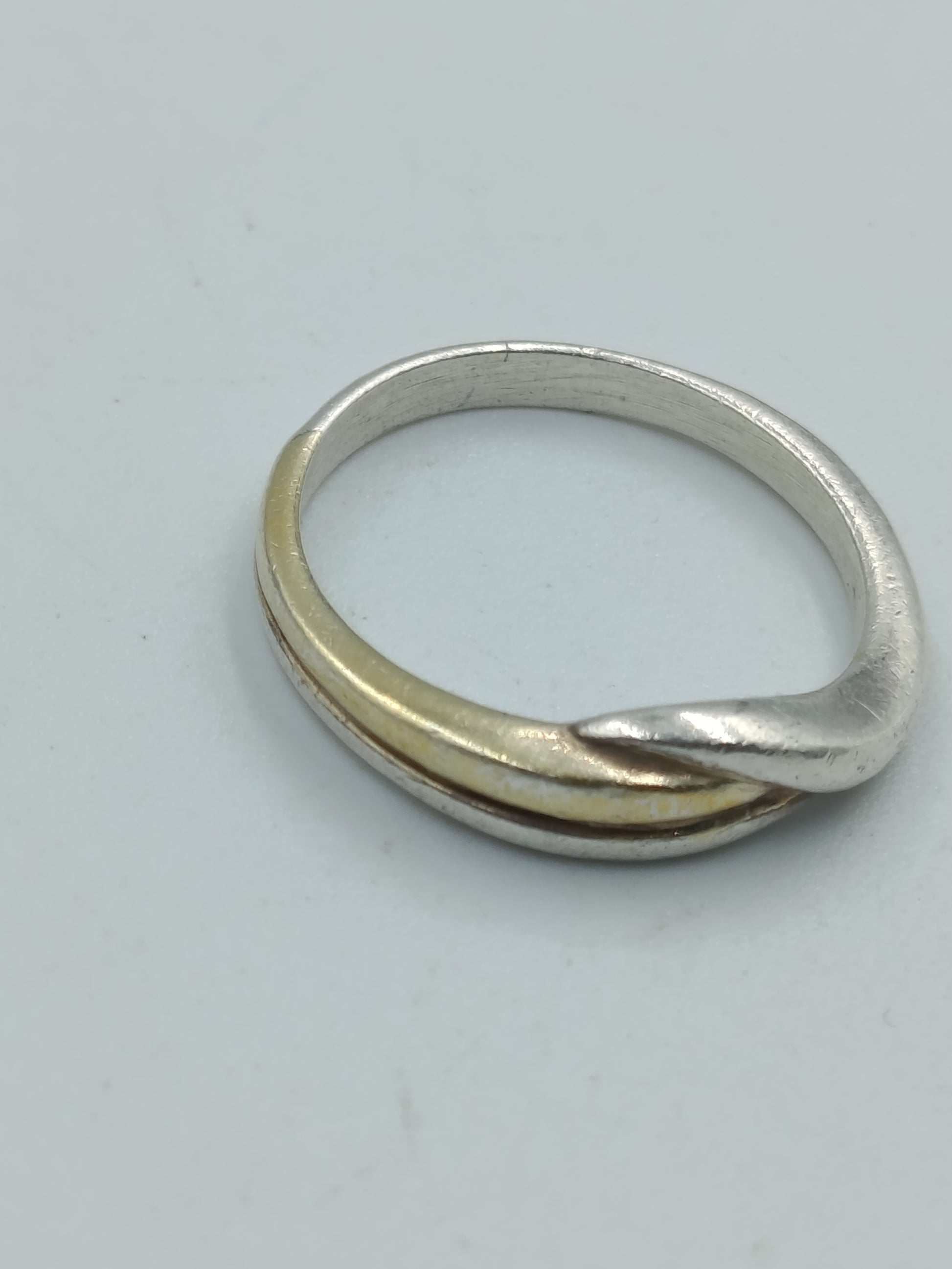 Ein eleganter Ring aus echtem 925er Sterlingsilber im modernen Bicolor-Design. Die sanft geschwungene Form verbindet Silber mit einem goldfarbenen Akzent, was dem Ring eine raffinierte, zeitlose Optik verleiht. Durch die schlanke Ausführung ist er leicht und angenehm zu tragen – perfekt als dezenter Alltagsring oder stilvolles Accessoire für besondere Anlässe.