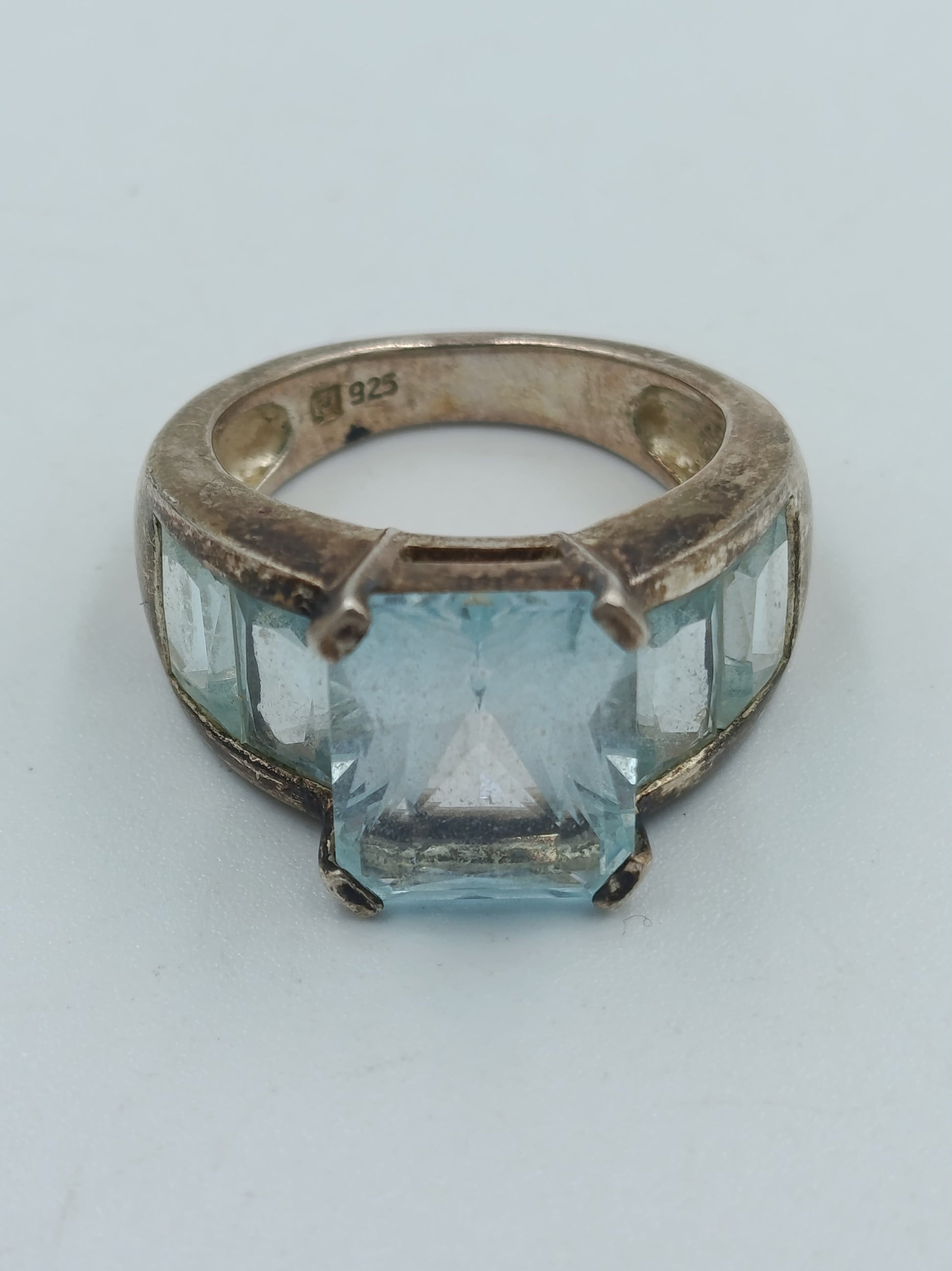 Ein edler 925er Silberring mit einem eindrucksvollen, rechteckig geschliffenen hellblauen Schmuckstein im Zentrum. Ergänzt wird das Design durch seitlich eingefasste rechteckige Steine, die den Ring zu einem echten Blickfang machen. Der massive Silberkorpus sorgt für Stabilität und eine wertige Haptik. Ideal als elegantes Accessoire oder für besondere Anlässe.