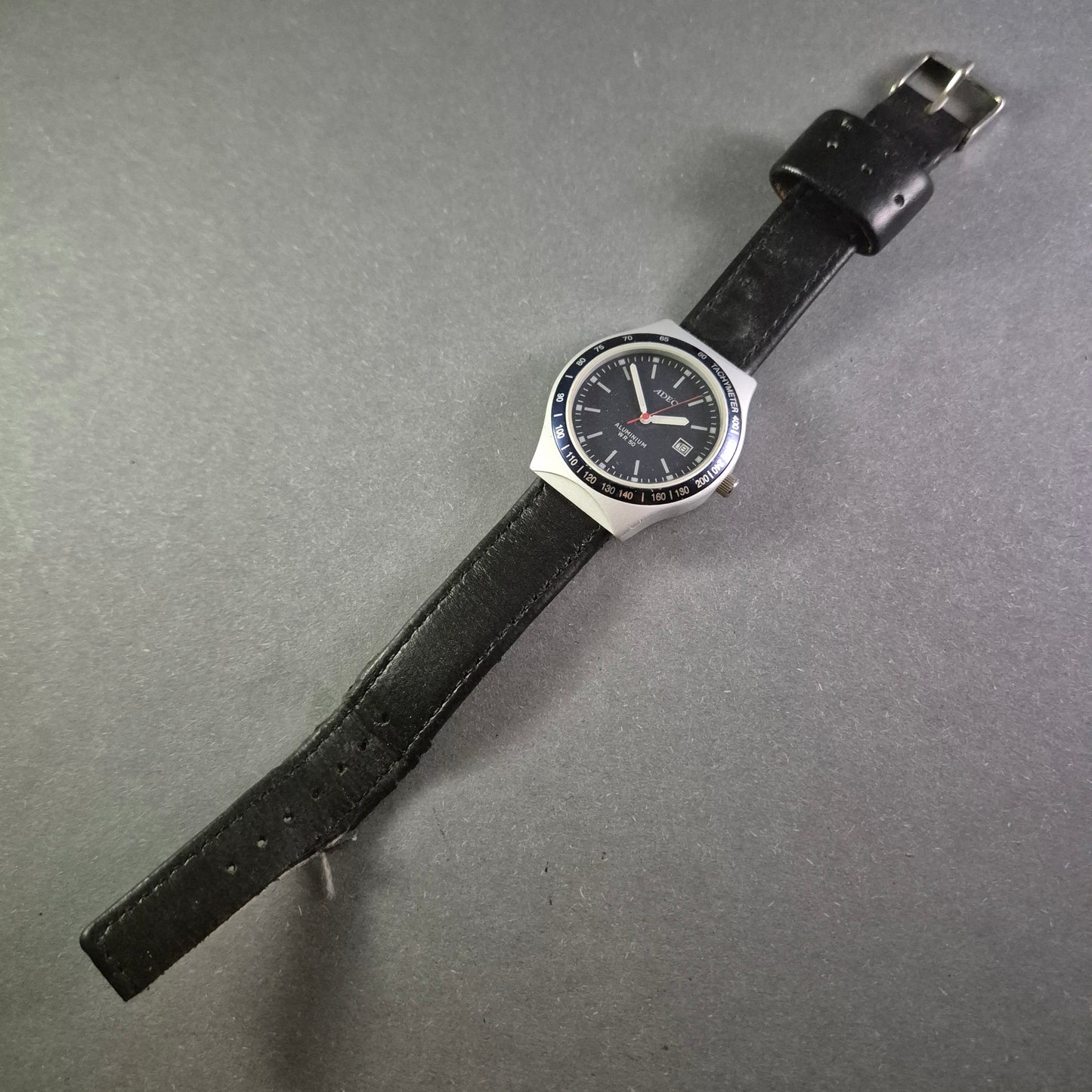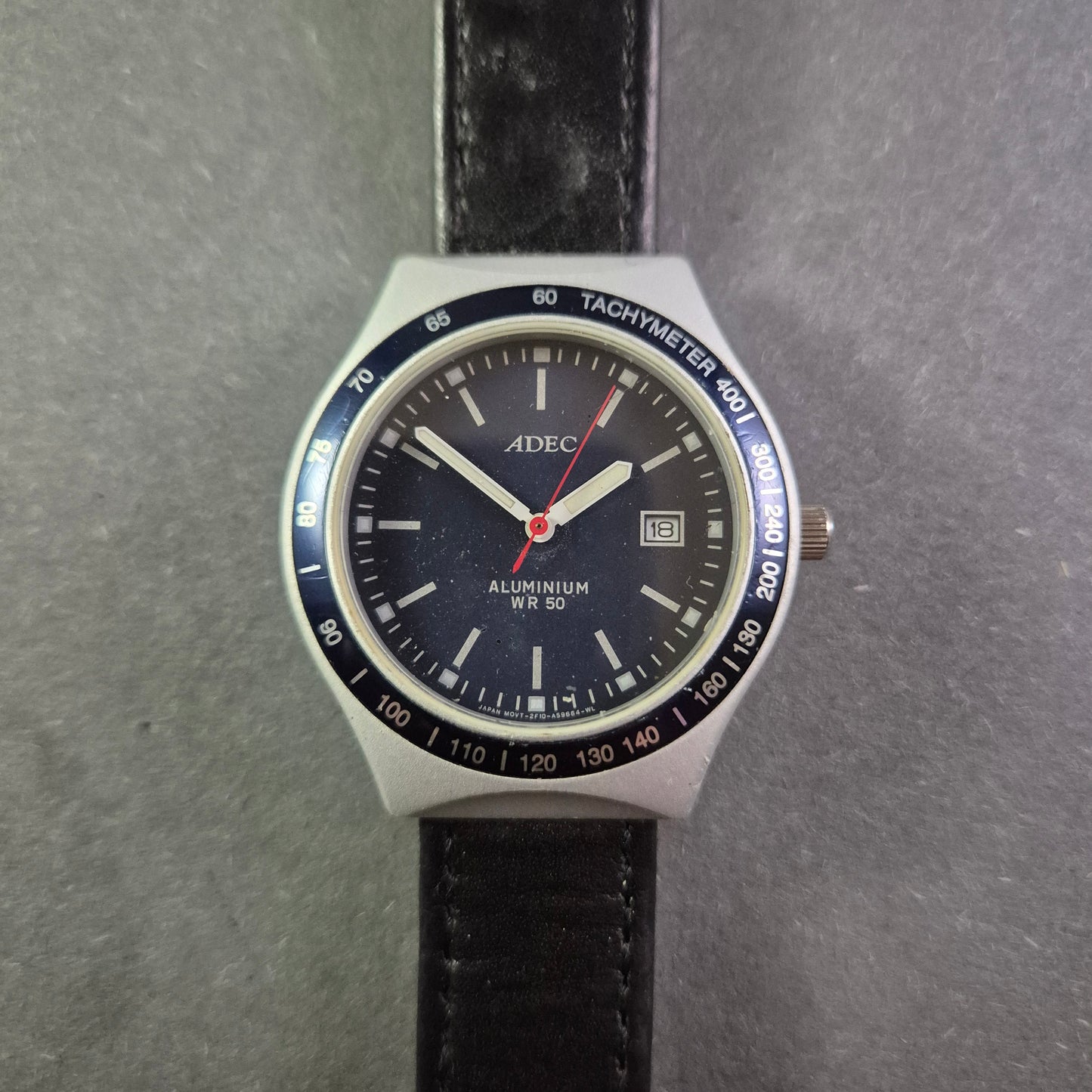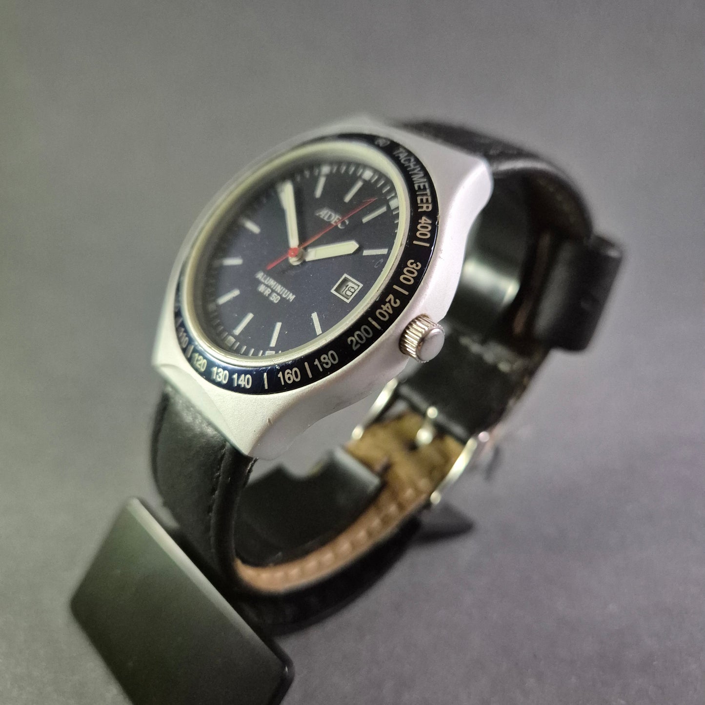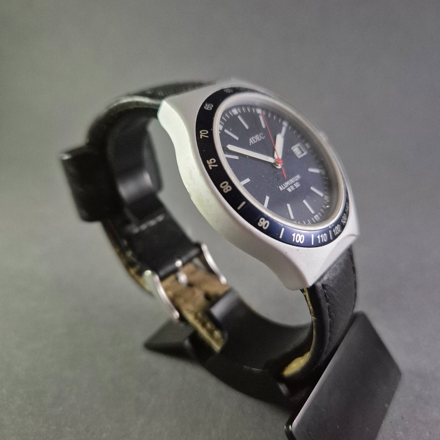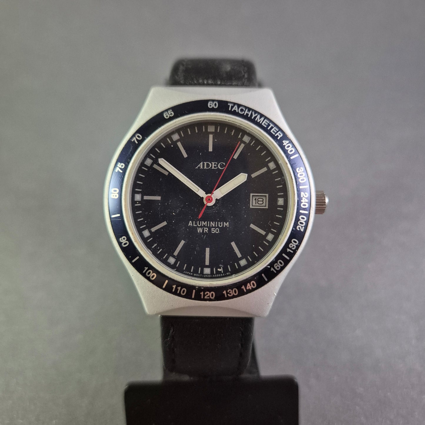 Die sportliche Herrenarmbanduhr von ADEC kombiniert Robustheit und Funktionalität. Das Aluminiumgehäuse und das klare Zifferblatt mit Datum machen diese Uhr zu einem vielseitigen Begleiter für den Alltag. Die drehbare Tachymeter-Lünette und die Wasserdichtigkeit bis 50 Meter unterstreichen das praktische Design. Das schwarze Lederarmband sorgt für einen angenehmen Tragekomfort.