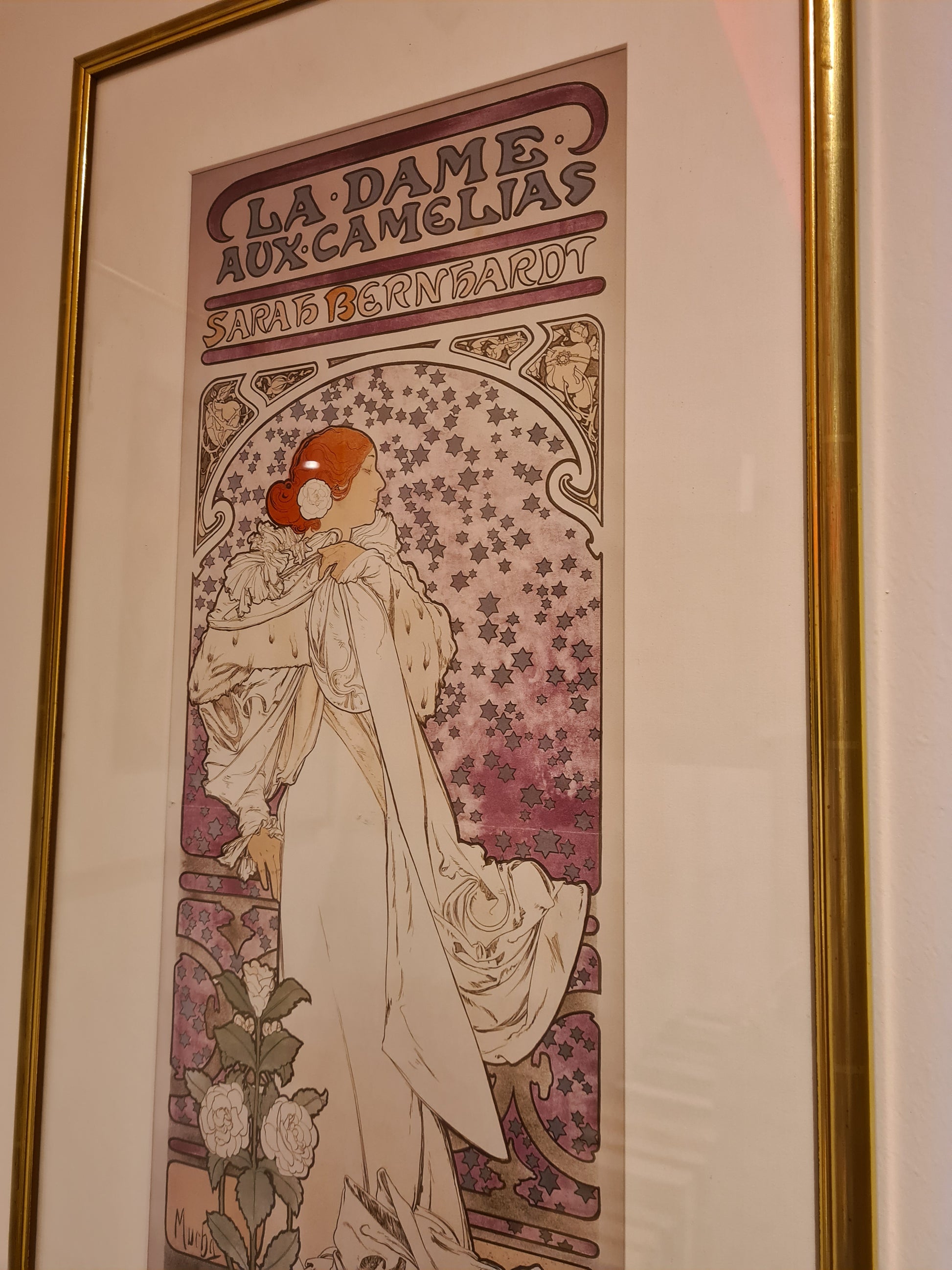 angeboten wird ein Vintage Theatre Druck von Alphonse Mucha, ein stilvolles Bild von Sarah Bernhardt im klassischen Jugendstil.