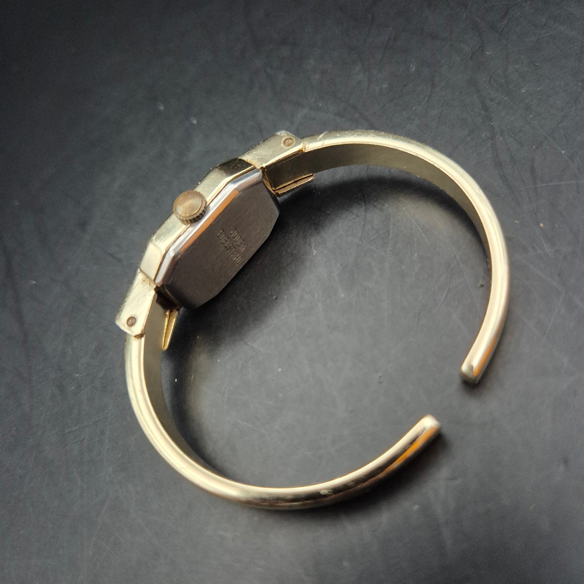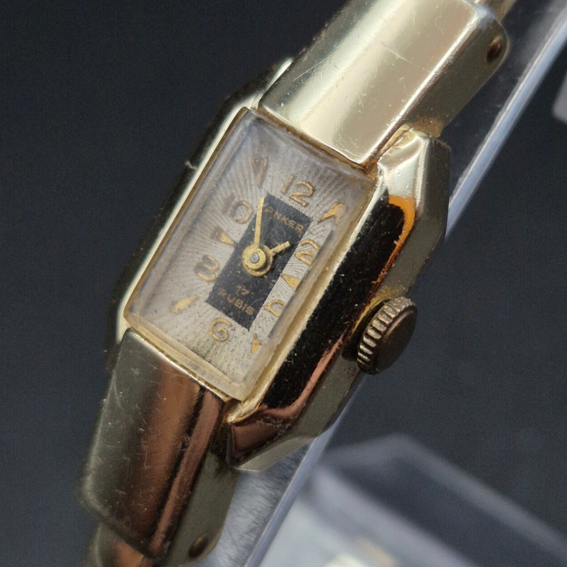 Diese elegante Anker Damen Uhr aus vergangenen Jahrzehnten besticht durch ihr rechteckiges Gehäuse in Goldoptik und ein mechanisches Uhrwerk mit 17 Rubis. Das feine Zifferblatt mit goldfarbenen Zahlen und Zeigern unterstreicht den klassischen Look. Mit ihrem festen Armreif ist diese Uhr ein stilvolles Accessoire für Sammlerinnen und Liebhaberinnen echter Vintage-Uhren.