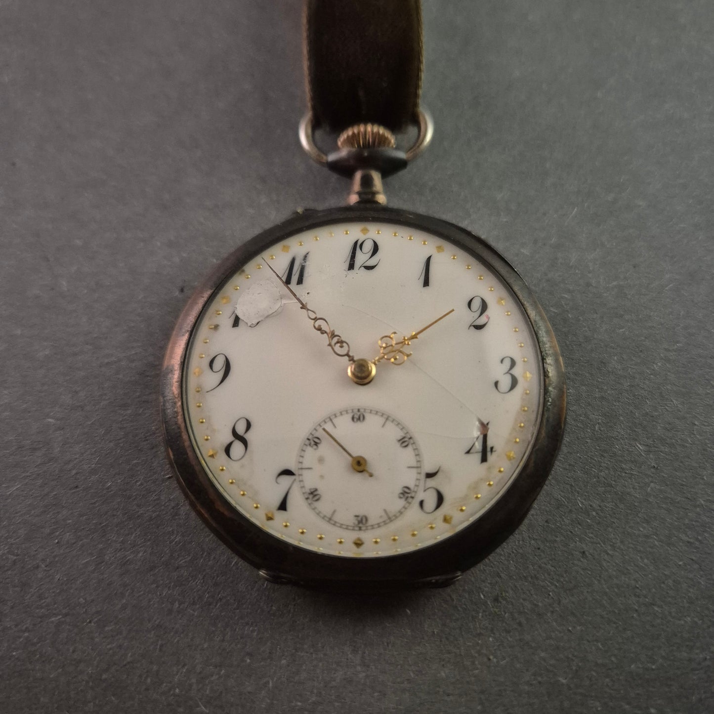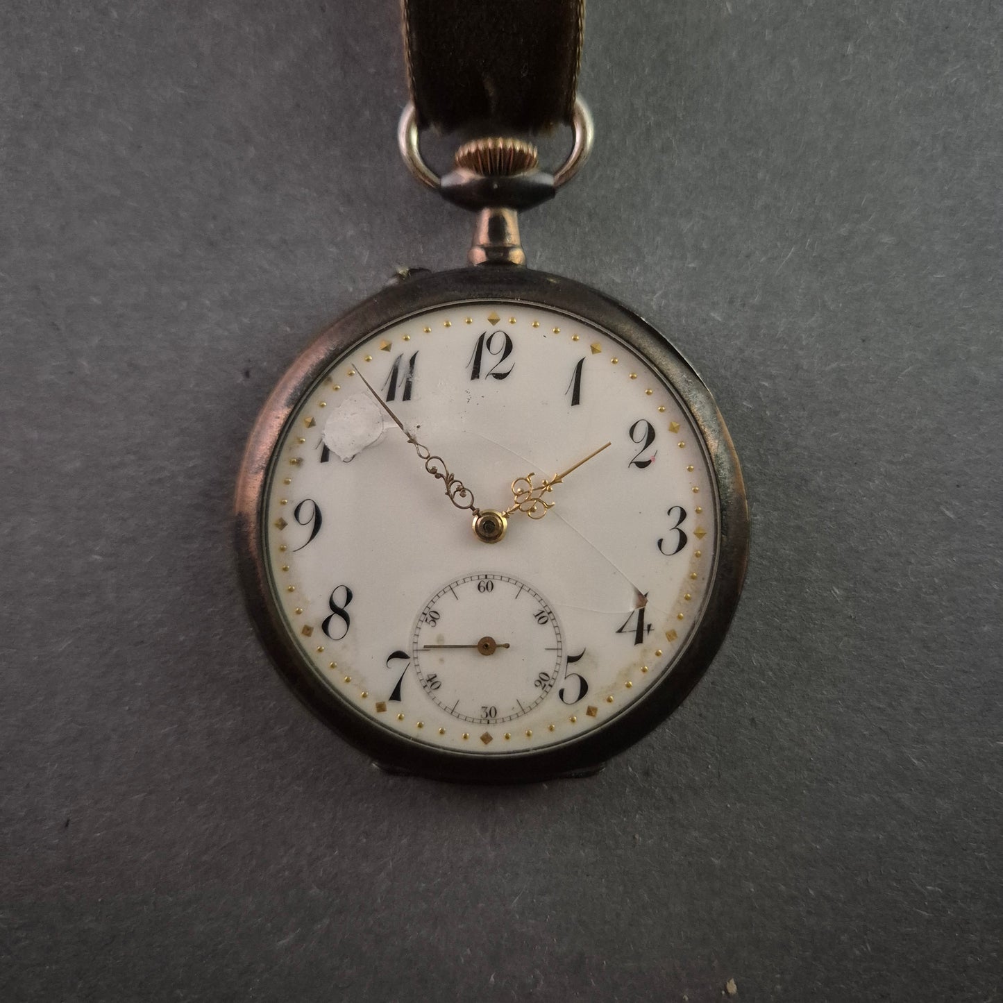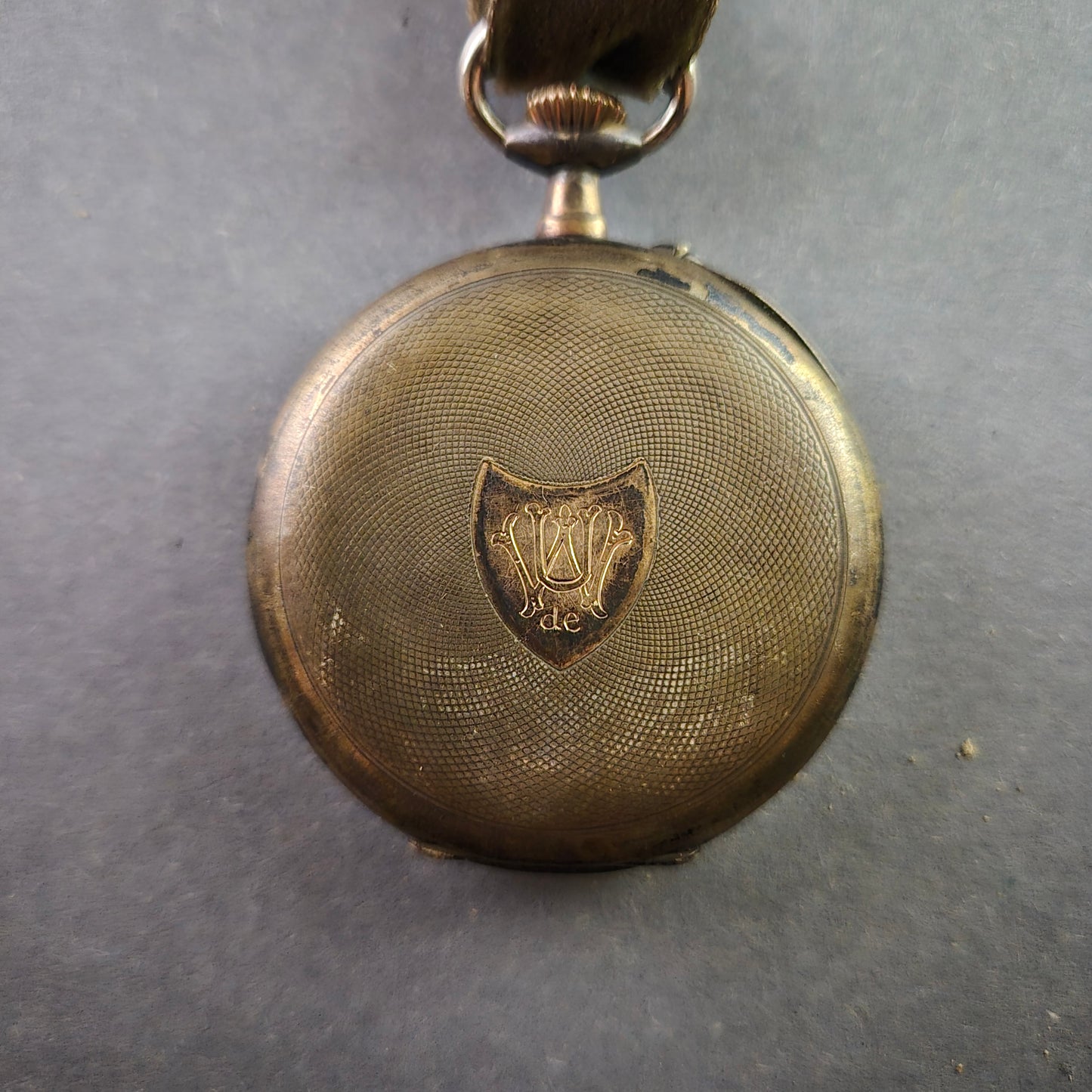 Diese elegante Taschenuhr der Marke De vereint klassischen Stil mit historischem Charme. Die Uhr besticht durch ihr detailliertes Gehäuse mit feiner Gravur auf der Rückseite und einem weißen Zifferblatt mit schwarzen arabischen Zahlen sowie goldenen Zeigern. Das Design wird durch ein dekoratives Wappen auf der Rückseite ergänzt. Ein echtes Sammlerstück für Liebhaber historischer Zeitmesser.