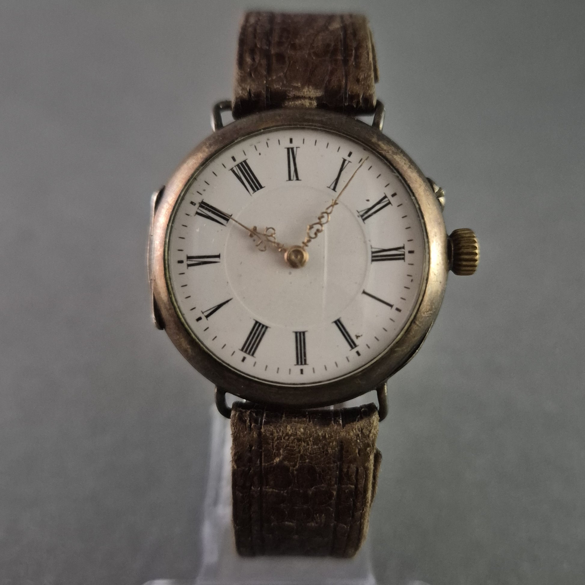 Diese charmante antike Armbanduhr strahlt pure Nostalgie aus. Das Messinggehäuse mit markanter Patina verleiht ihr einen einzigartigen Vintage-Charakter. Das weiße Zifferblatt mit römischen Ziffern und kunstvoll verzierten Zeigern unterstreicht den klassischen Stil. Abgerundet wird die Uhr durch ein gut erhaltenes braunes Lederarmband mit authentischer Patina. Ein wahres Sammlerstück für Liebhaber historischer Zeitmesser.