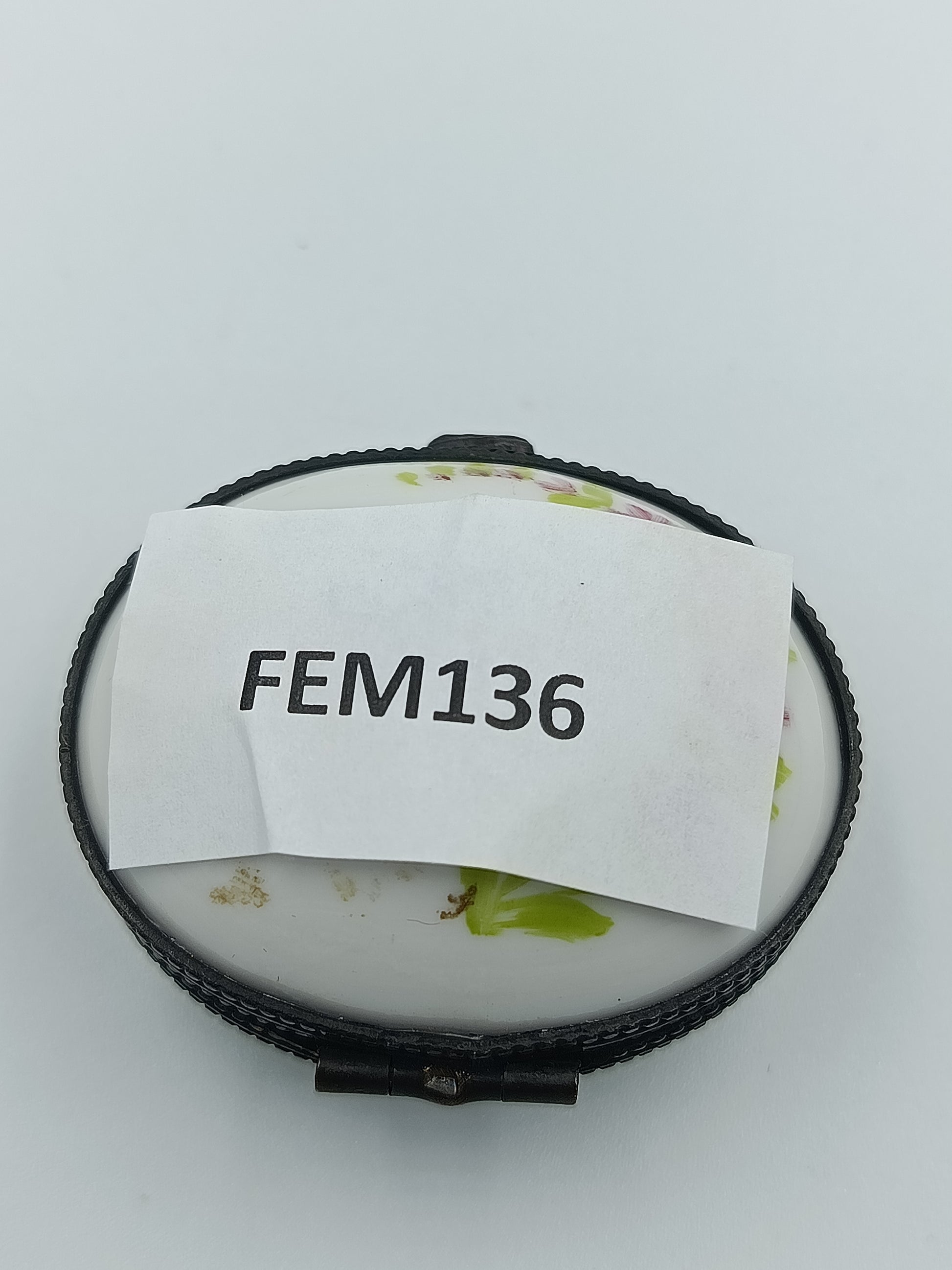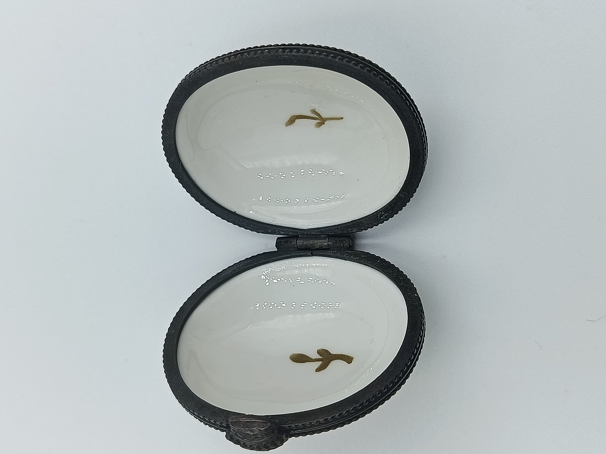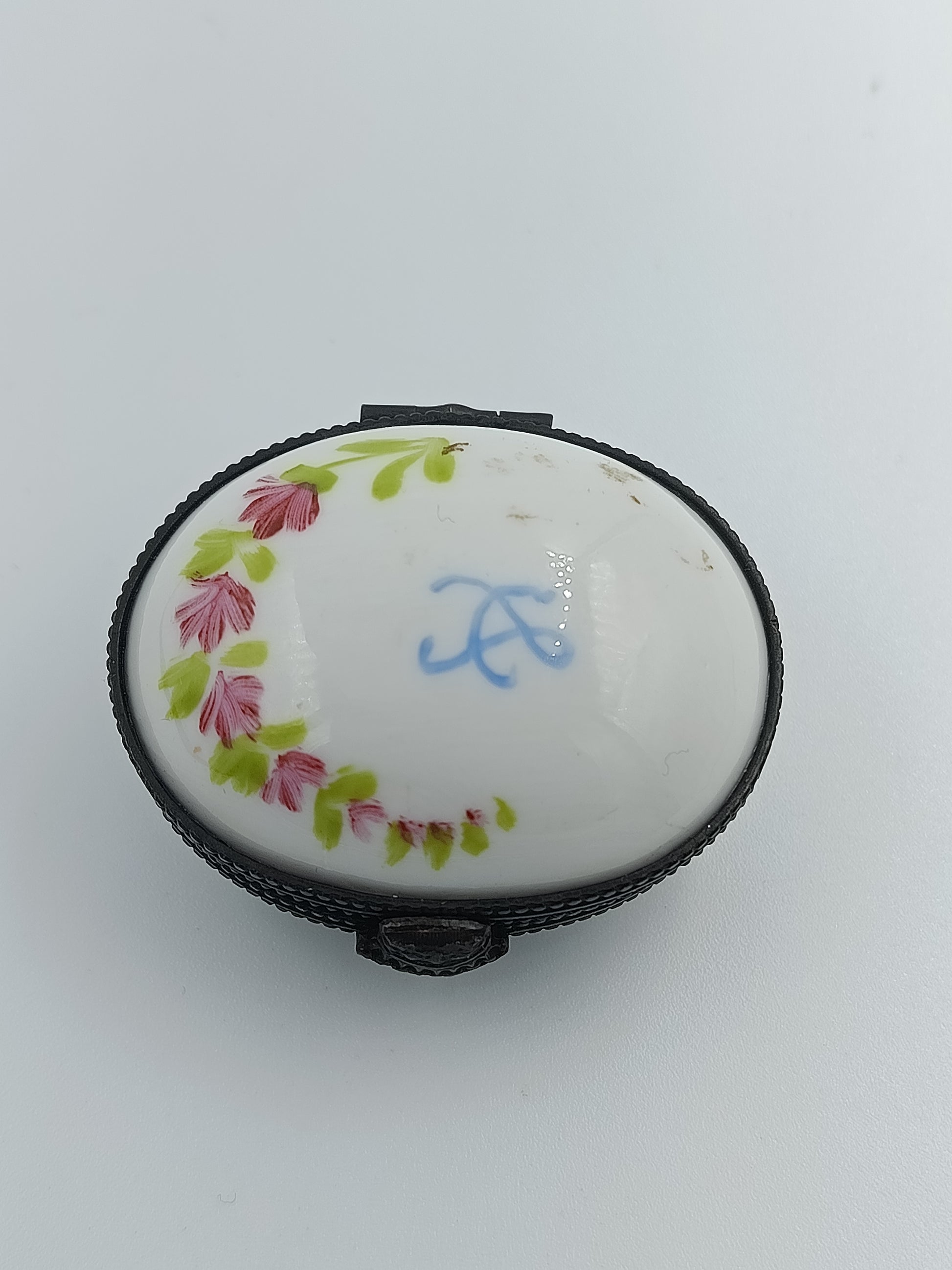Charmante, handbemalte Porzellandose mit einem detailreichen Blumendekor auf dem Deckel und feinem Blumenkranz mit Monogramm auf der Unterseite. Der dunkle Metallrahmen bildet einen schönen Kontrast zum weißen Porzellan und verleiht der Dose einen eleganten, antiken Charakter. Ideal als Schmuckdose oder für kleine Kostbarkeiten.