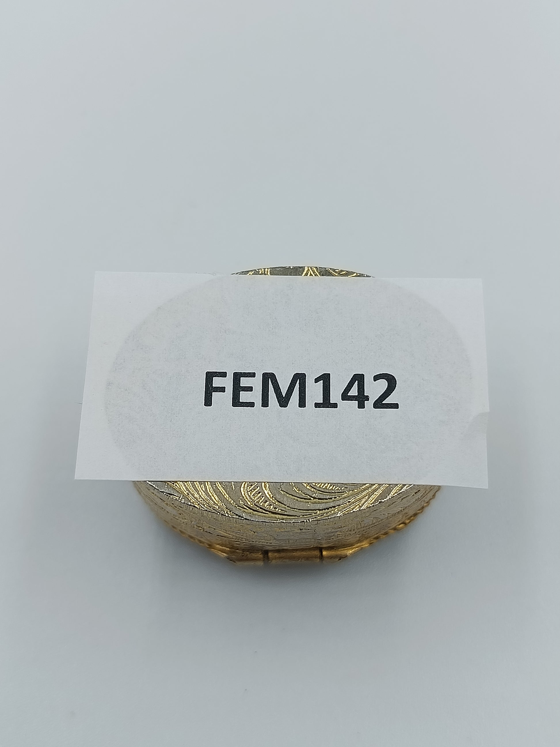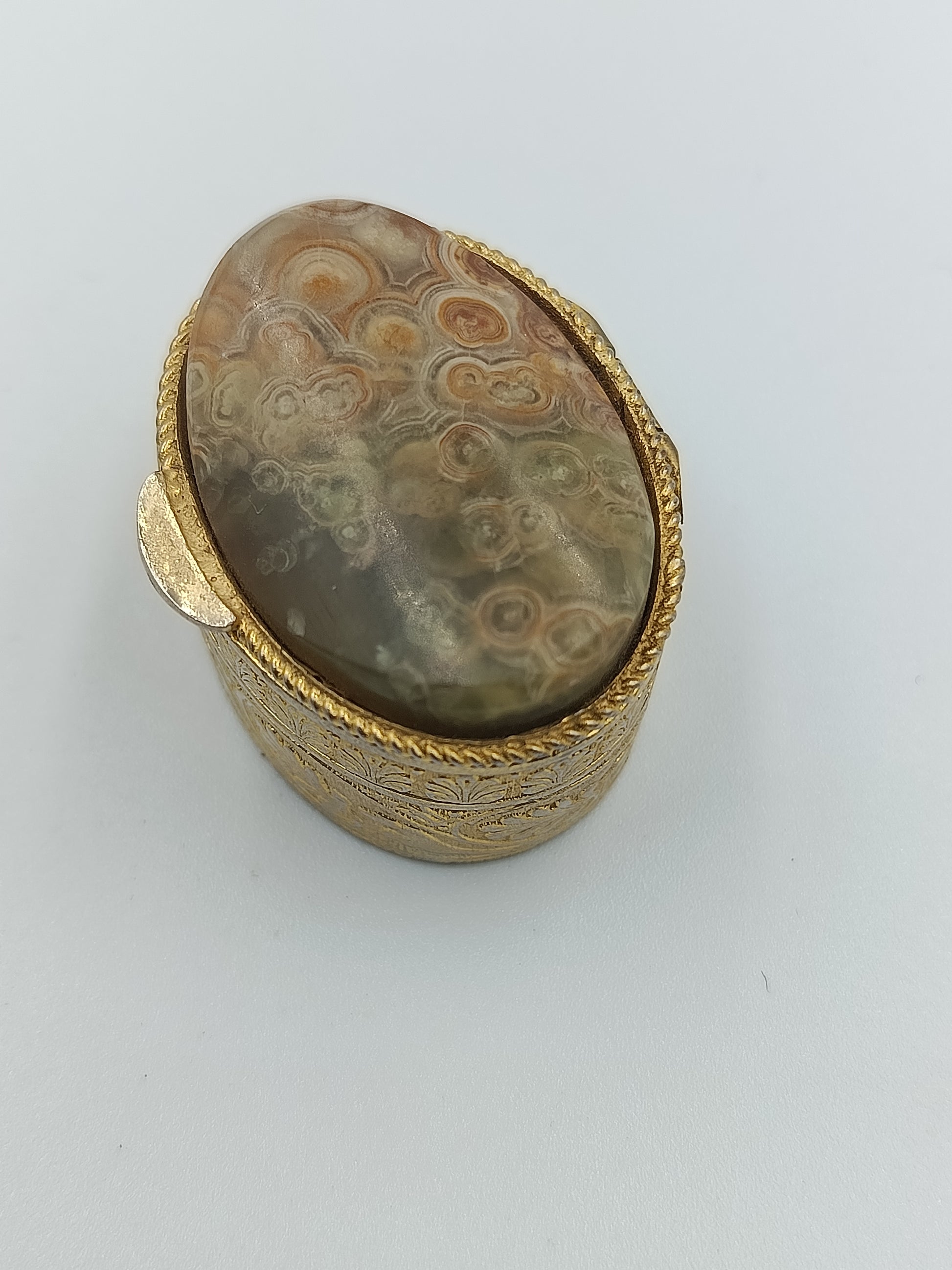 Elegante, kleine Pillendose mit einem wunderschön gemaserten Achatdeckel. Der goldfarbene Korpus ist fein graviert und verleiht der Dose einen edlen Vintage-Charakter. Ideal für Sammler oder als dekoratives Schmuckstück.