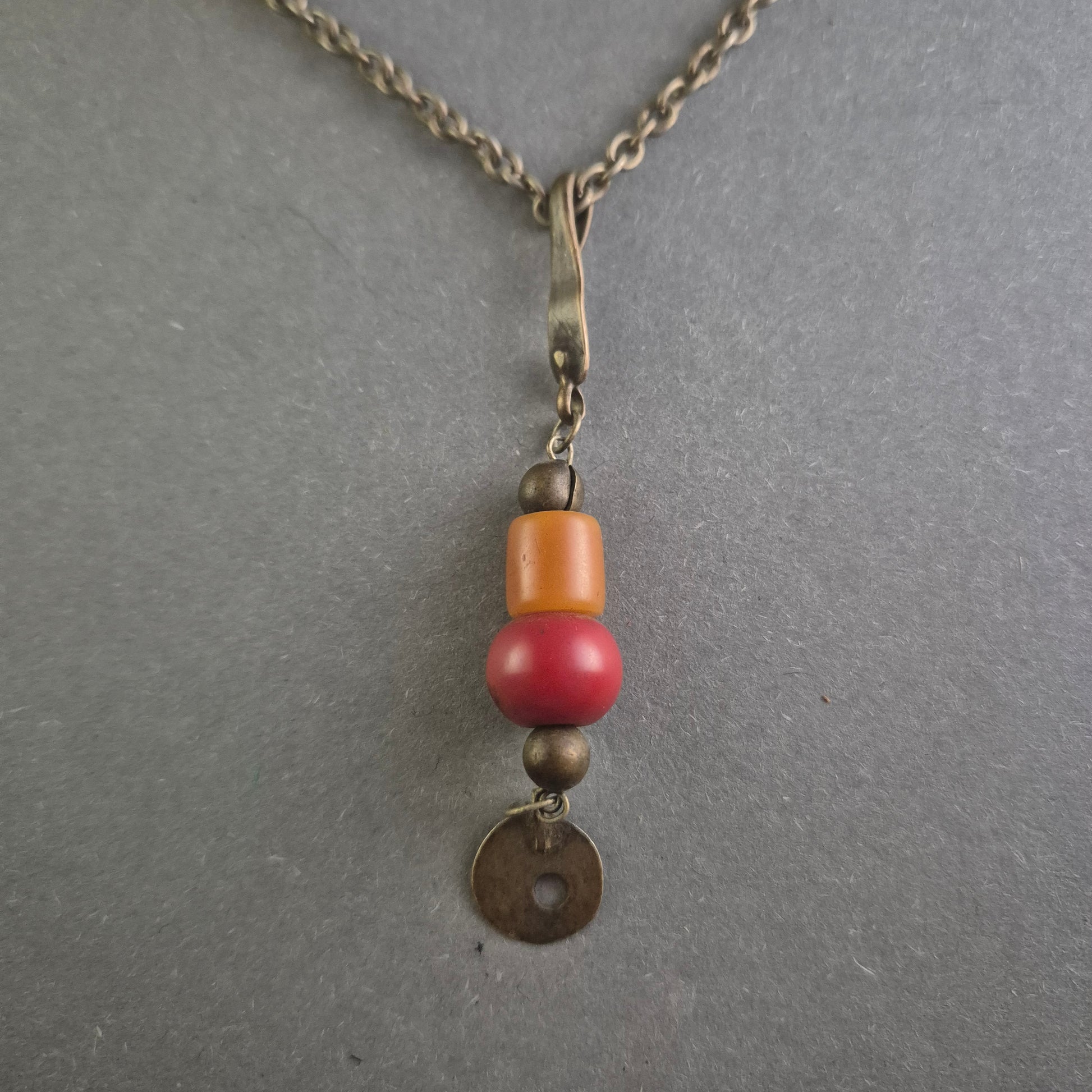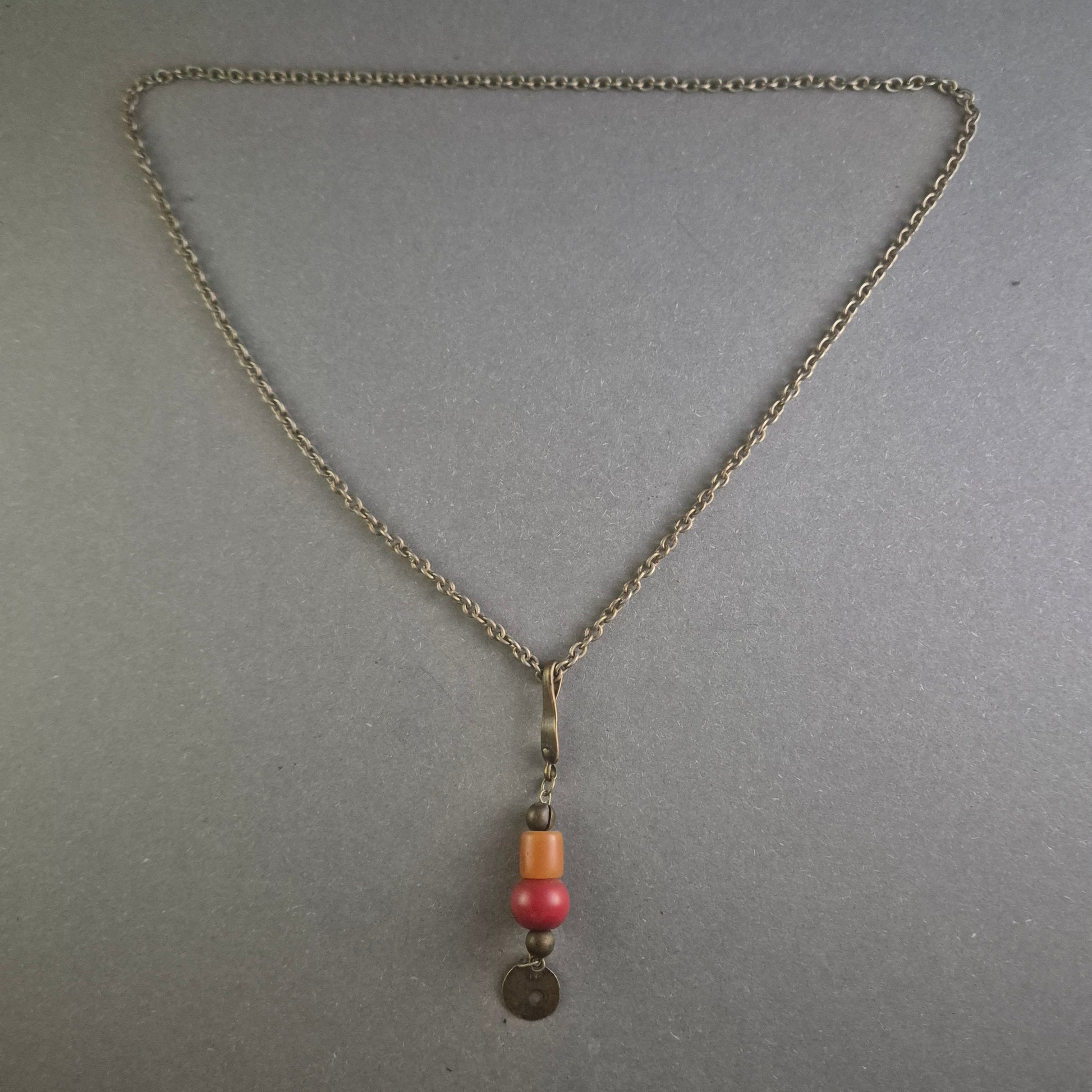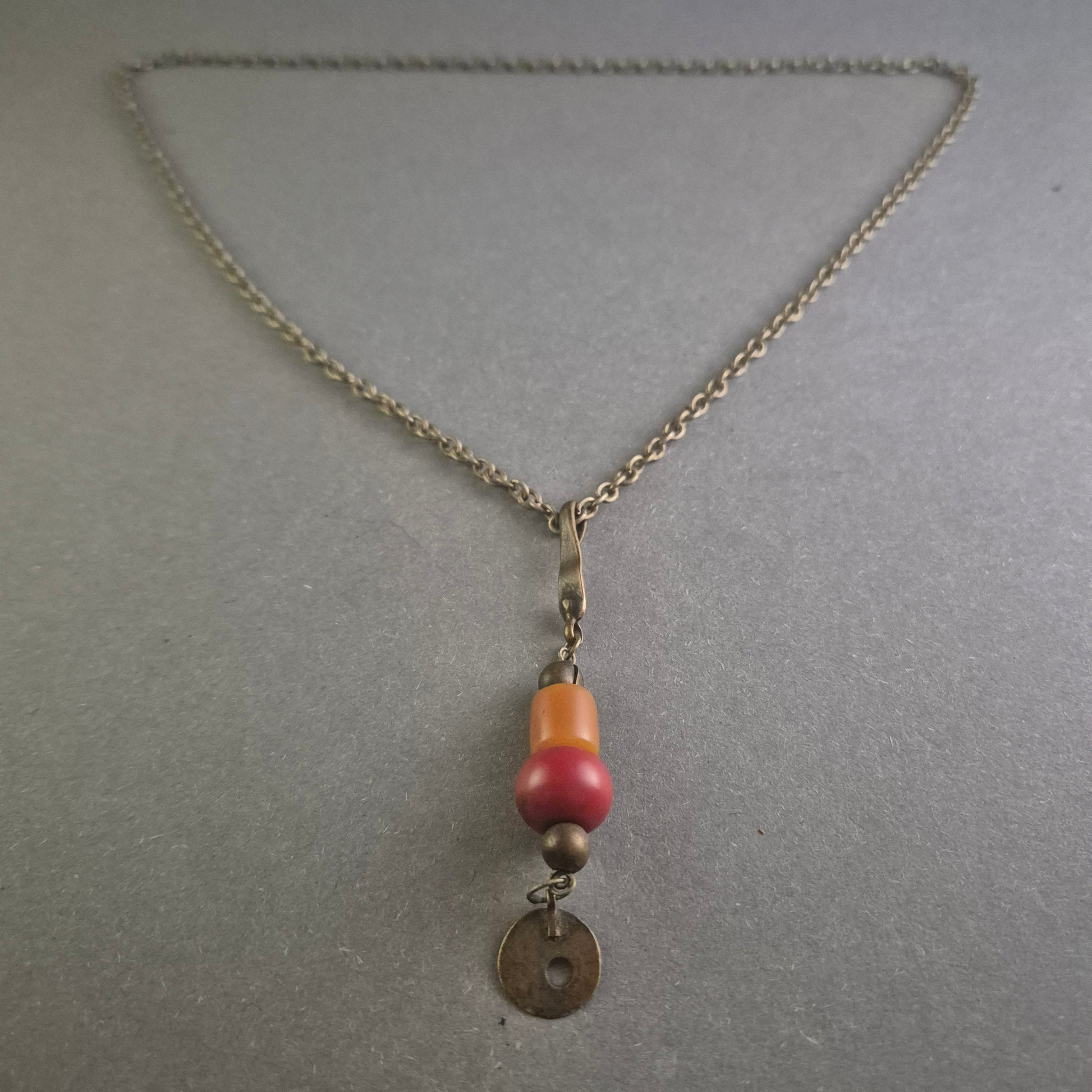 Diese einzigartige antike Halskette kombiniert eine filigrane Silberkette mit einem auffälligen Anhänger aus bunten Perlen und einer antiken Metallscheibe. Die warmen Rot- und Orangetöne des Anhängers verleihen der Kette einen charmanten Ethno-Look. Perfekt für Liebhaber von Vintage-Schmuck mit einem Hauch von Bohème-Charme.