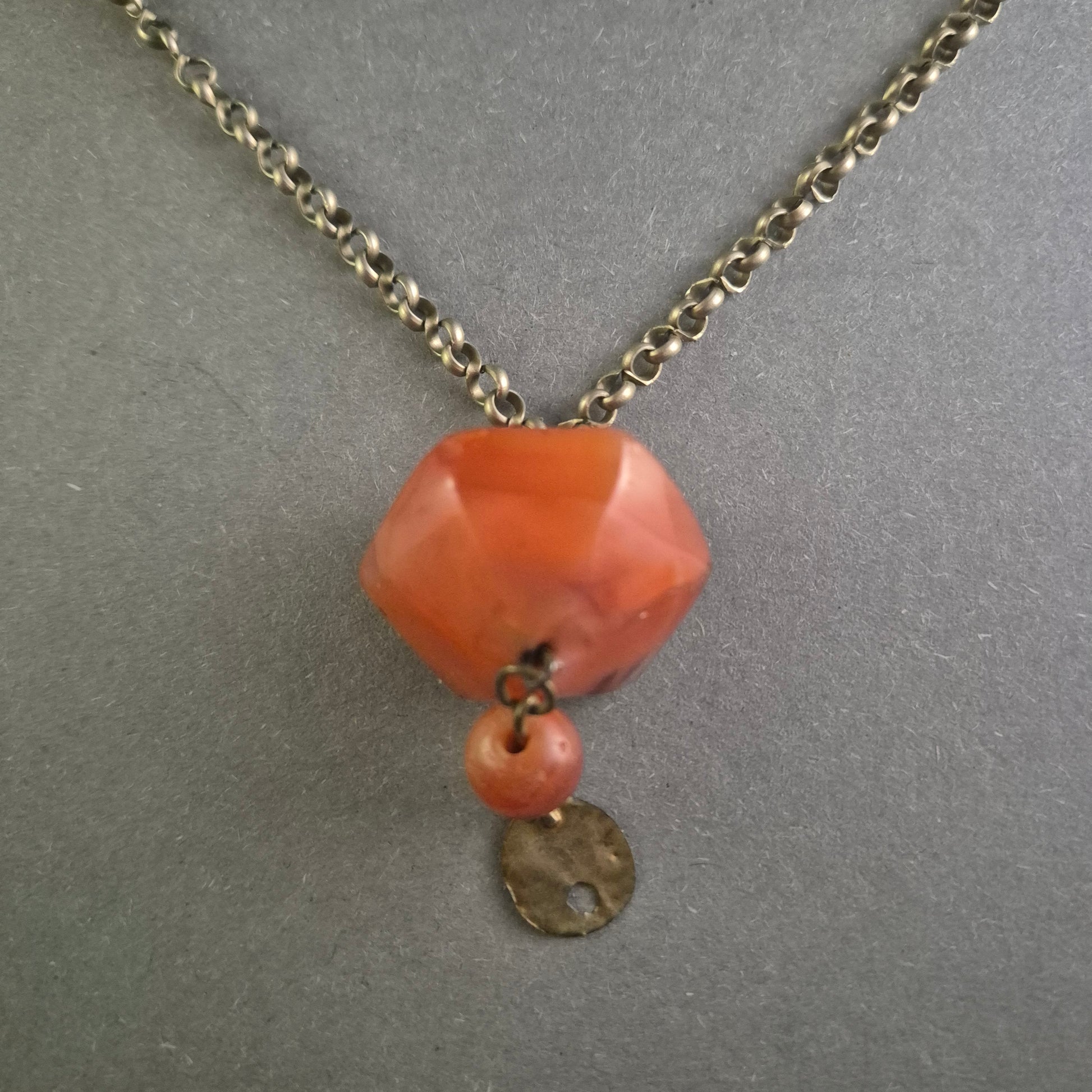 Diese außergewöhnliche antike Halskette vereint eine robuste Silberkette mit einem facettierten Karneol-Anhänger in warmem Orange. Das Design wird durch ein kleines Münzdetail abgerundet, das der Kette einen authentischen marokkanischen Charme verleiht. Das schlichte, aber dennoch auffällige Design macht diese Kette zu einem perfekten Accessoire für Liebhaber von Vintage-Schmuck und orientalischen Akzenten.
