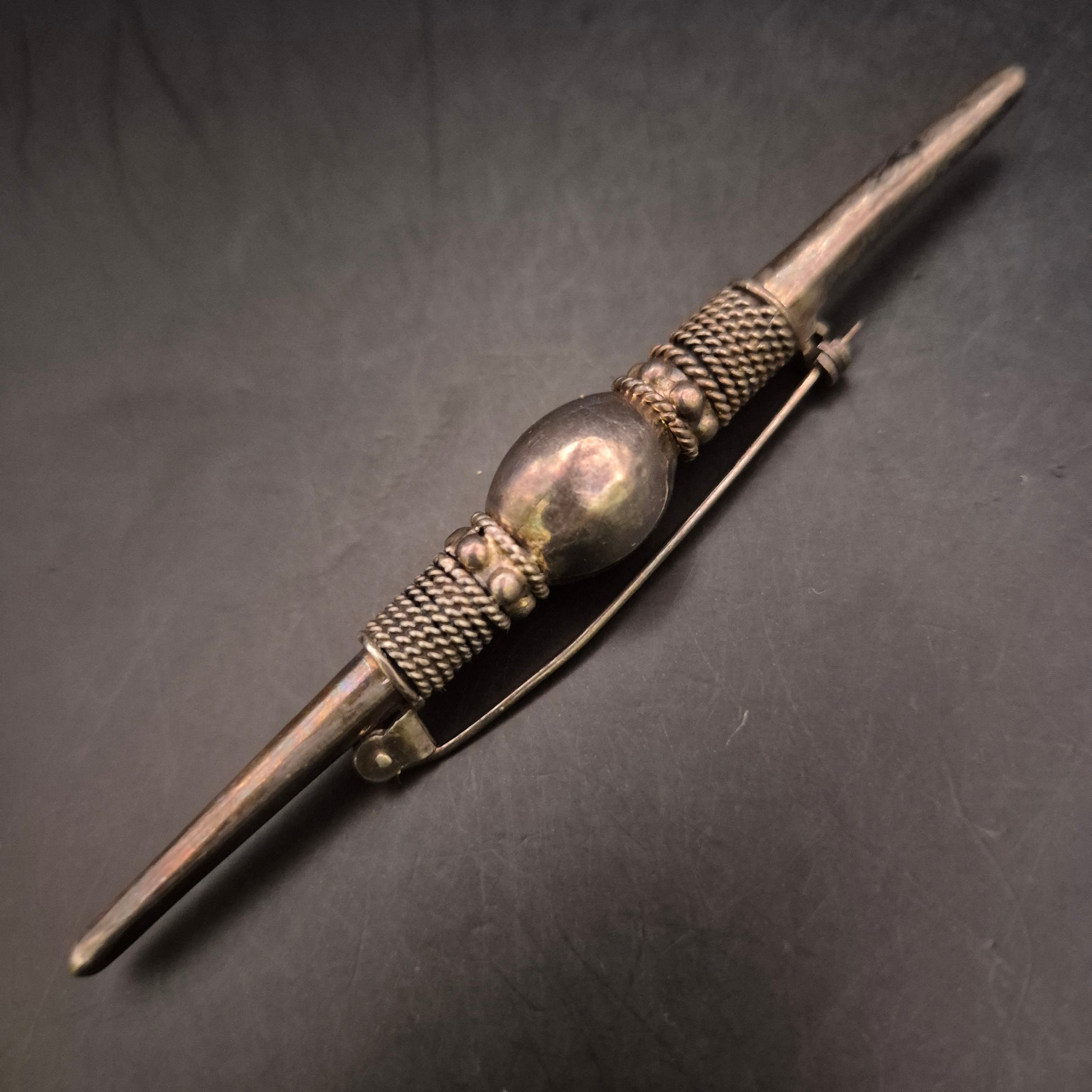 Diese dekorative Stabbrosche besticht durch ihr filigranes Drahtmuster und die zentrale, leicht ovale Kugel, die von feinen, gedrehten Drahtspiralen eingerahmt wird. Die geschwärzte Metalloberfläche verleiht dem Schmuckstück einen dezenten Vintage-Charakter. Dank des soliden Nadelverschlusses sitzt die Brosche sicher an Bluse, Mantel oder Schal und setzt elegante Akzente.