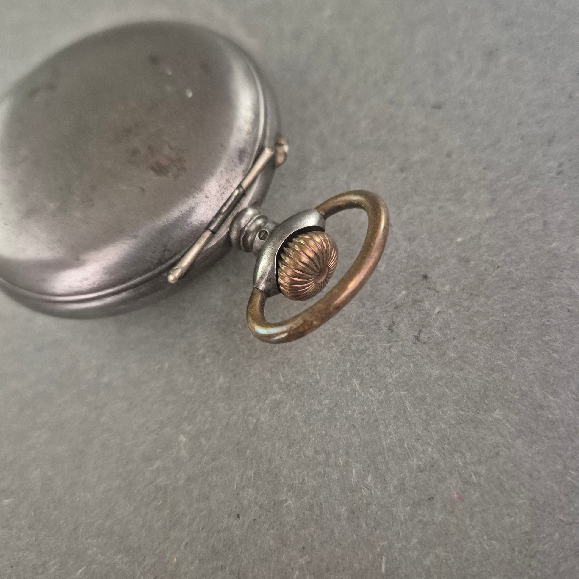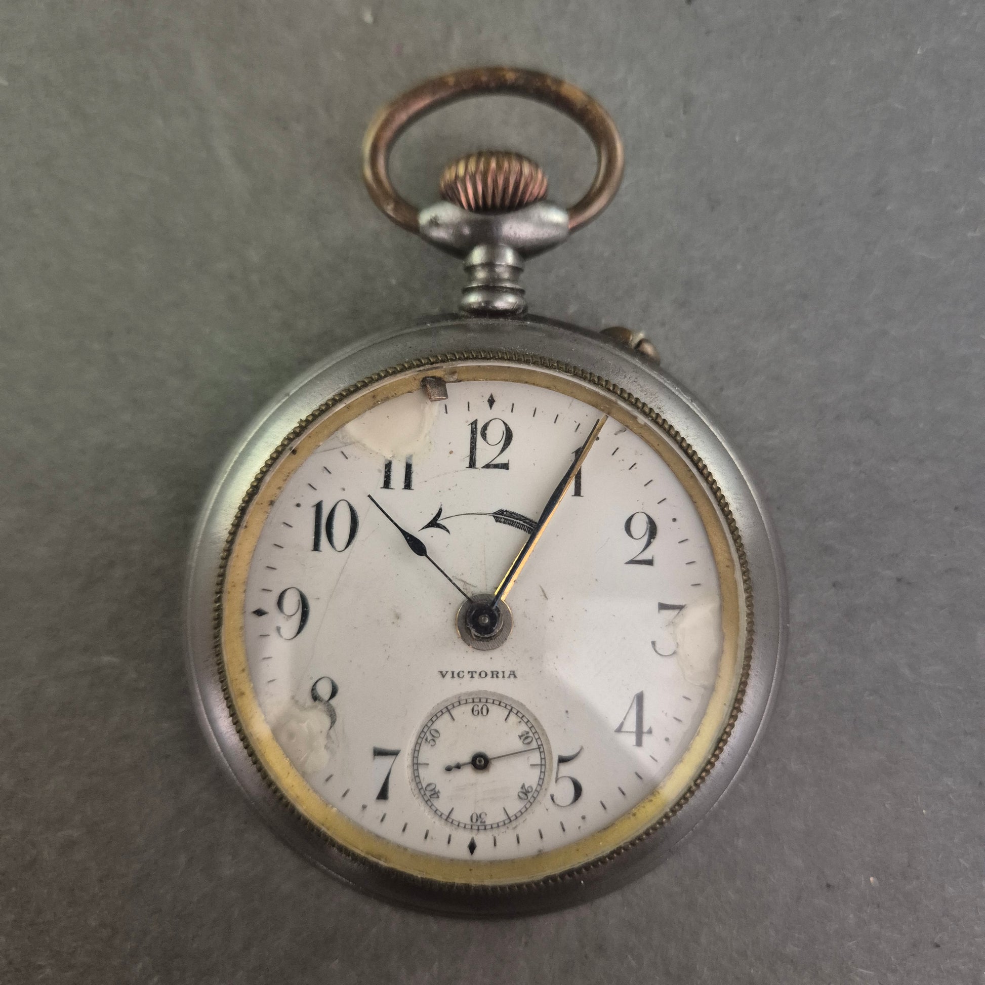 Diese antike Taschenuhr der Marke Victoria beeindruckt mit ihrem klassischen Charme und der seltenen integrierten Weckfunktion („Still/Weckt“). Das Zifferblatt zeigt deutliche Alters- und Gebrauchsspuren, die ihren authentischen Vintage-Charakter unterstreichen. Die Uhr verfügt über ein robustes Metallgehäuse und ein mechanisches Werk mit Handaufzug. Patentnummern auf der Rückseite belegen ihre deutsche Herkunft und technische Raffinesse um die Jahrhundertwende.