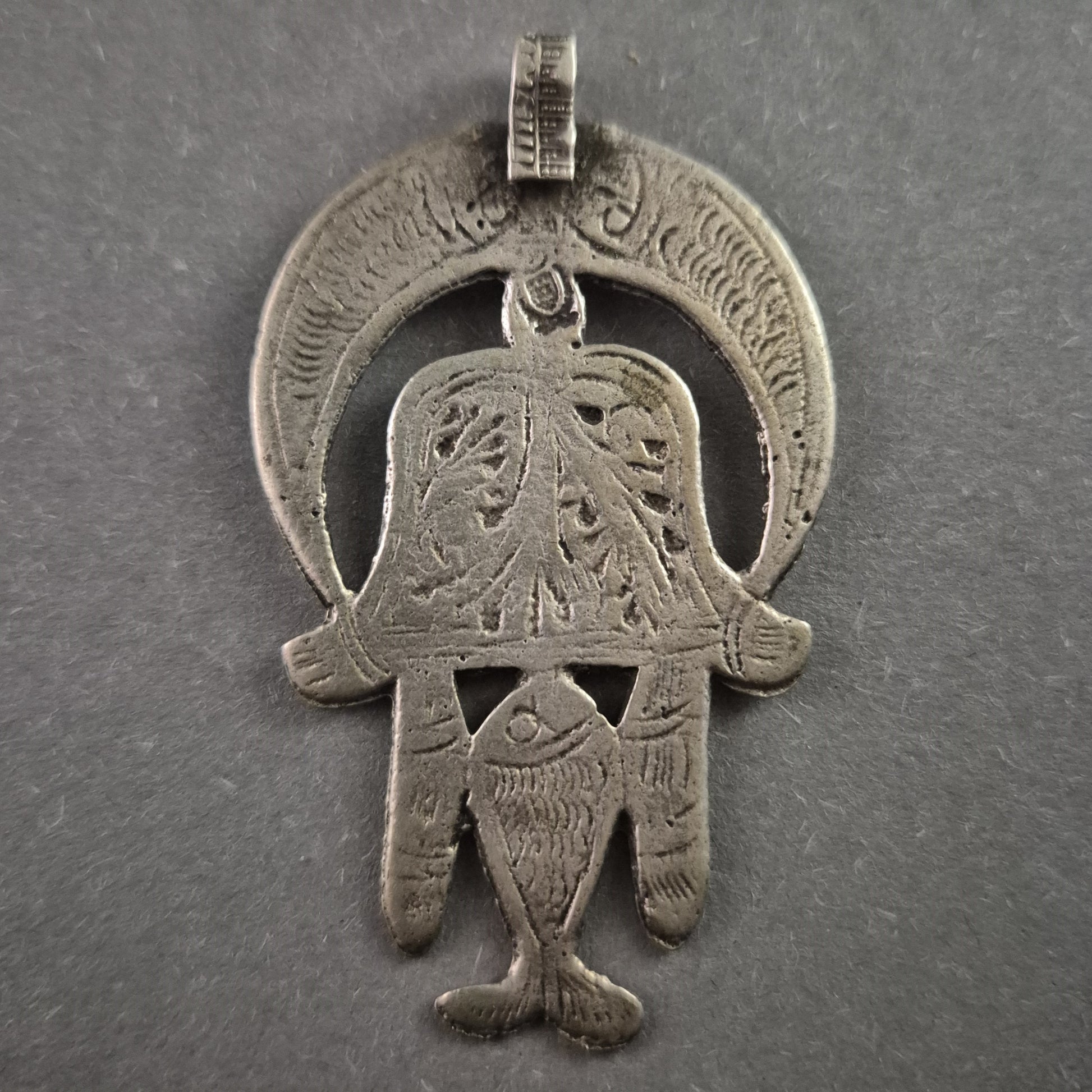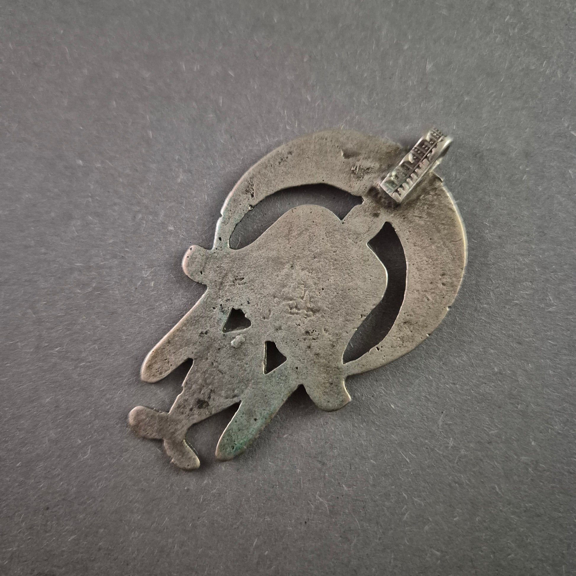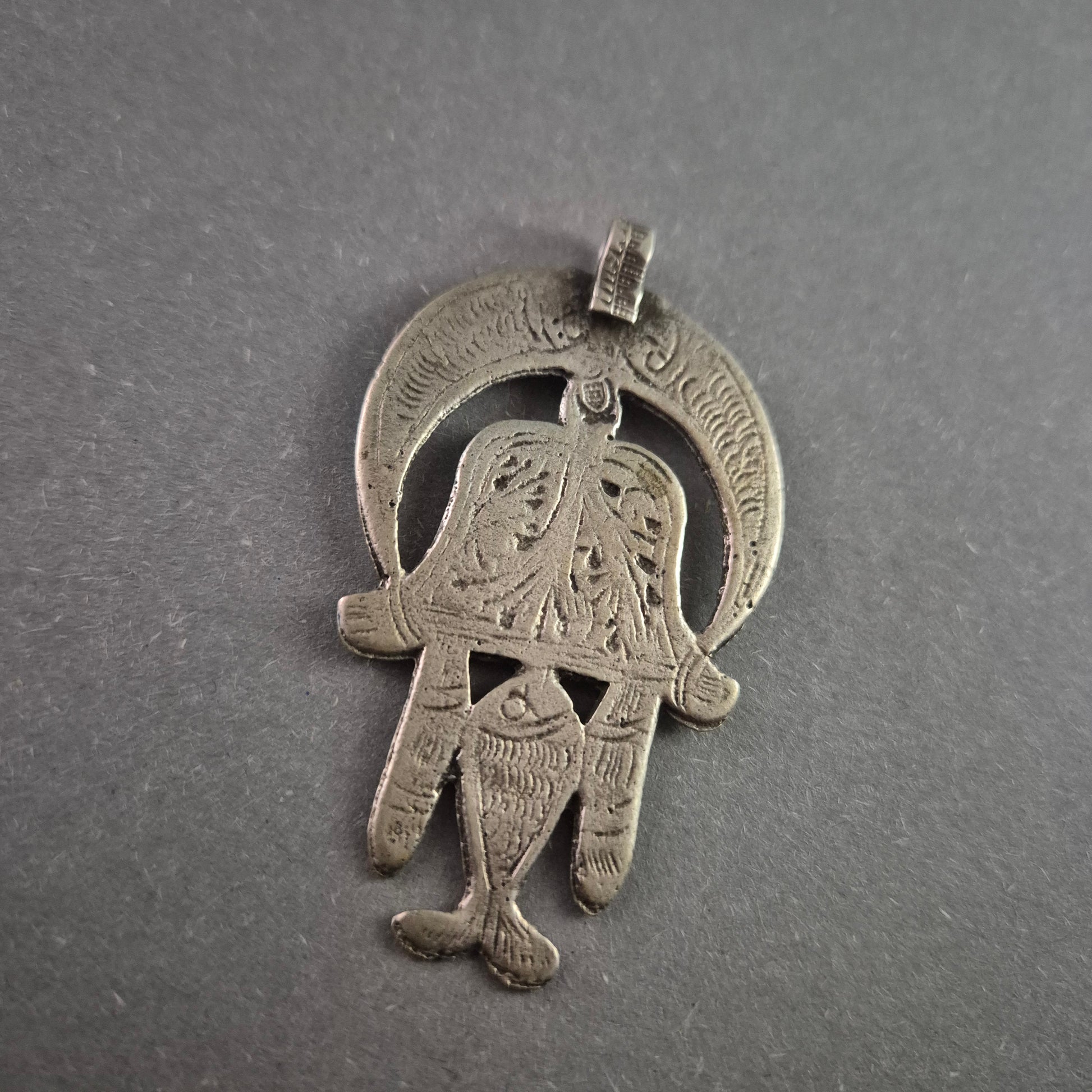 Dieser antike Hamsa-Anhänger besticht durch sein kunstvolles Design mit filigranen Gravuren und symbolischen Motiven. Die Darstellung der schützenden Hand, kombiniert mit traditionellen Ornamenten, verleiht dem Schmuckstück eine tiefe spirituelle Bedeutung. Ein seltenes Sammlerstück für Liebhaber historischer oder esoterischer Symbole.