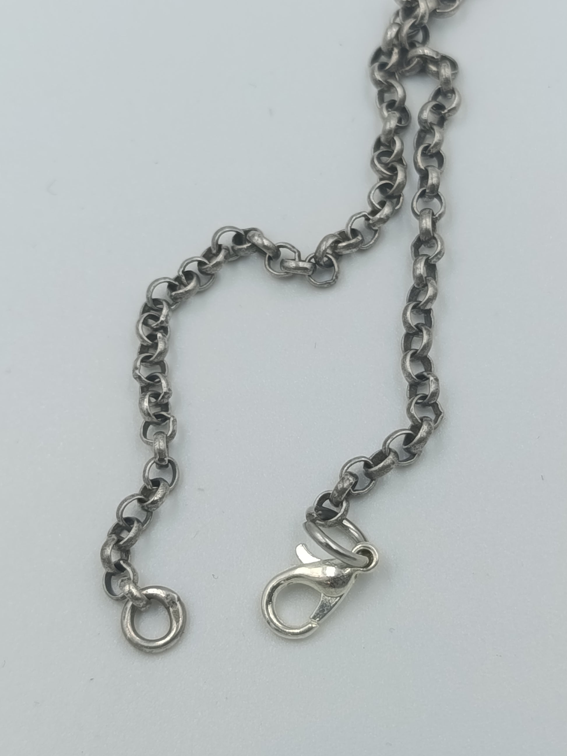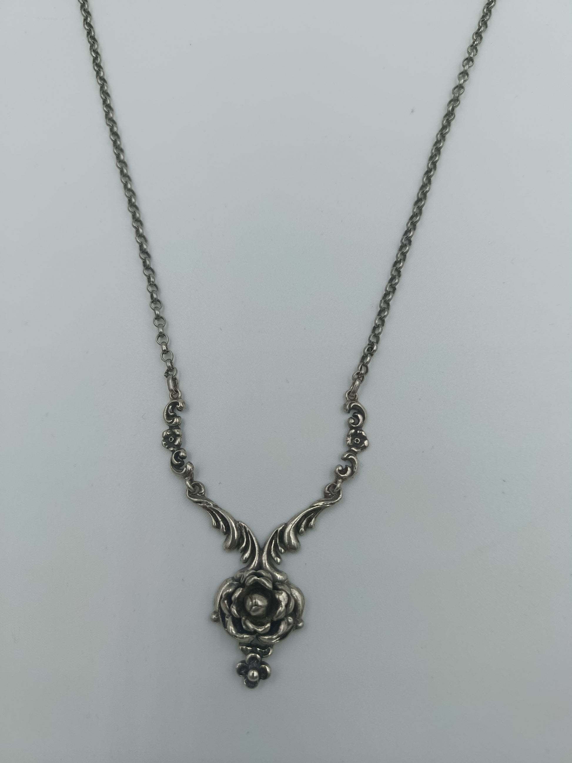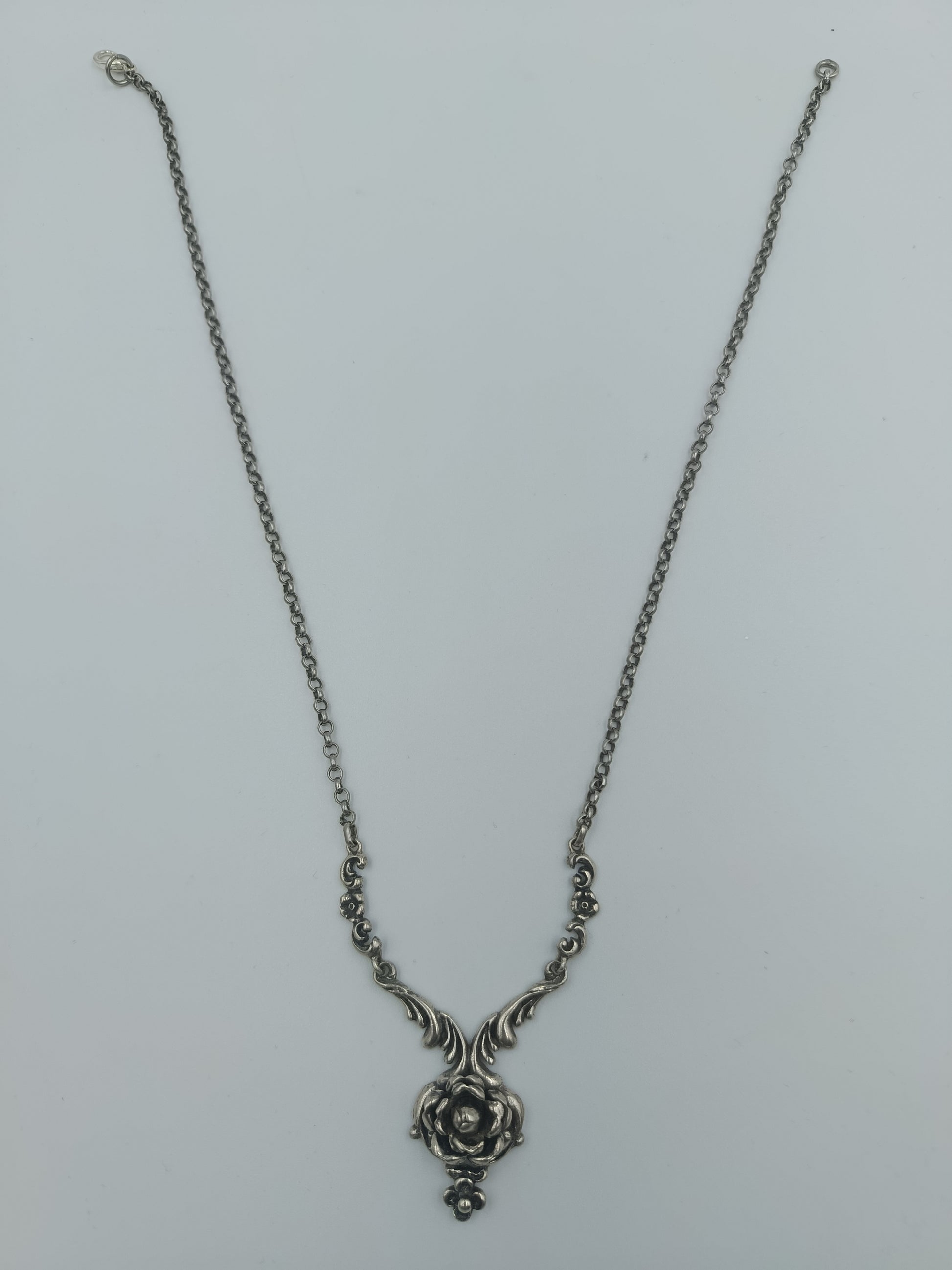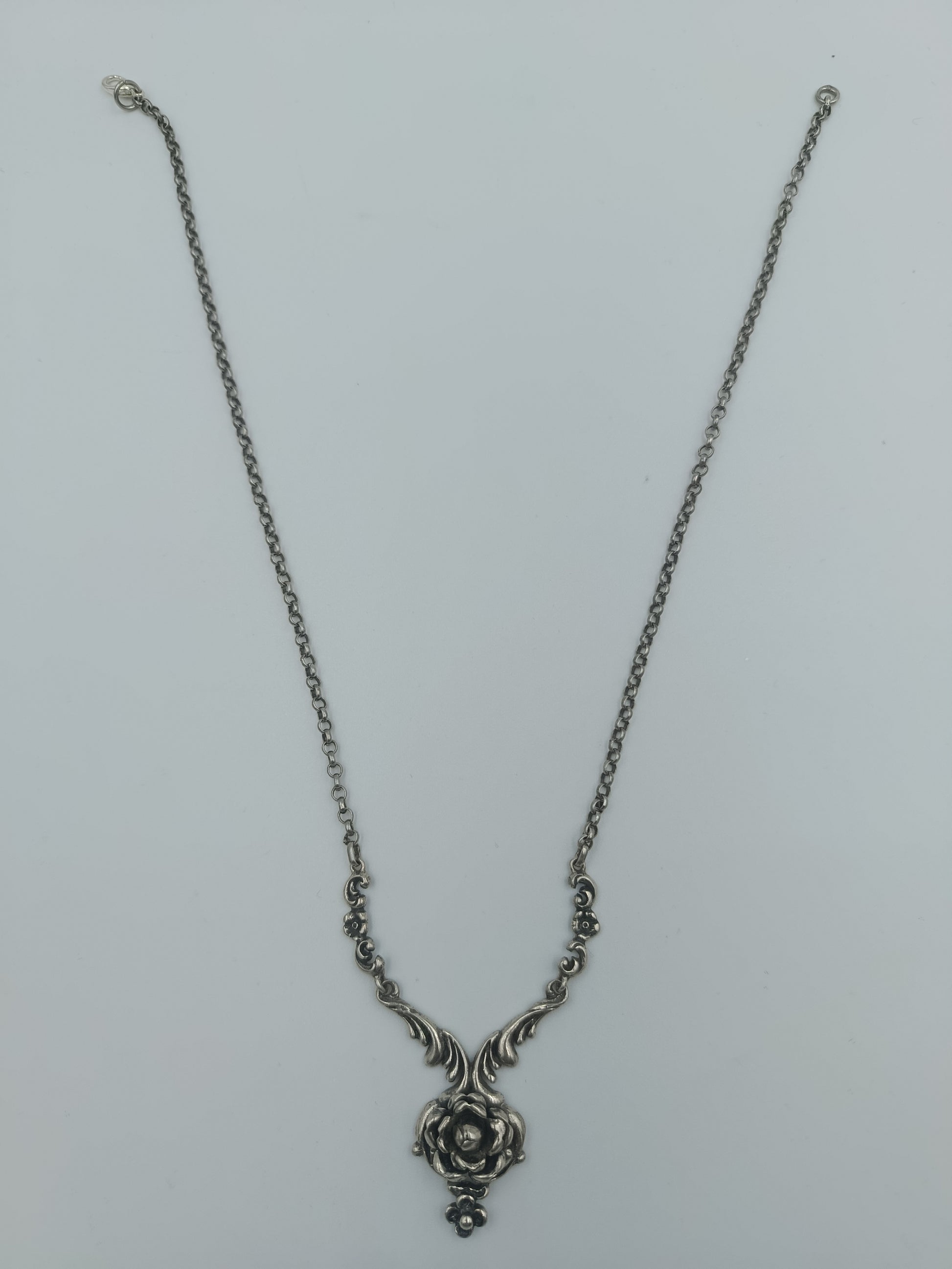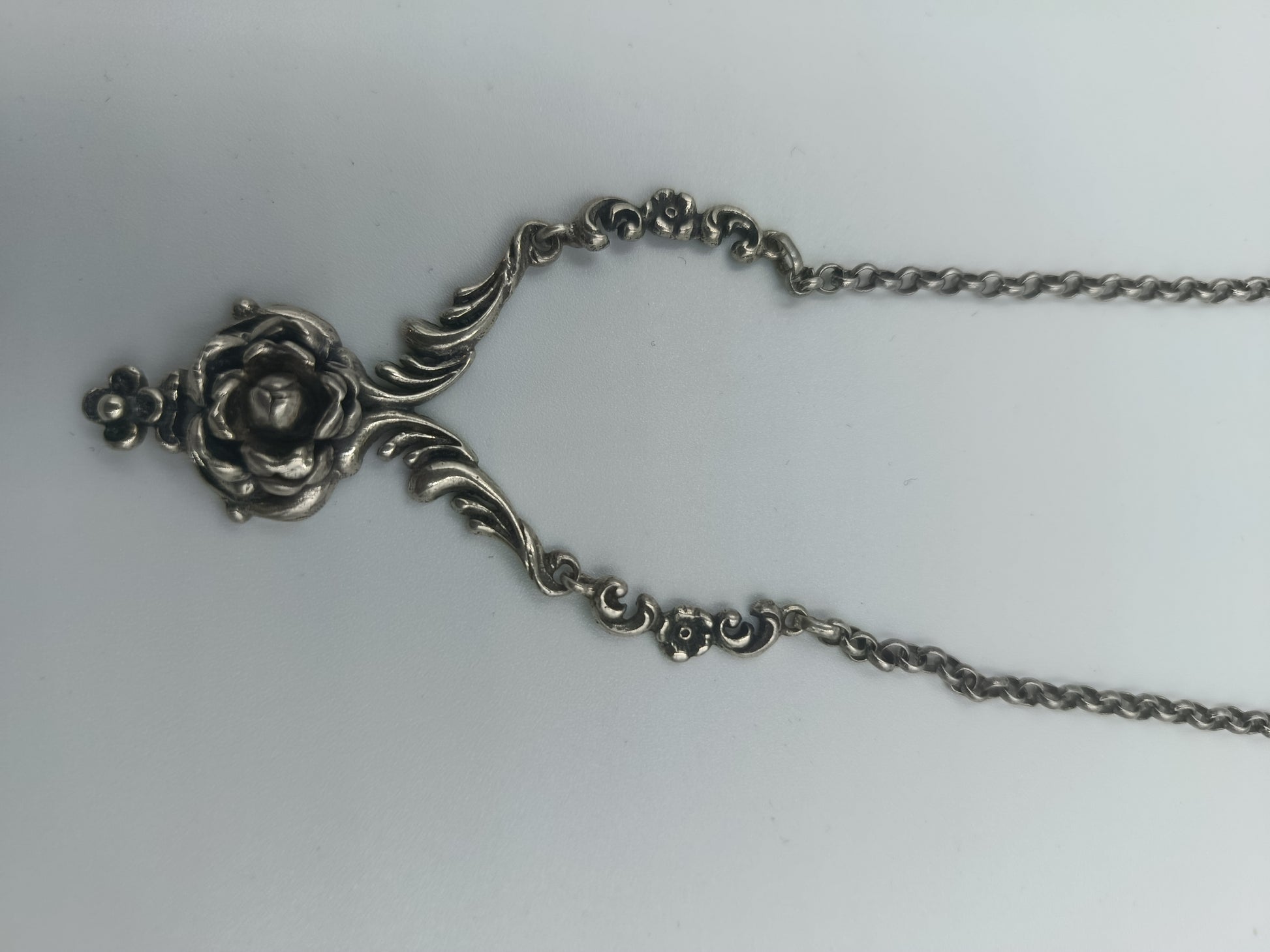 Dieses kunstvolle Collier aus echtem 925er Silber präsentiert ein detailreich gearbeitetes Mittelstück in Form einer stilisierten Rose. Die floralen Verzierungen und die geschwungene Formgebung verleihen dem Schmuckstück einen romantischen, beinahe barocken Charakter. Ein außergewöhnliches Accessoire für Liebhaberinnen von antik inspiriertem Schmuck.