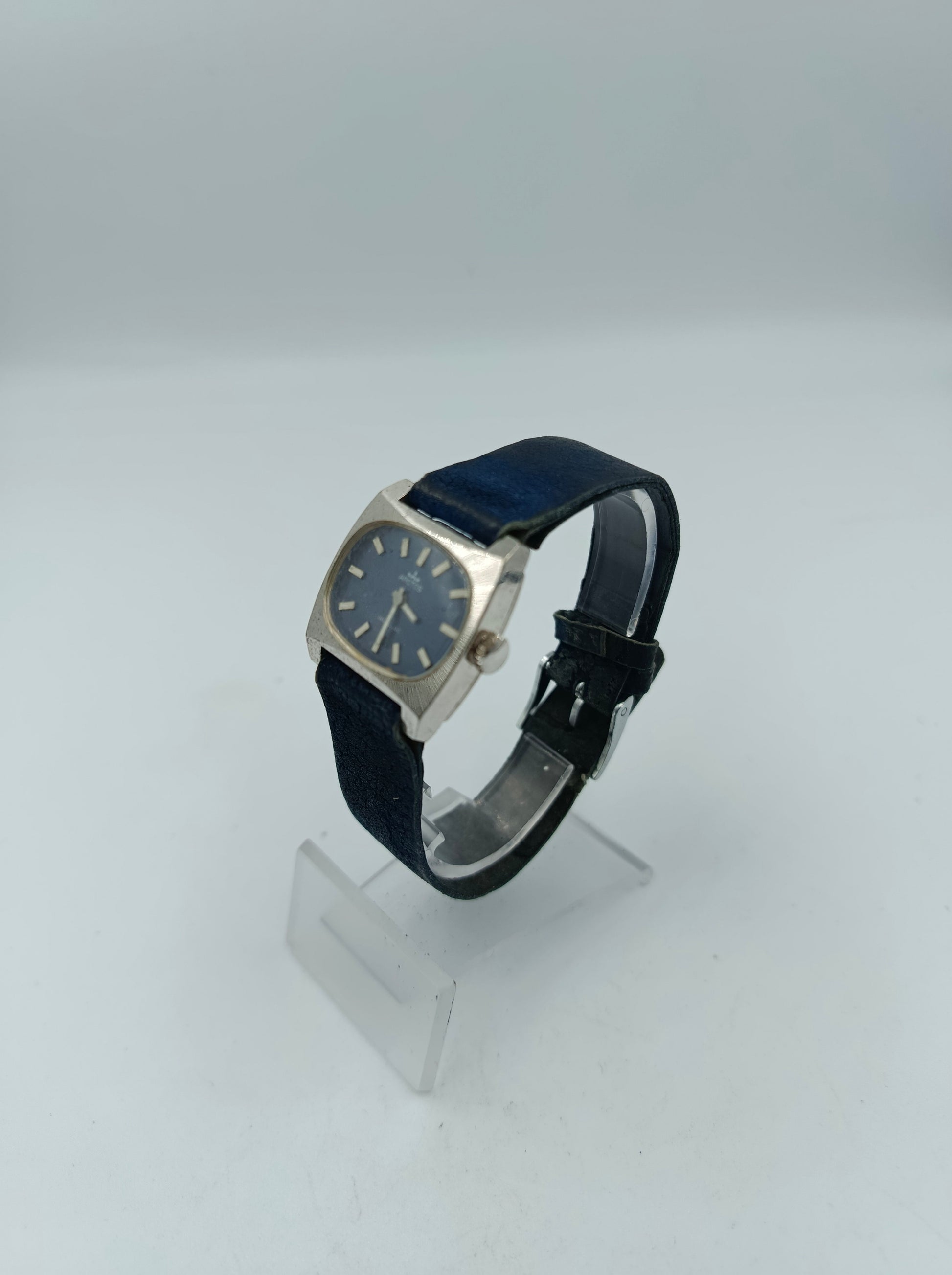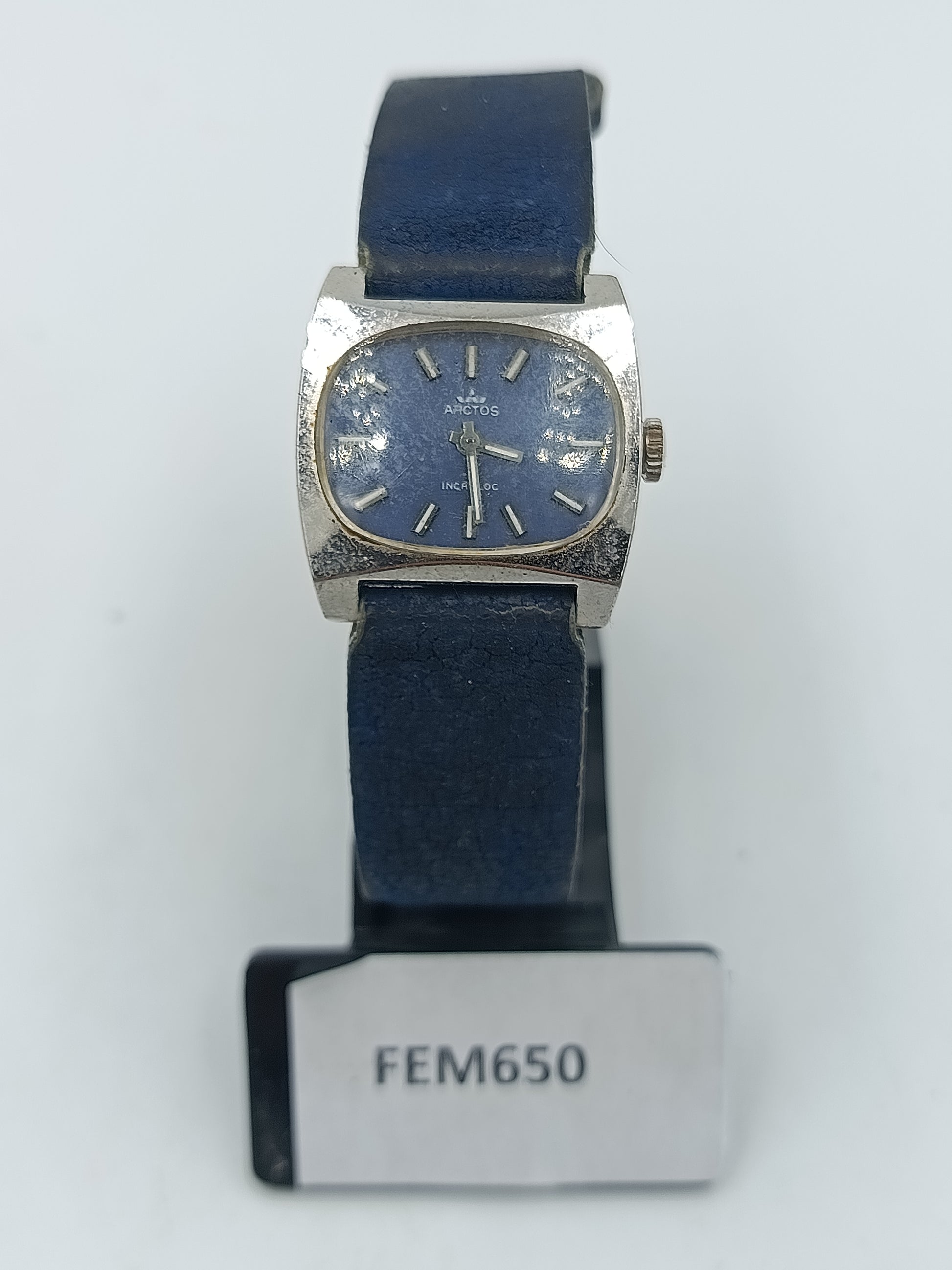 Vintage Damenarmbanduhr der Marke Arctos mit elegantem, rechteckigem Gehäuse und blauem Zifferblatt. Das klassische Design mit silbernem Gehäuse und blauem Lederarmband macht sie zu einem schönen Sammlerstück oder Ersatzteilspender. Die Uhr ist defekt und benötigt eine Überholung.
