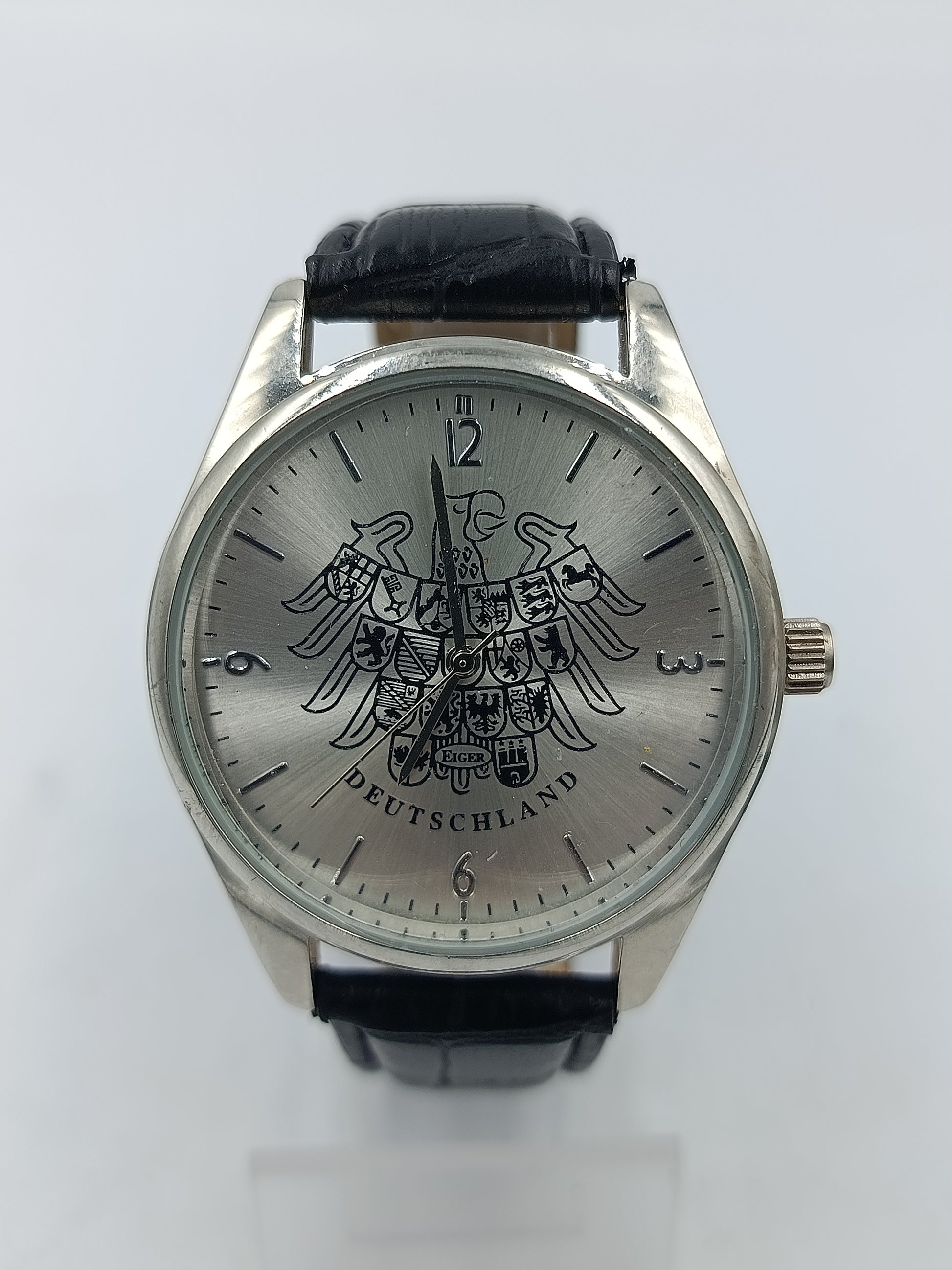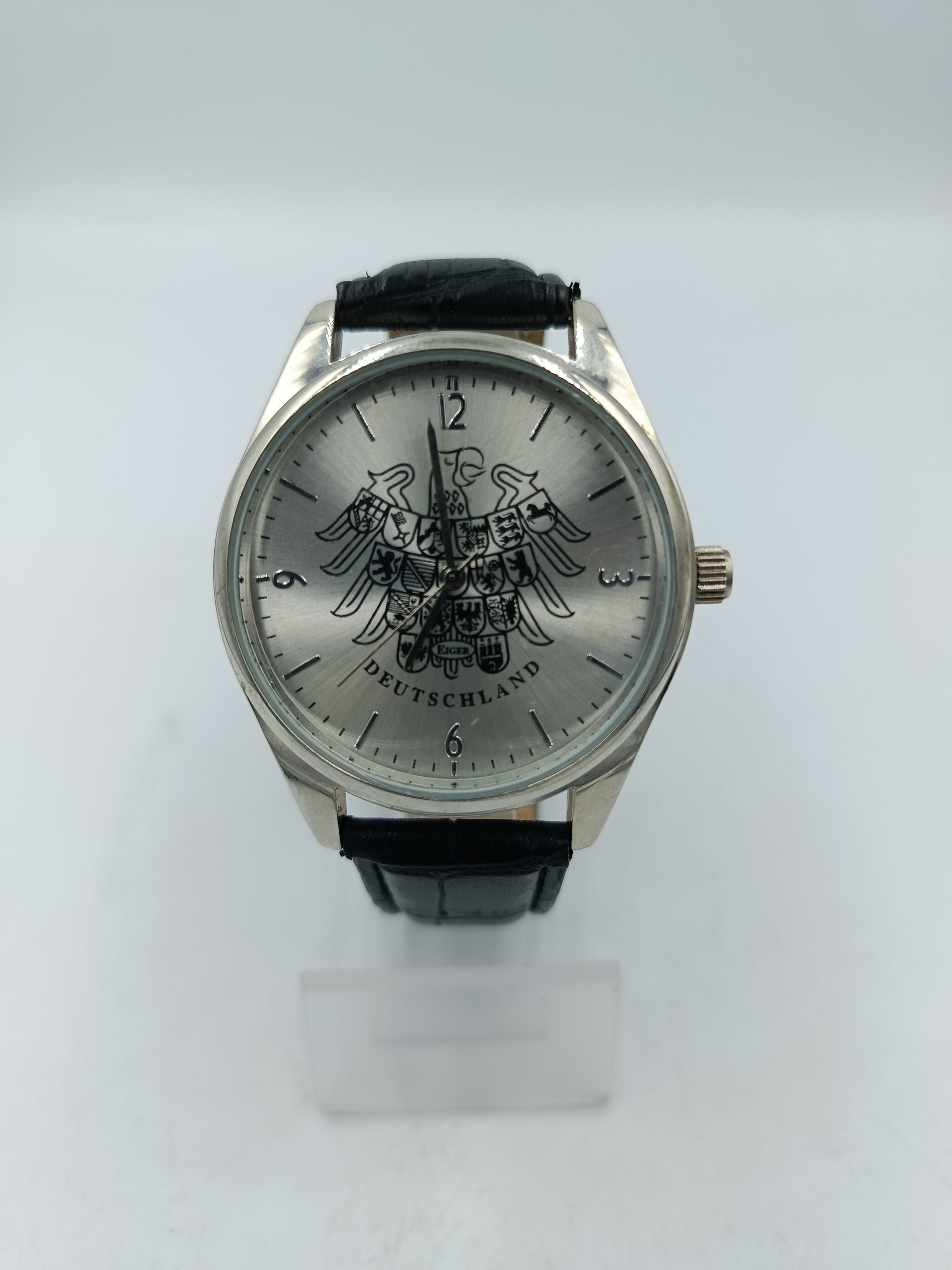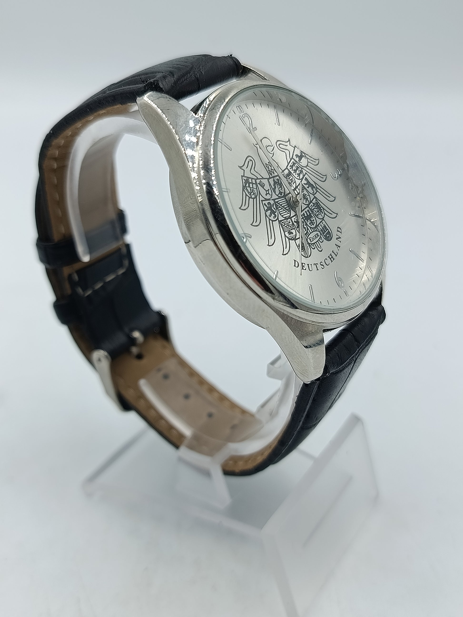 Klassische Herrenuhr im silbernen Design mit großem Deutschland-Adler auf dem Zifferblatt. Das schwarze Kunstlederarmband sorgt für einen eleganten Look, während das klare Zifferblatt für gute Ablesbarkeit sorgt. Ideal für Sammler, Patrioten oder als dekorative Alltagsuhr.