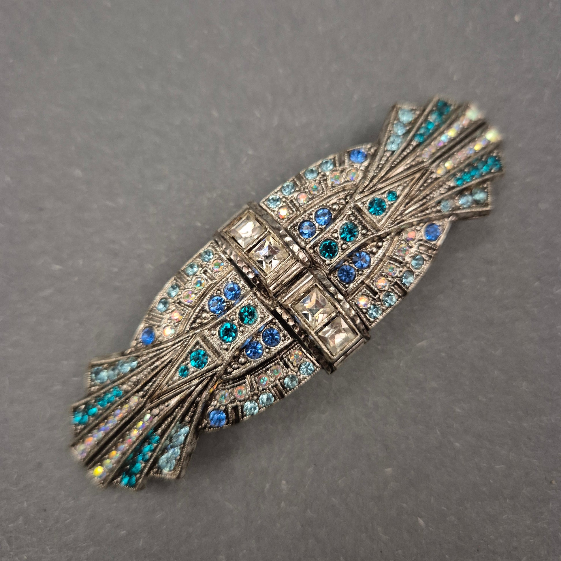 Diese aufwendig gearbeitete Brosche im Art-Déco-Stil beeindruckt durch ihr detailreiches Design und die Vielzahl schimmernder Strasssteine in Blautönen. Die Kombination aus eckigen und runden Steinen verleiht der Brosche Tiefe und Glanz. Sie eignet sich hervorragend als Blickfang an Blusen, Mänteln oder Schals – ideal für Liebhaberinnen von Vintage-Schmuck und funkelnden Accessoires.