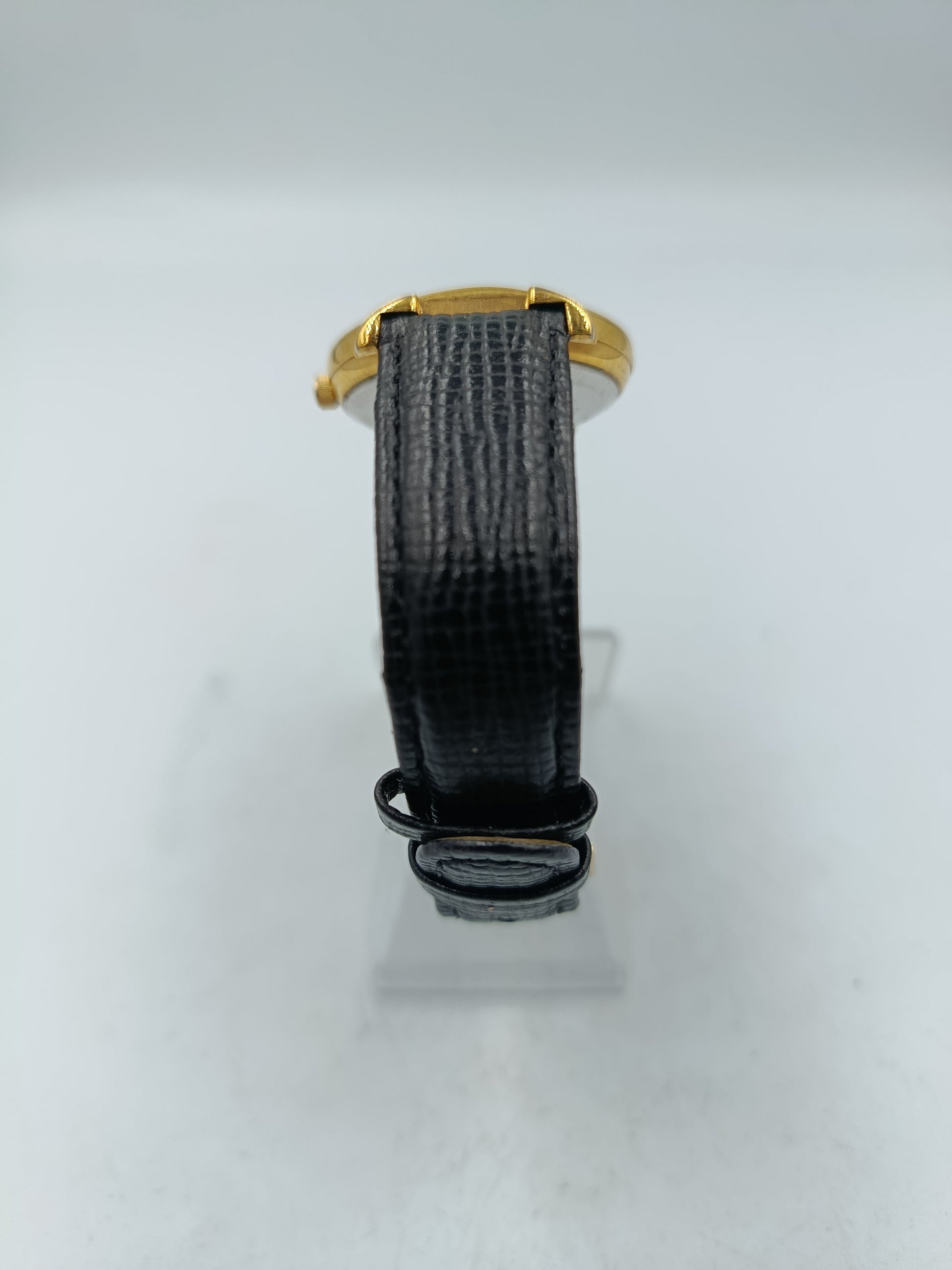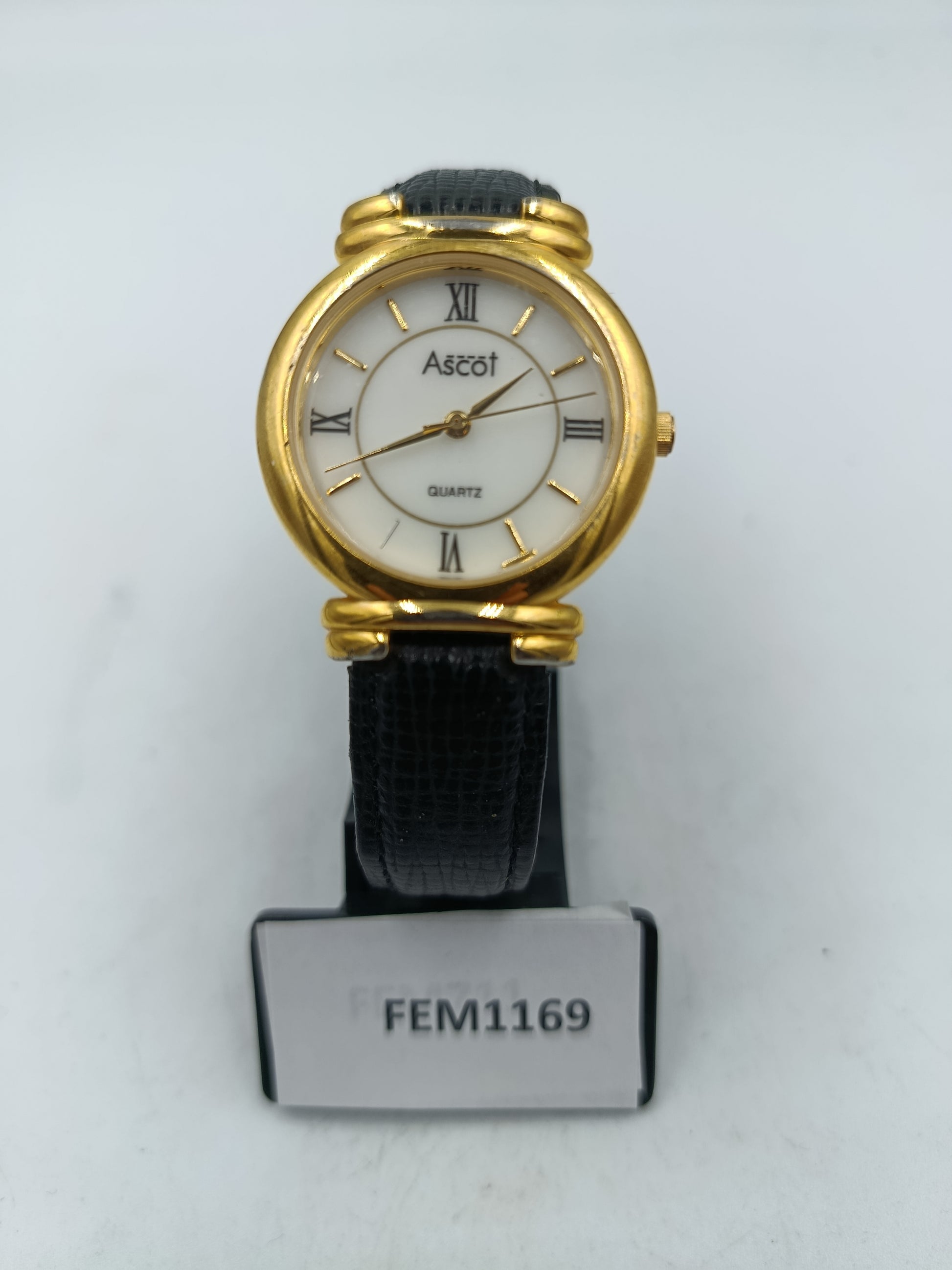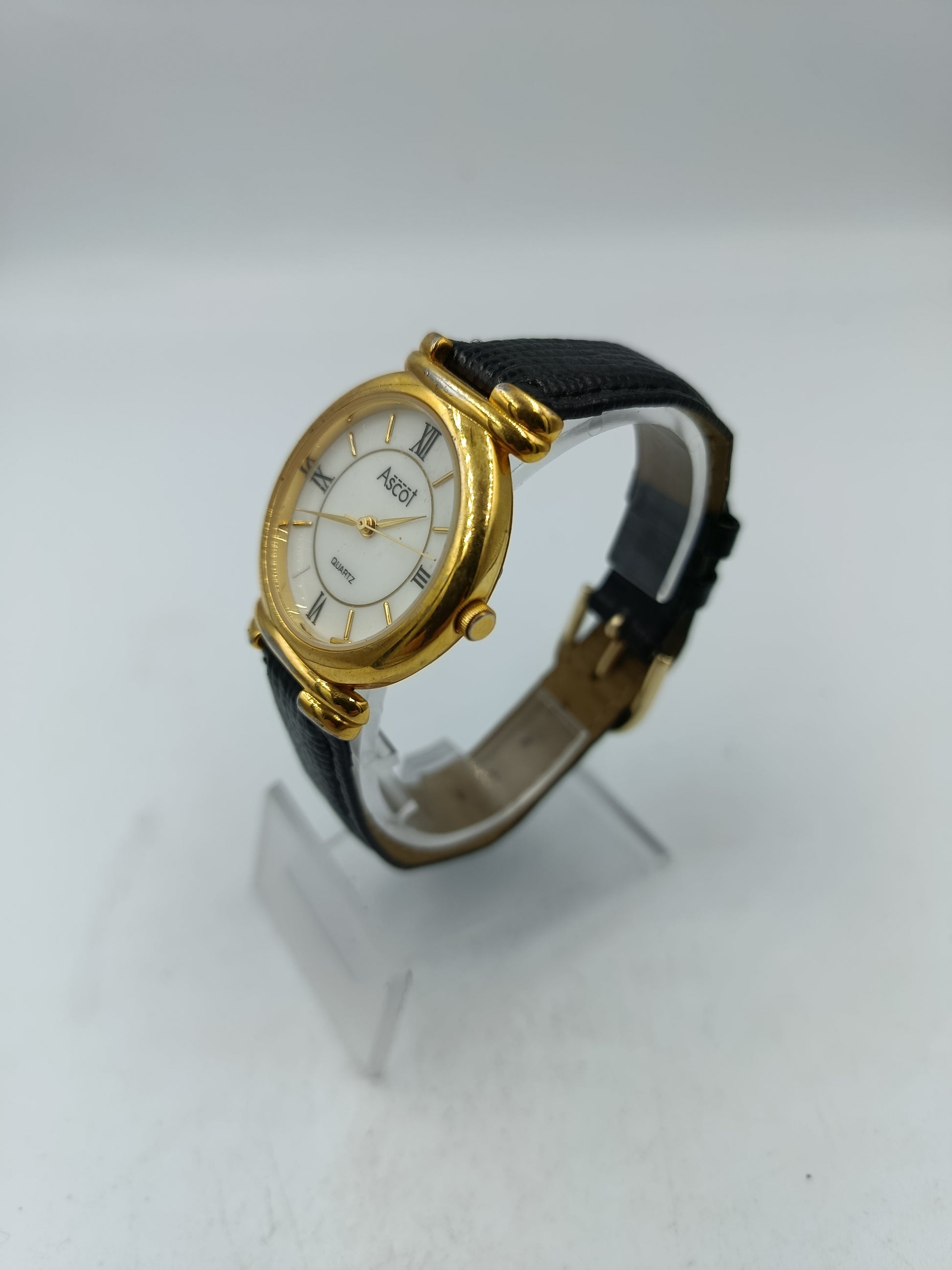 Ascot Damen Armbanduhr goldfarben mit schwarzem Lederband Zeitloses Design