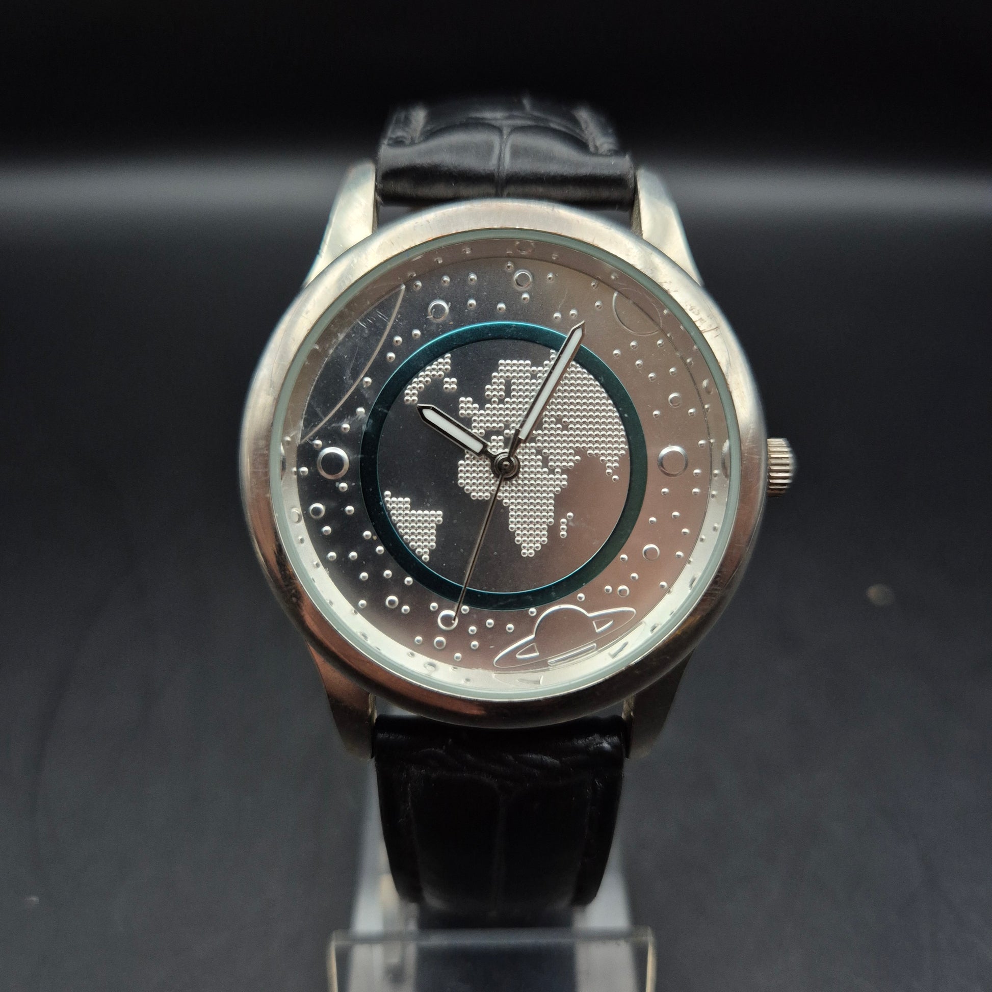 Diese kreative Herren Uhr begeistert mit einem originellen Zifferblatt, das eine stilisierte Weltkarte in Punktgrafik zeigt. Umrahmt von Planeten, Sternen und Orbitlinien wirkt die Uhr wie ein Blick ins All – ideal für Abenteurer, Entdecker und Weltraumfans. Das Gehäuse aus silberfarbenem Metall wird durch ein klassisches schwarzes Lederarmband ergänzt. Ein echter Eyecatcher am Handgelenk!