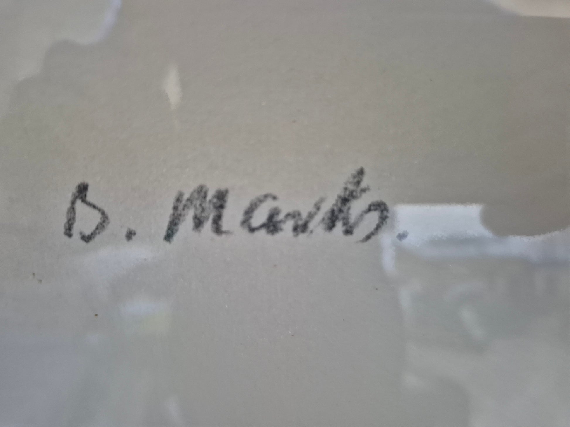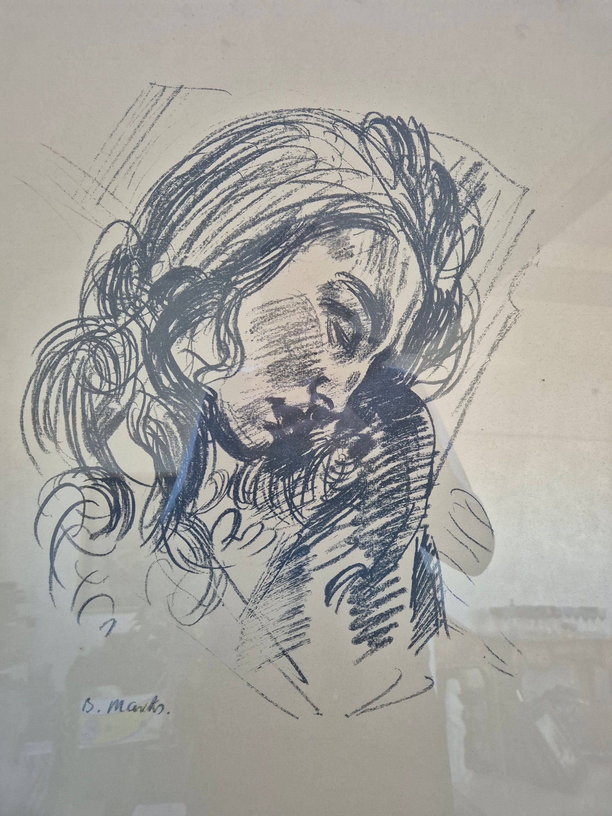 Ausdrucksstarke, originale Lithographie von B. Marks mit der Darstellung einer Frau im Seitenprofil. Die charakterstarke Linienführung und reduzierte Komposition verleihen dem Werk eine besondere Tiefe und Ausdruckskraft. Die Lithographie ist vom Künstler eigenhändig signiert.