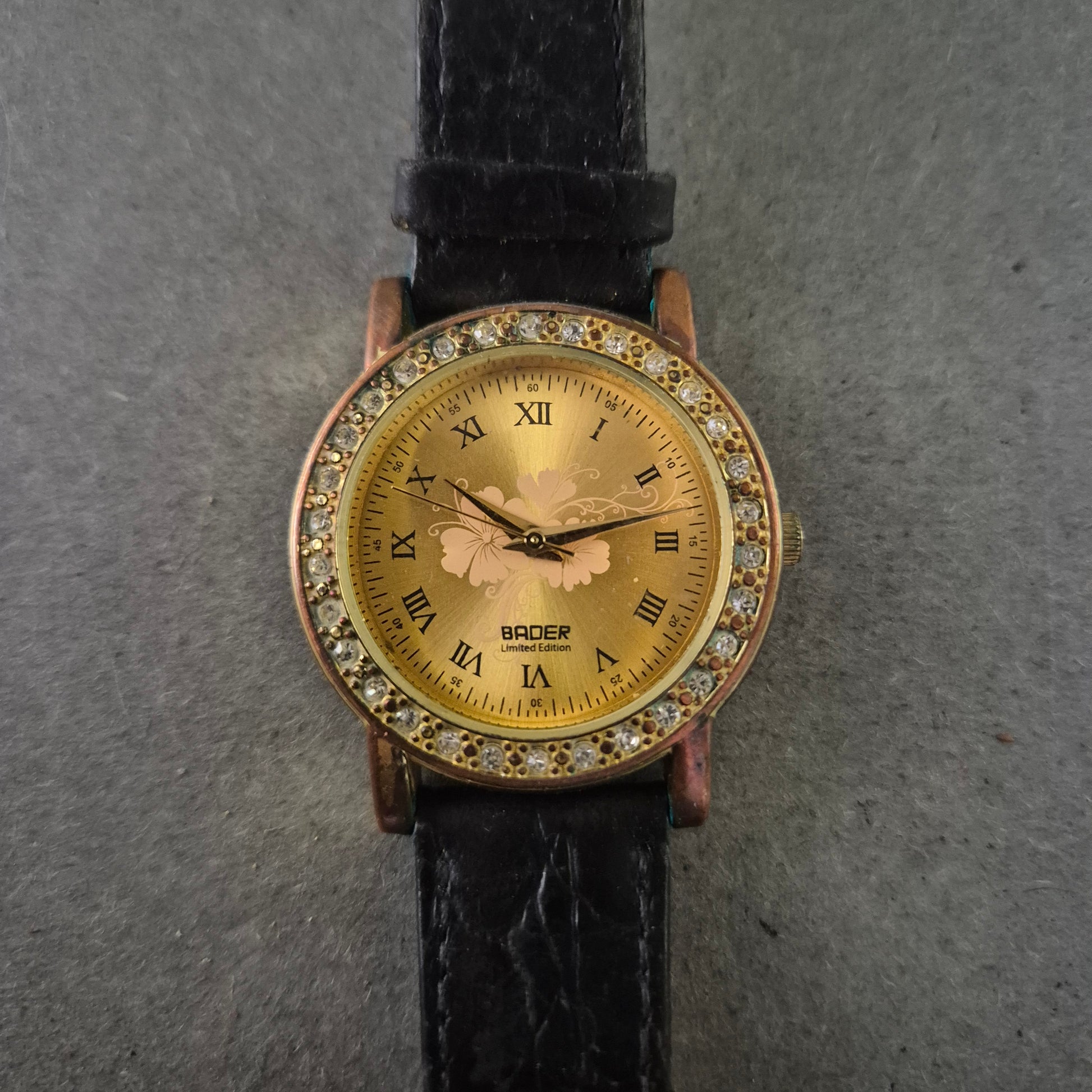 Diese elegante Damenarmbanduhr von BADER (Limited Edition) verbindet klassischen Charme mit dekorativen Akzenten. Das goldfarbene Zifferblatt mit römischen Zahlen und floralem Muster wird von einem funkelnden Strassrahmen umgeben. Das schwarze Kunstlederarmband sorgt für angenehmen Tragekomfort – ideal für besondere Anlässe oder stilvolle Alltagslooks.