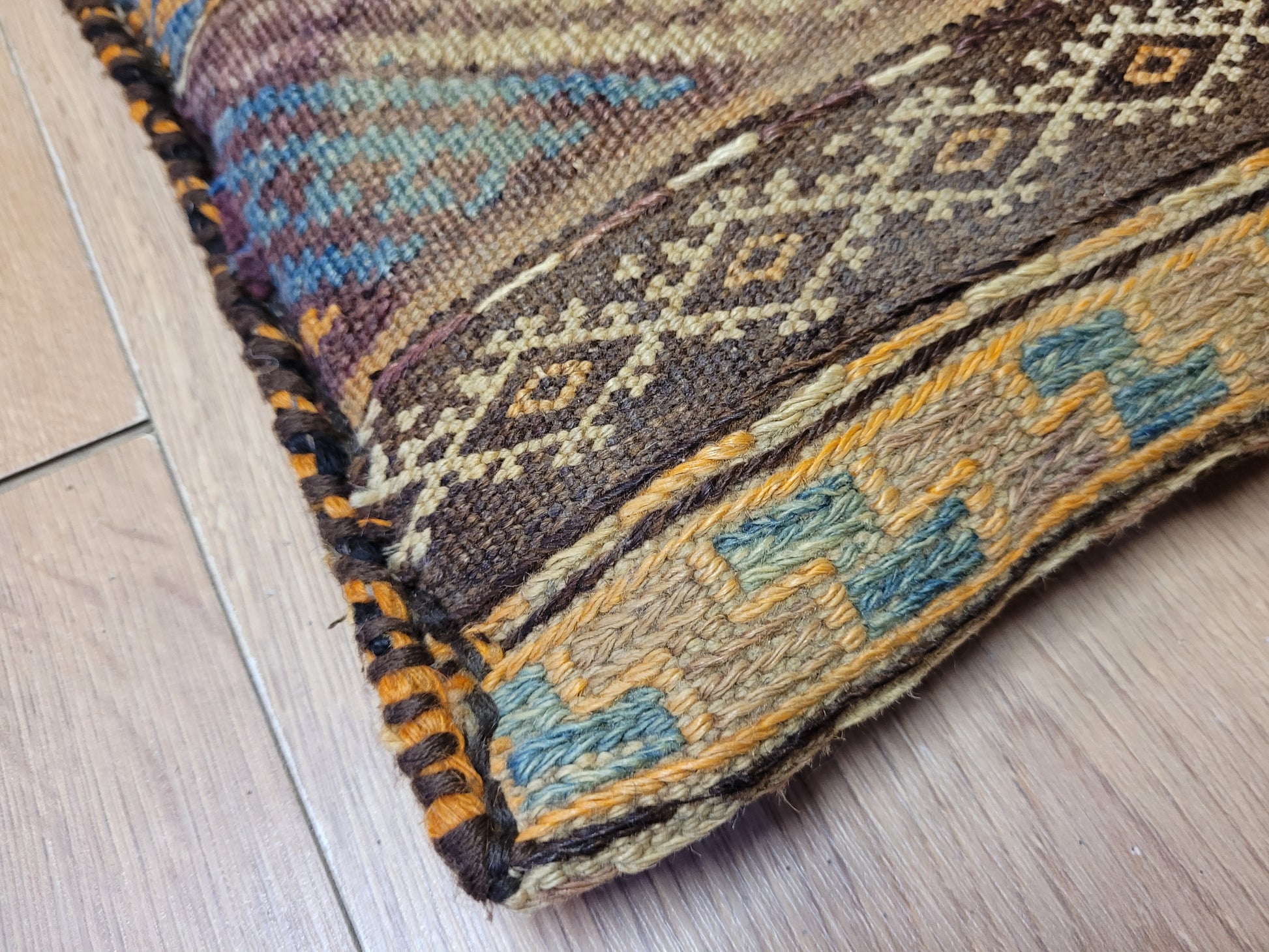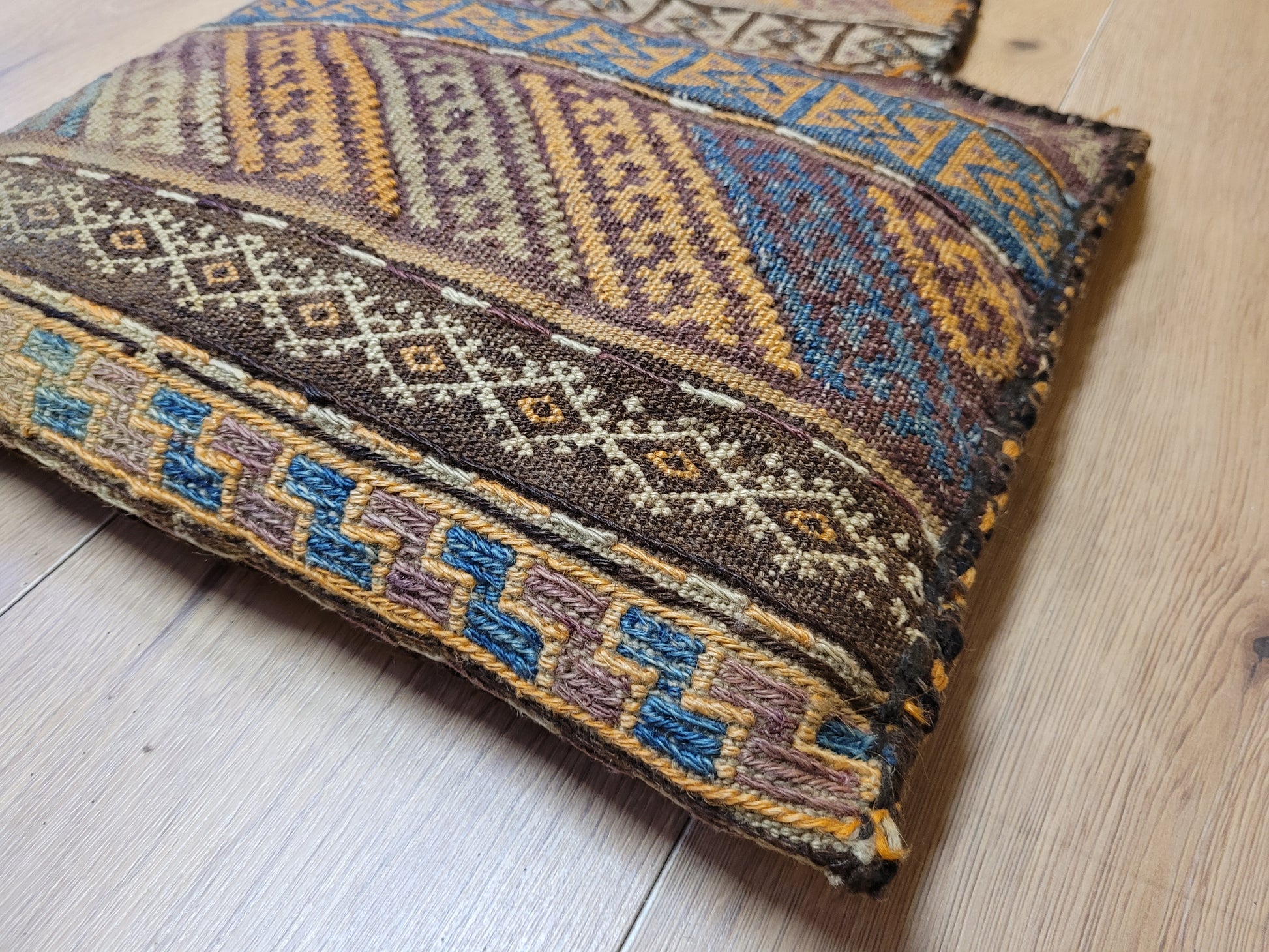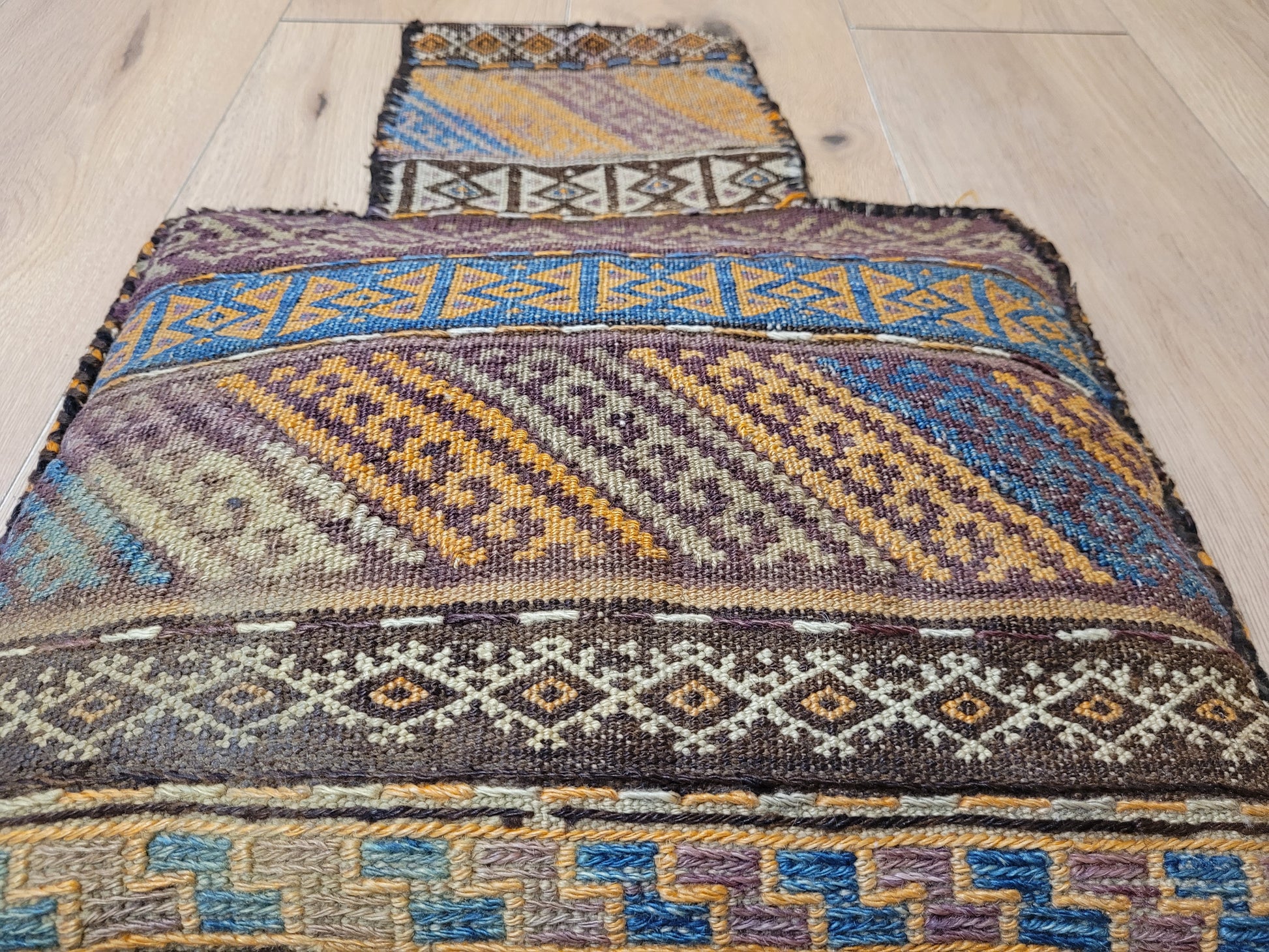 angeboten wird eine handgewebte Belutsch Kelim-Tasche in traditioneller Nomadenausführung. Dieses authentische Stück vereint kunstvolle Webtechnik mit kräftigen Naturfarben und geometrischen Mustern – ein typisches Beispiel für funktionale Stammeskunst mit dekorativem Charakter.