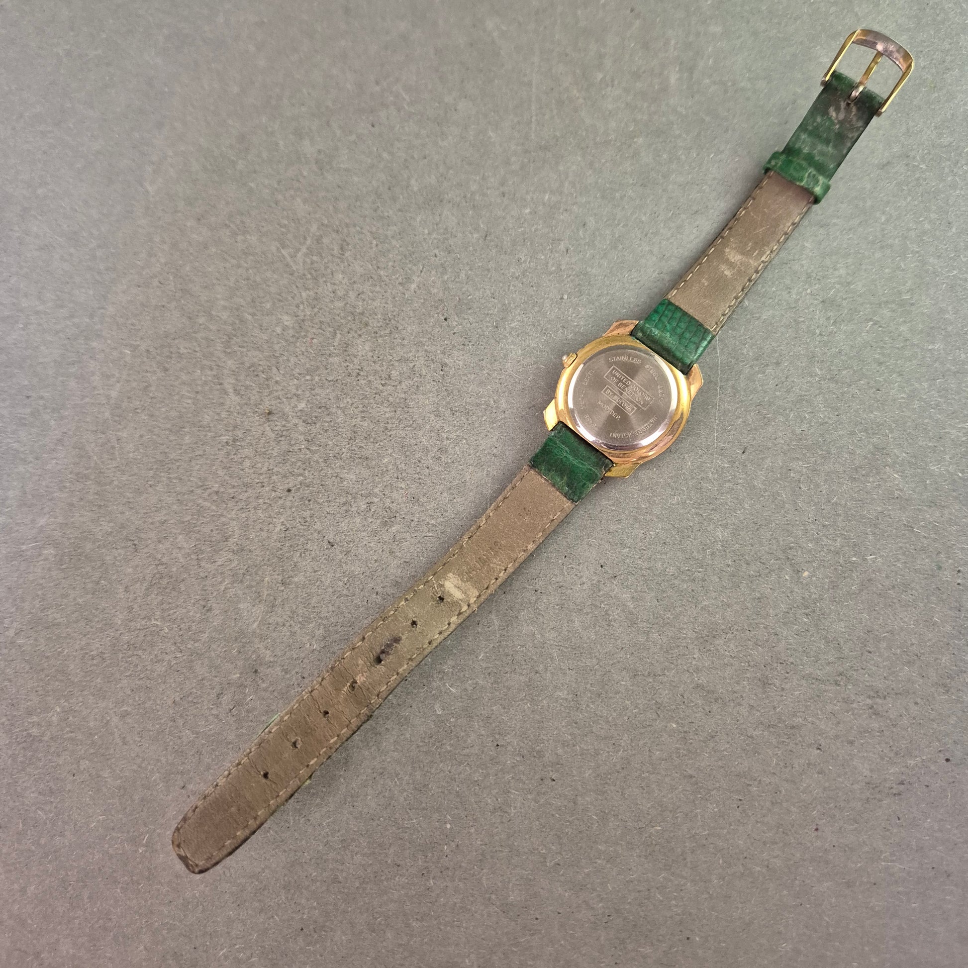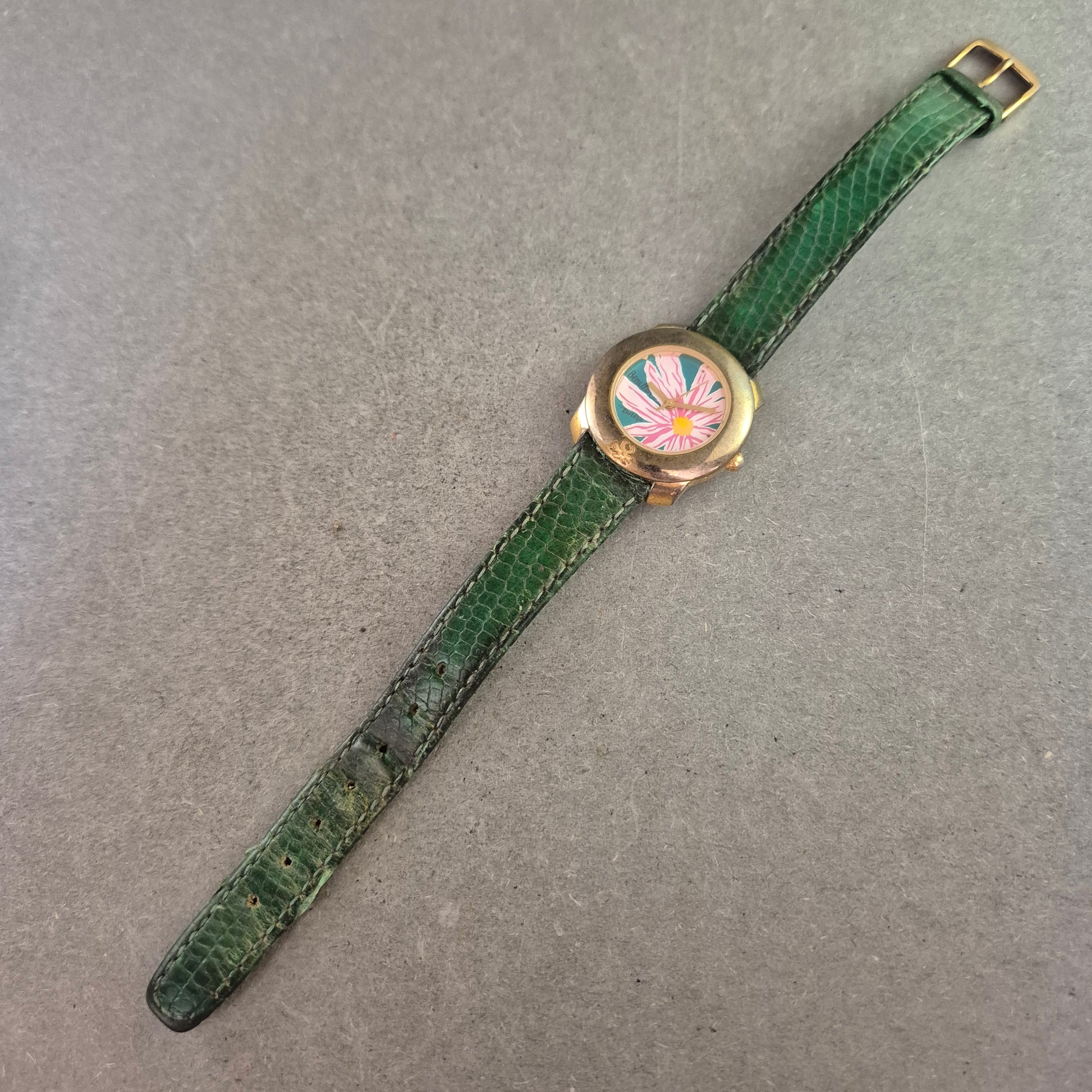 Diese seltene Vintage Damen Uhr von United Colors of Benetton by Bulova ist ein echtes Sammlerstück aus den 80er/90er Jahren. Das auffällige Zifferblatt mit großem Blumenmotiv in Pink und Weiß auf türkisfarbenem Hintergrund macht die Uhr zu einem farbenfrohen Hingucker. Das grüne Lederarmband in Schlangenoptik rundet den extravaganten Look perfekt ab. Ideal für Liebhaberinnen von Retro-Designs und außergewöhnlichen Accessoires.