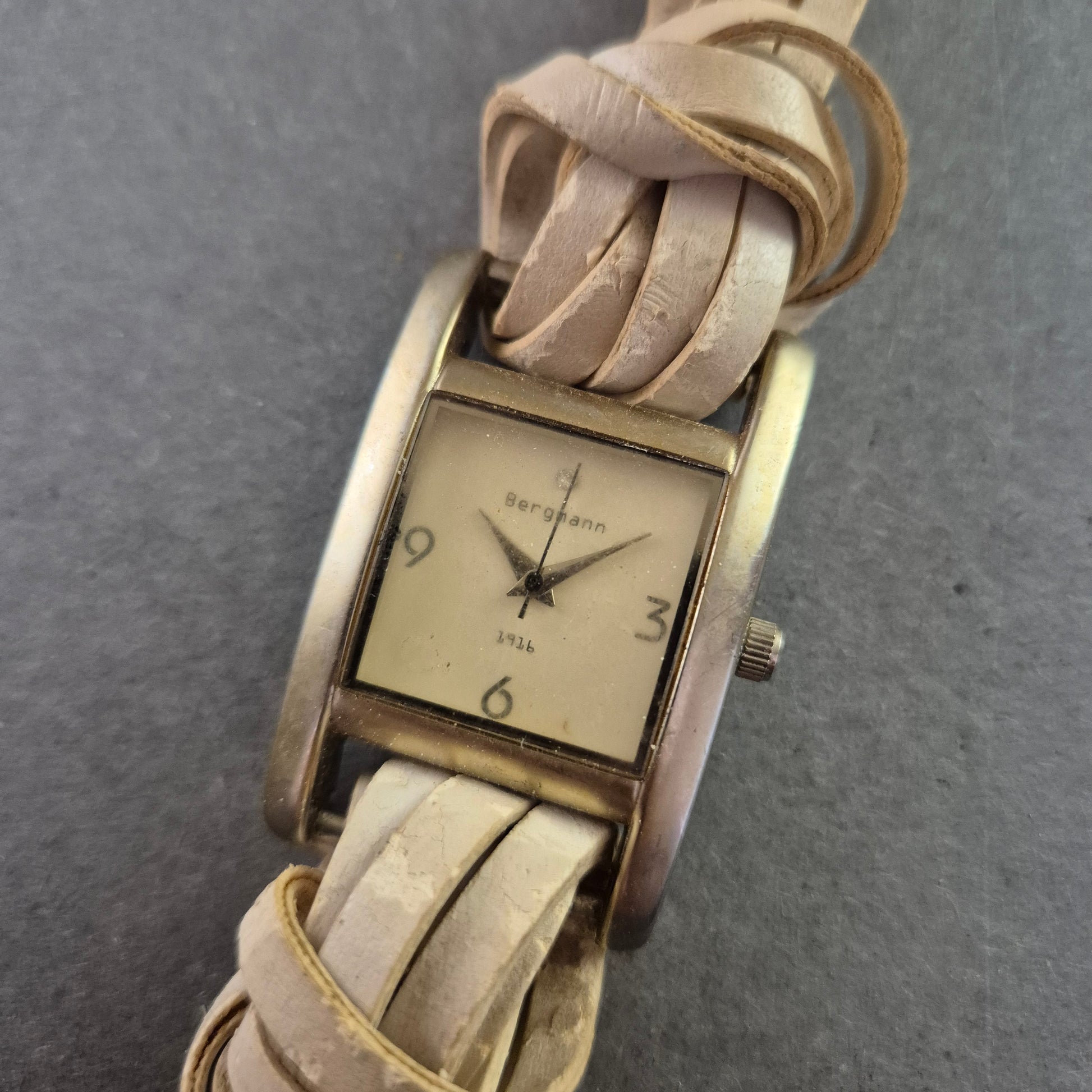Diese elegante Damenarmband Uhr der Marke Bergmann vereint klassischen Stil mit einem markanten Design. Das rechteckige Gehäuse in Messingoptik und das cremefarbene Zifferblatt mit minimalistischer Beschriftung geben der Uhr einen zeitlosen Charakter. Das besondere Highlight ist das geflochtene Lederarmband, das modische Akzente setzt.
