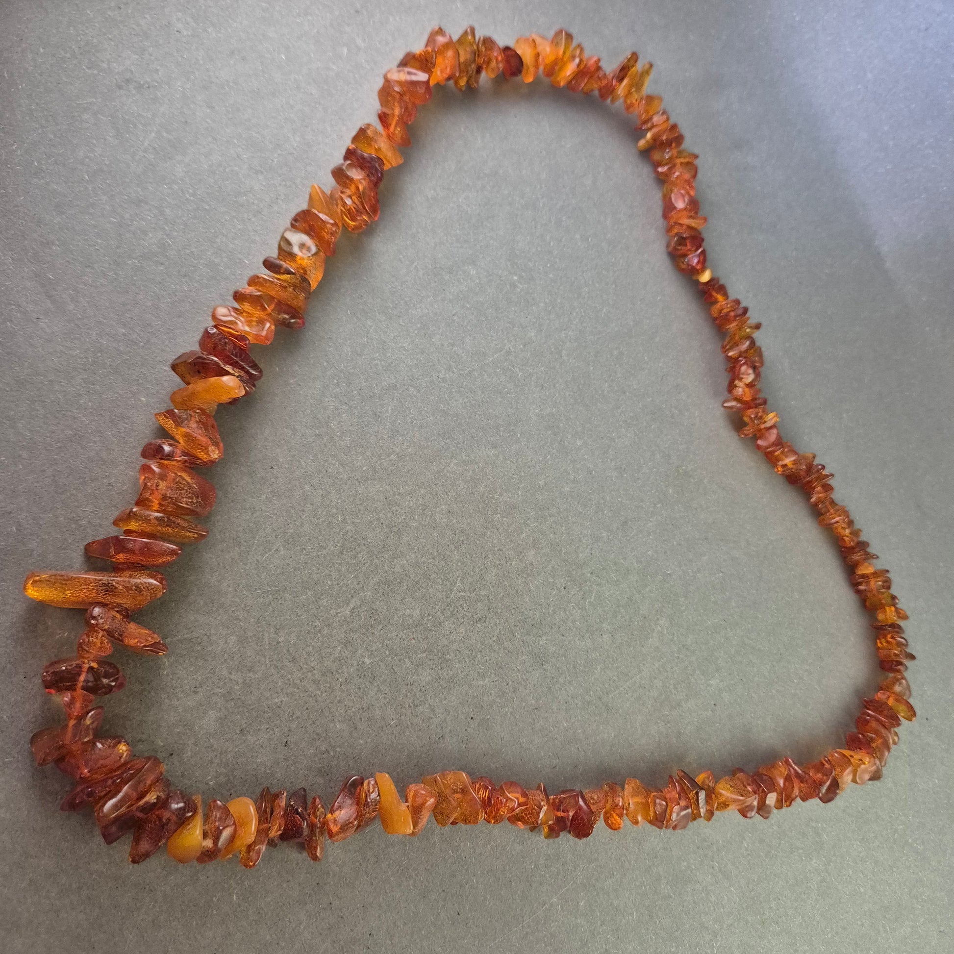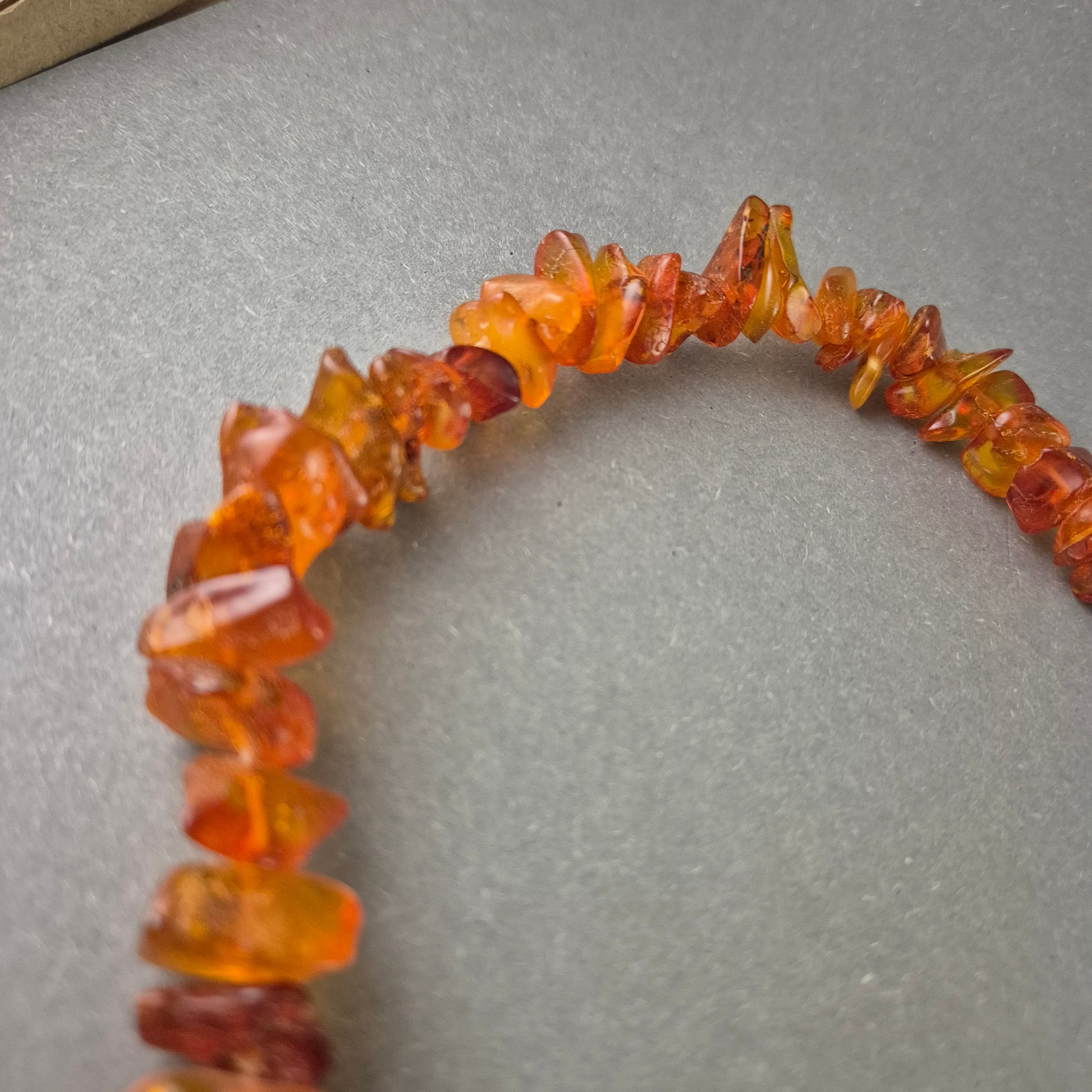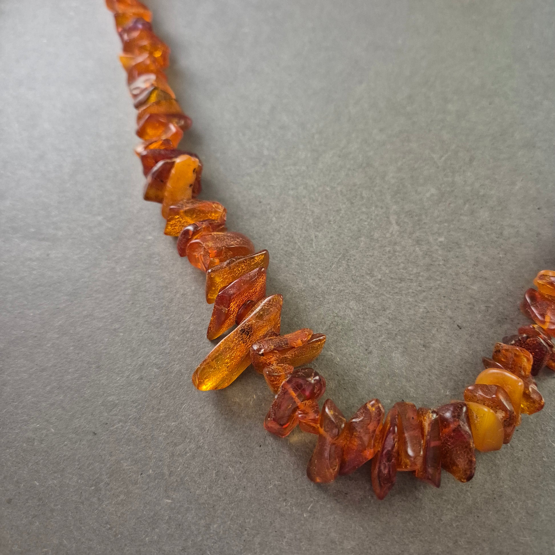 Diese wunderschöne Kette besteht aus naturbelassenen Bernsteinsplittern in warmen Honig- und Cognactönen. Durch ihre unregelmäßige Form und die natürliche Transparenz wirkt jedes Stück einzigartig und lebendig.