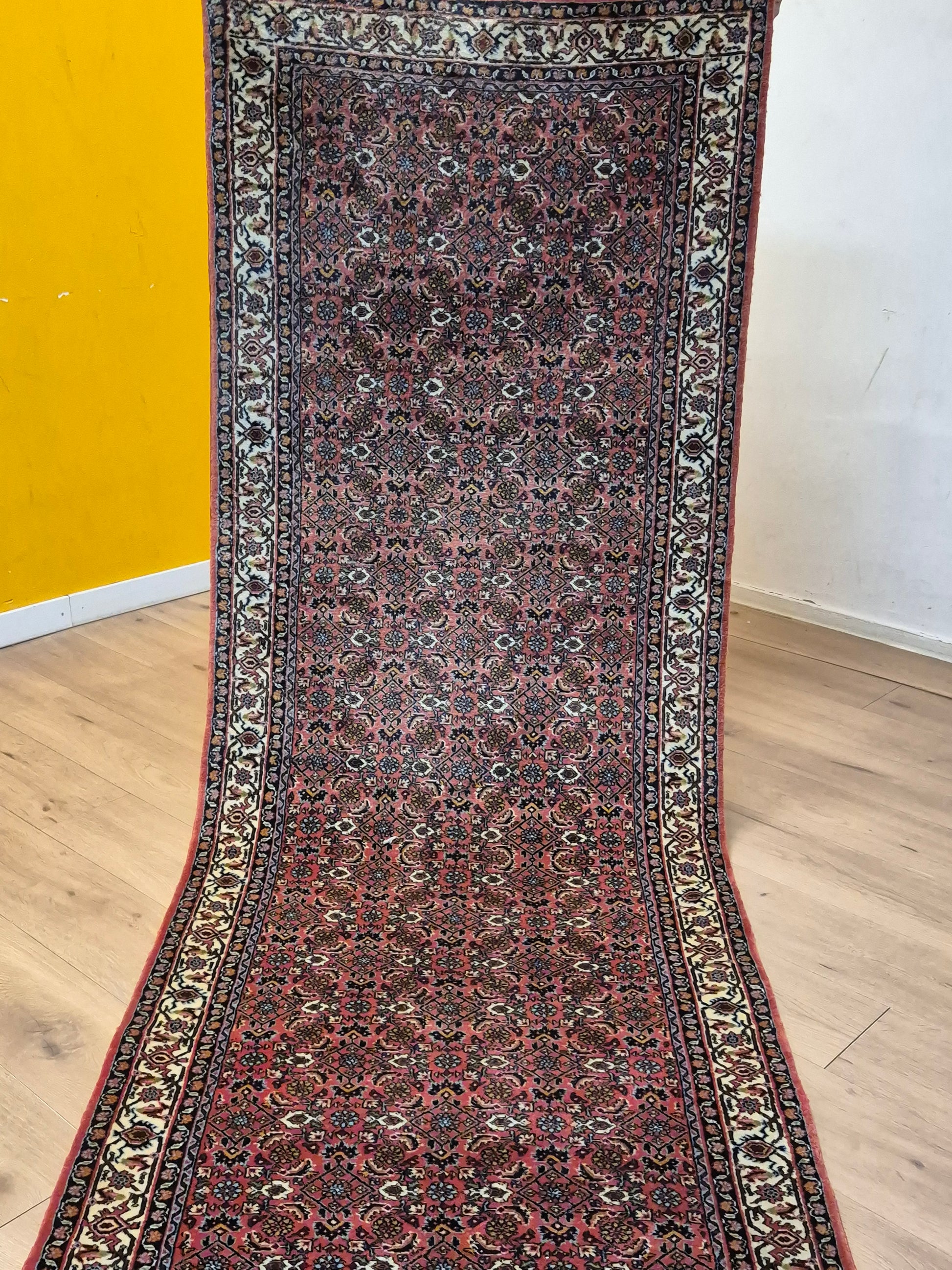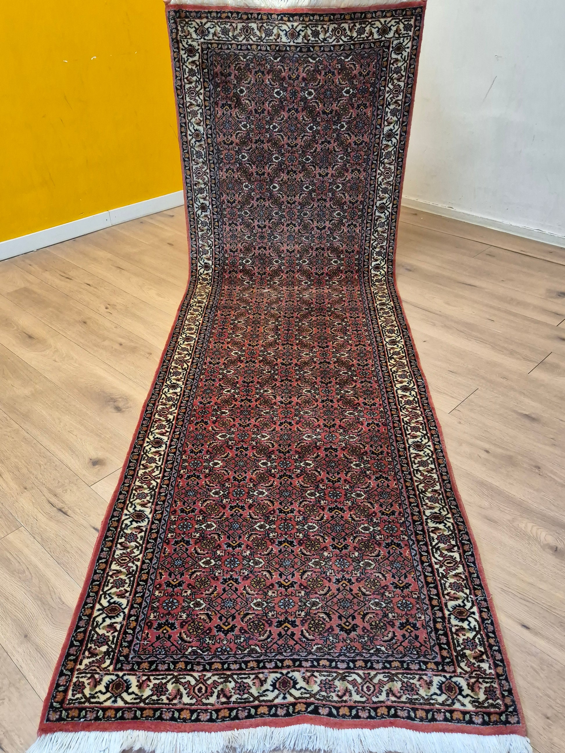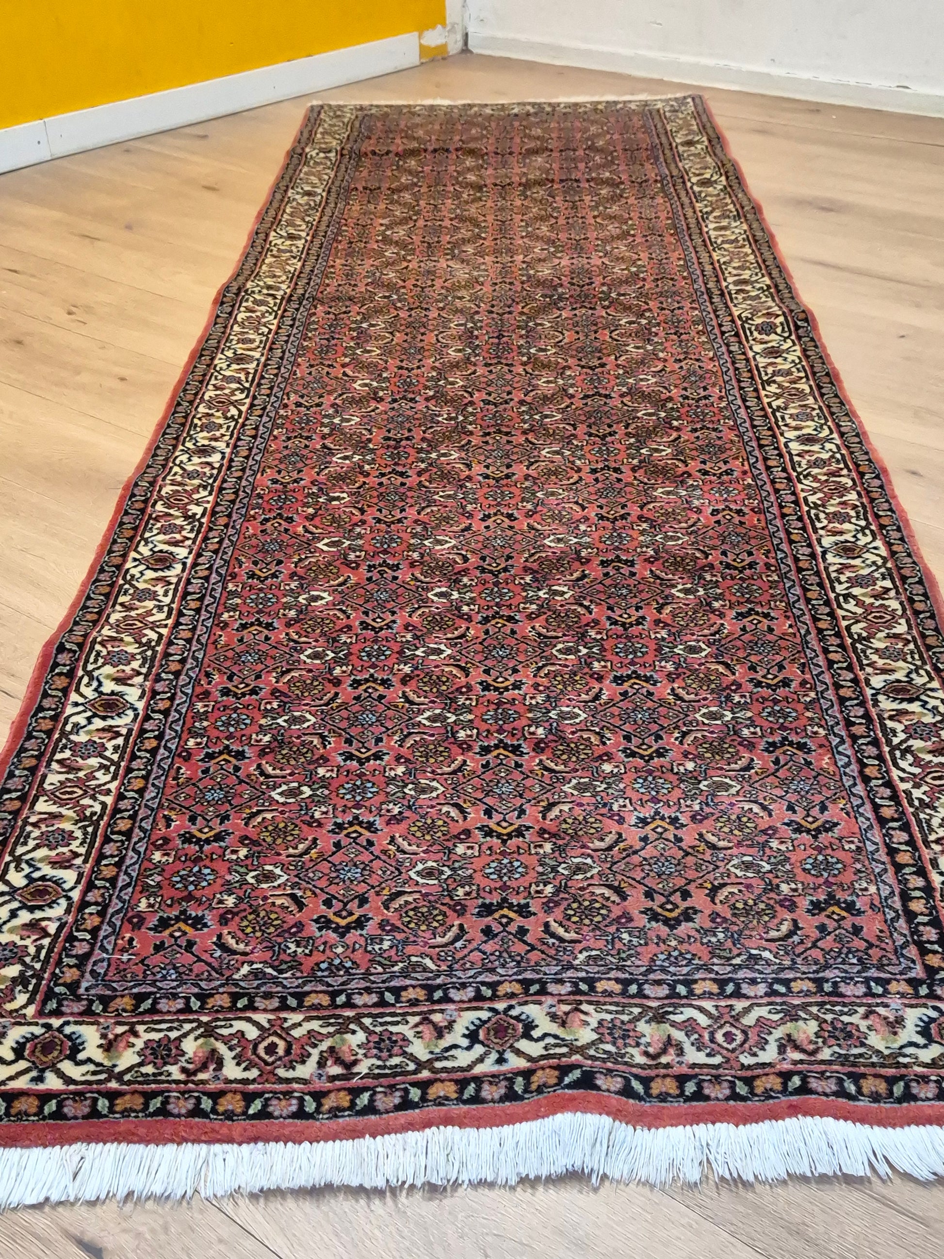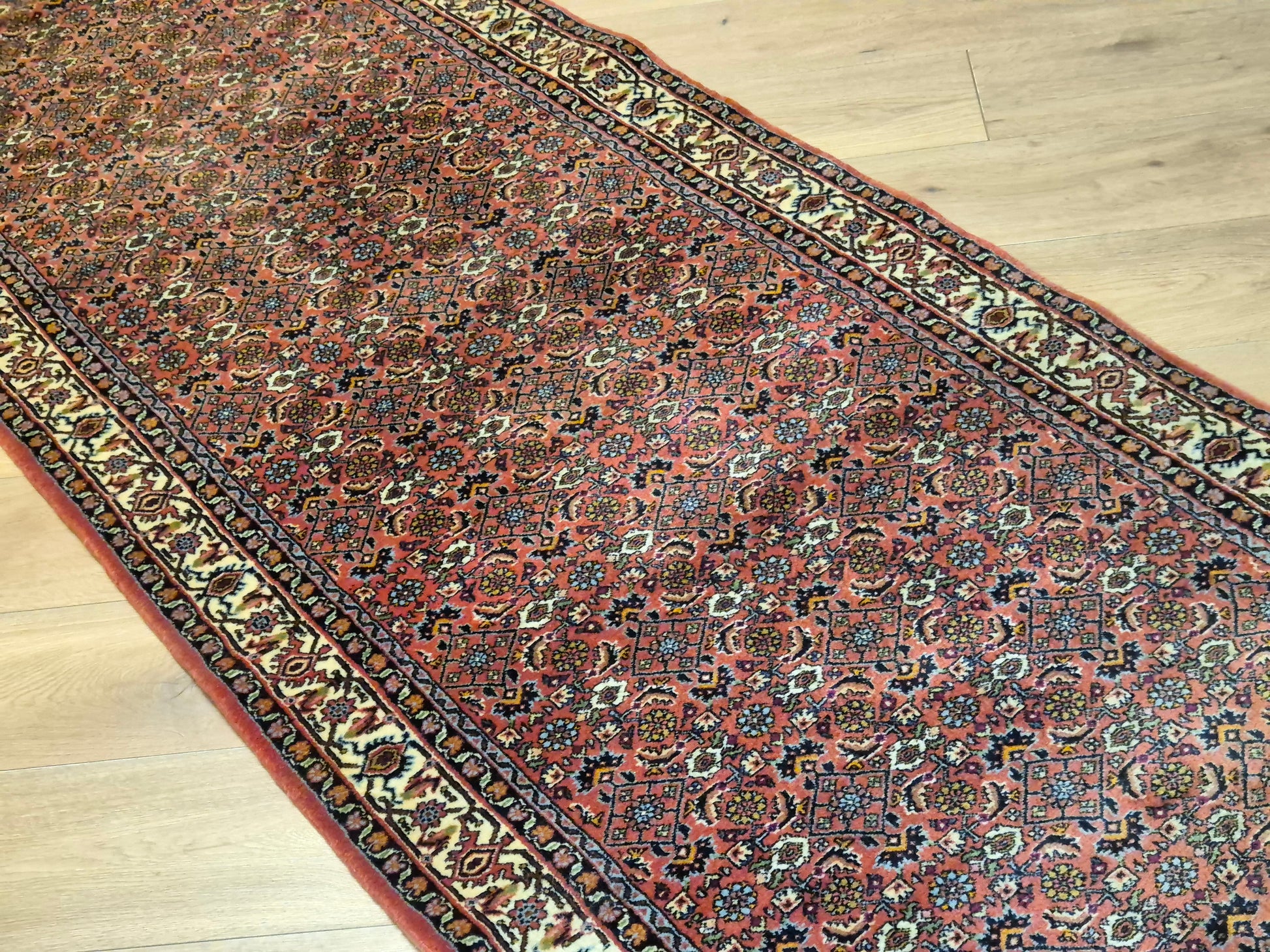 angeboten wird ein edler Bidjar Läufer in handgeknüpfter Ausführung. Das dichte Herati-Muster aus Rauten, Rosetten und stilisierten Blättern entfaltet sich gleichmäßig über das gesamte Feld und wird von einer kontrastreichen, elfenbeinfarbenen Bordüre mit floralen Ornamenten eingerahmt. Charakteristisch für Bidjar-Teppiche ist die äußerst robuste Knüpfung, die dem Teppich besondere Stabilität und Langlebigkeit verleiht.