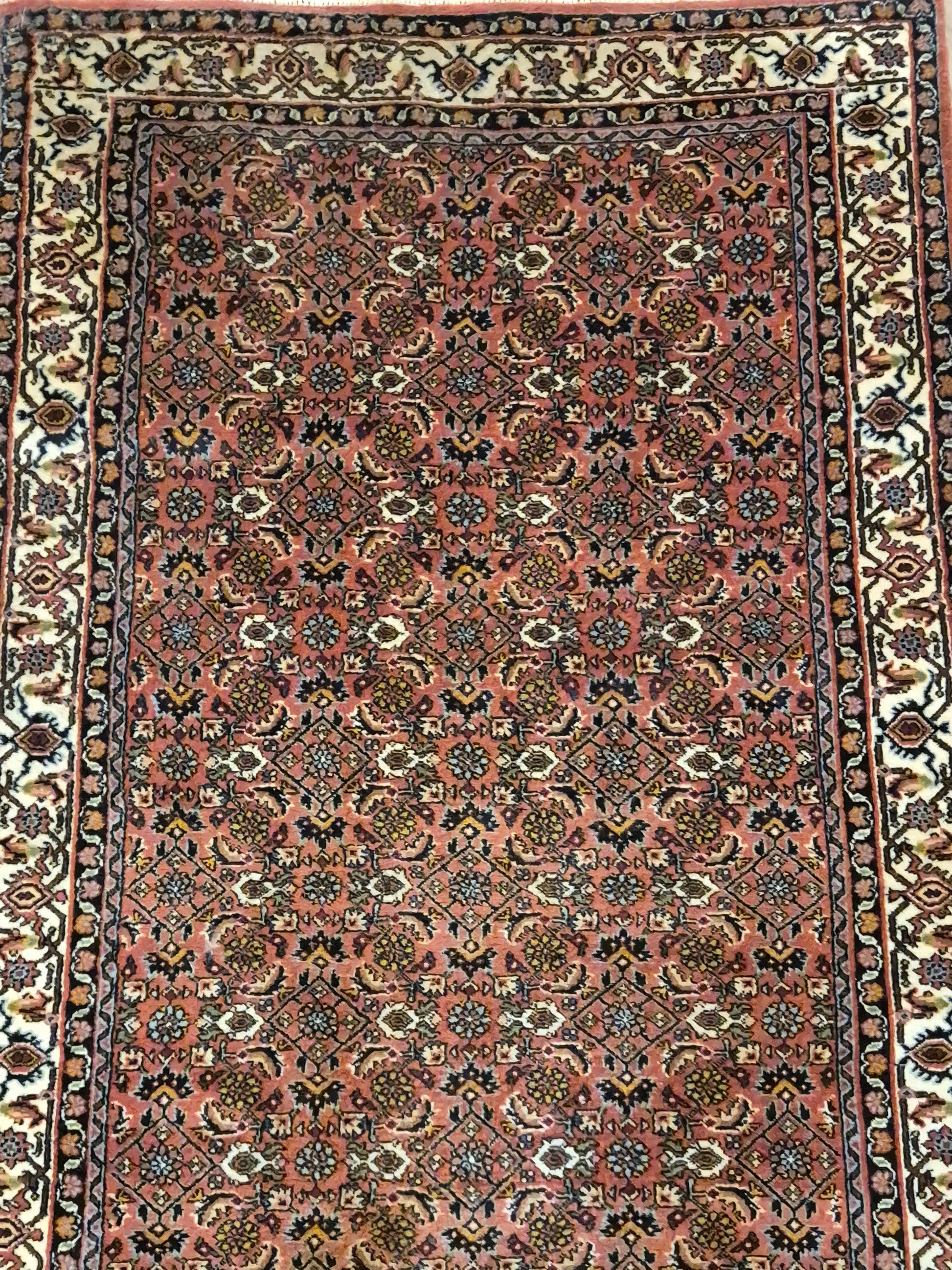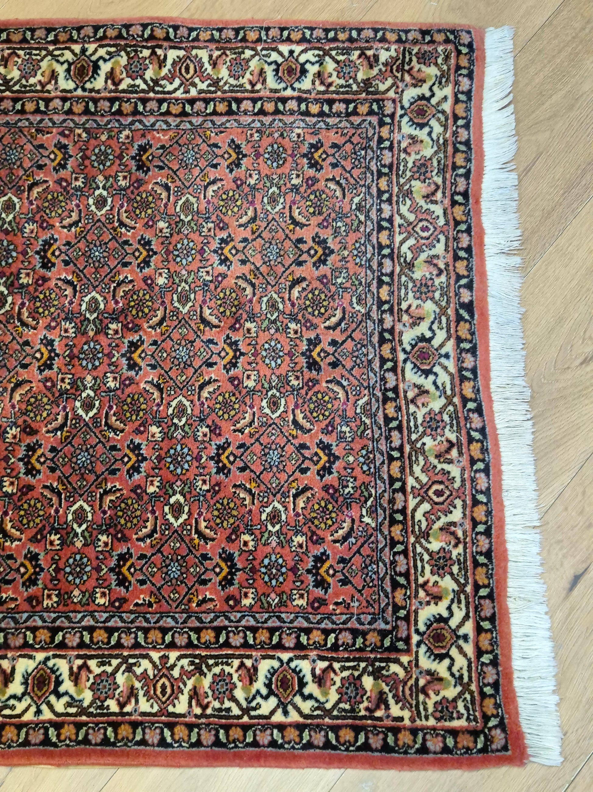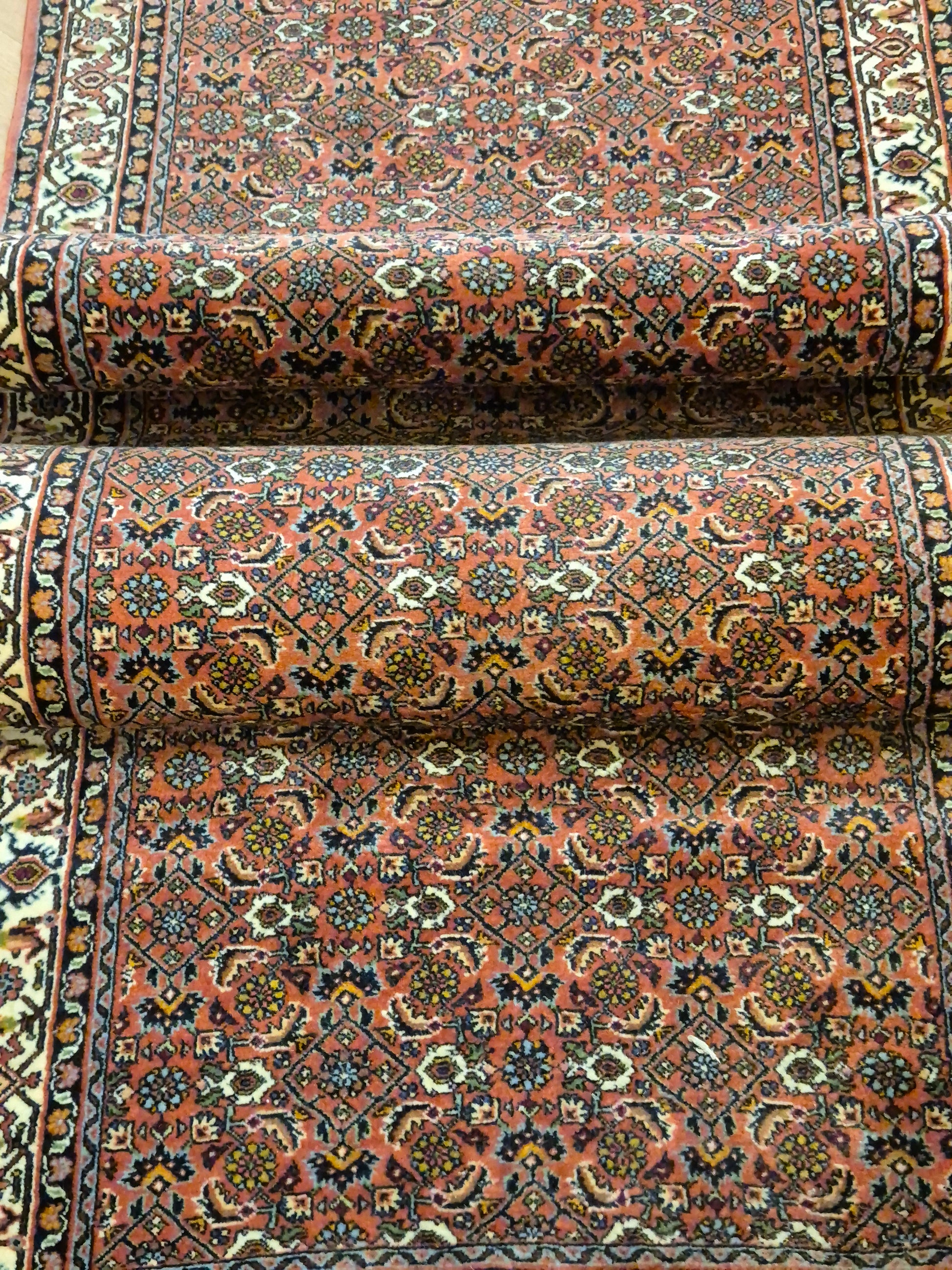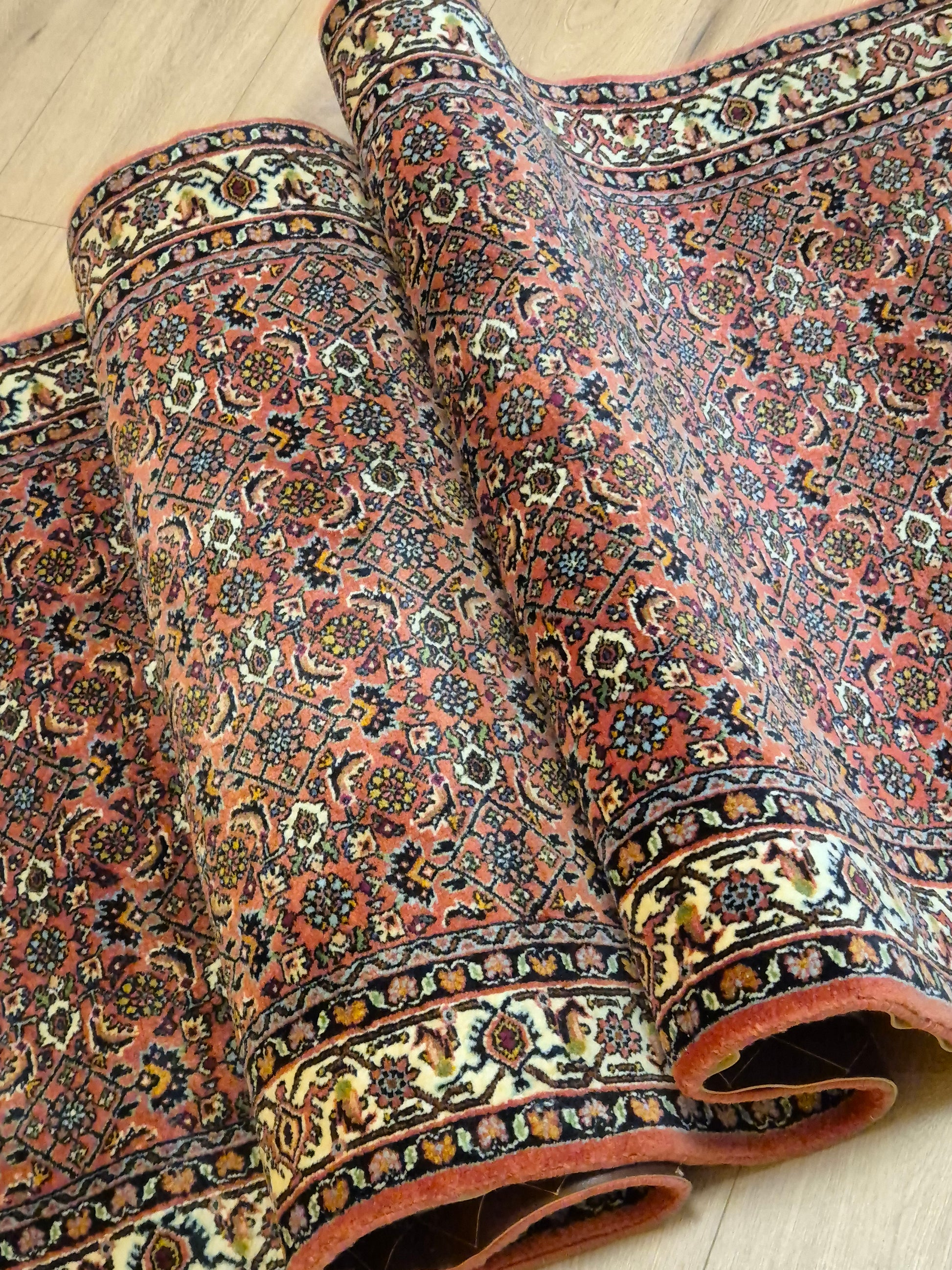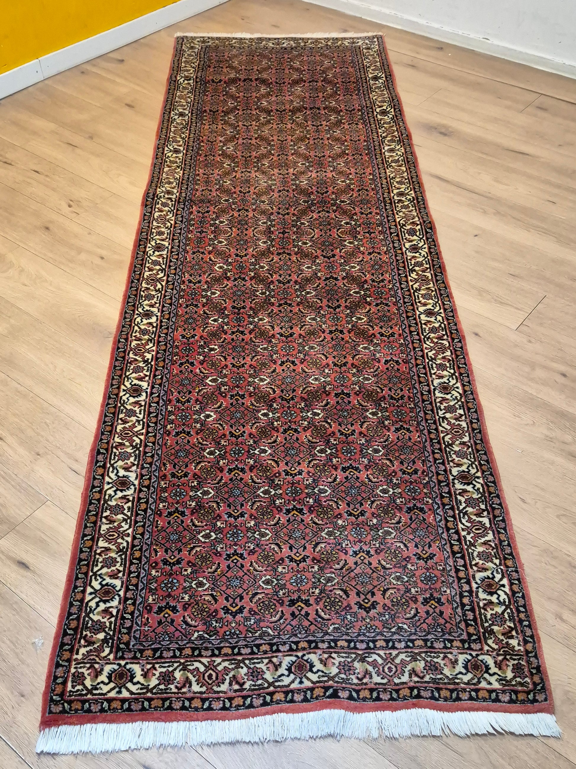 angeboten wird ein edler Bidjar Läufer in handgeknüpfter Ausführung. Das dichte Herati-Muster aus Rauten, Rosetten und stilisierten Blättern entfaltet sich gleichmäßig über das gesamte Feld und wird von einer kontrastreichen, elfenbeinfarbenen Bordüre mit floralen Ornamenten eingerahmt. Charakteristisch für Bidjar-Teppiche ist die äußerst robuste Knüpfung, die dem Teppich besondere Stabilität und Langlebigkeit verleiht.