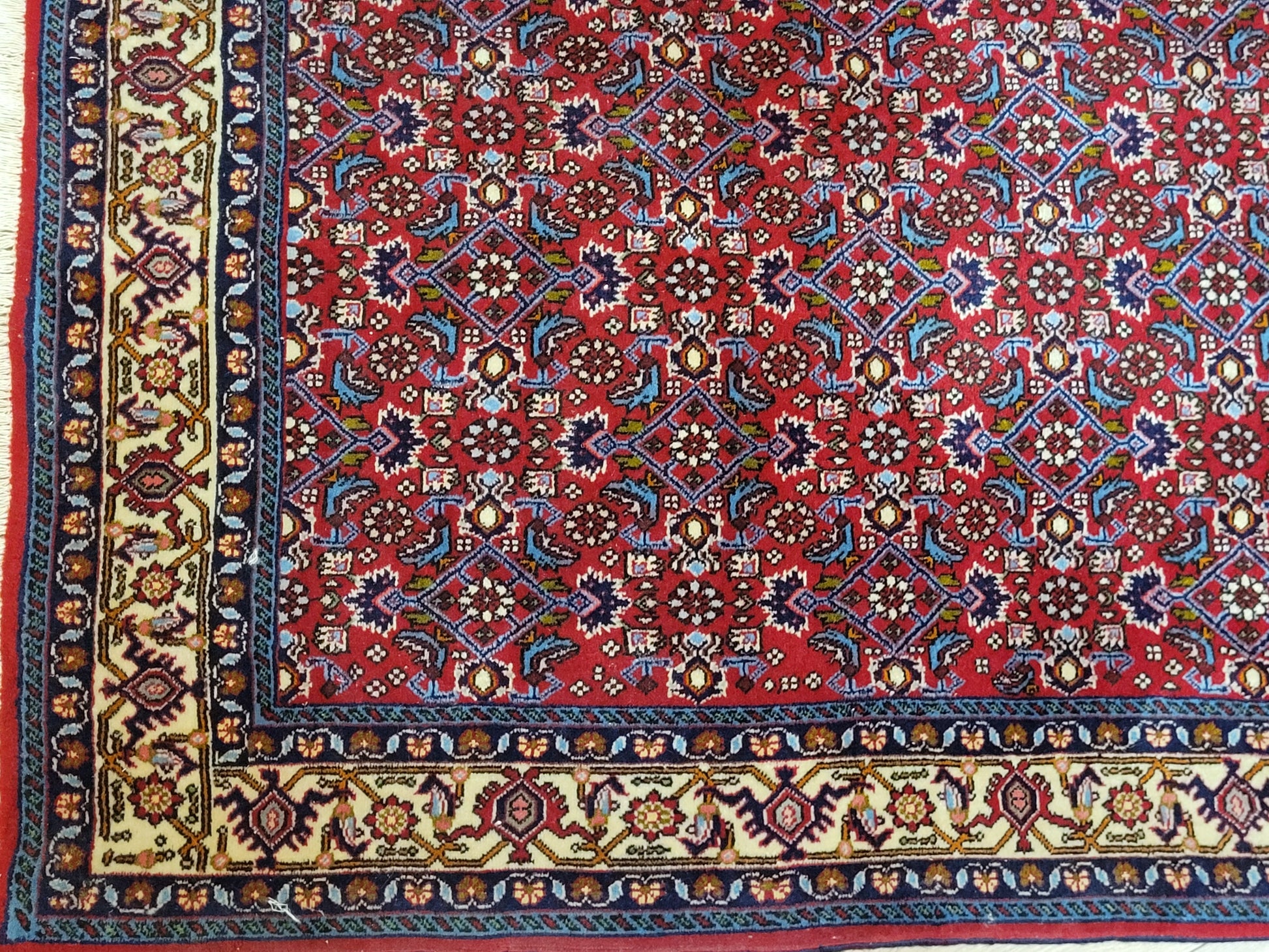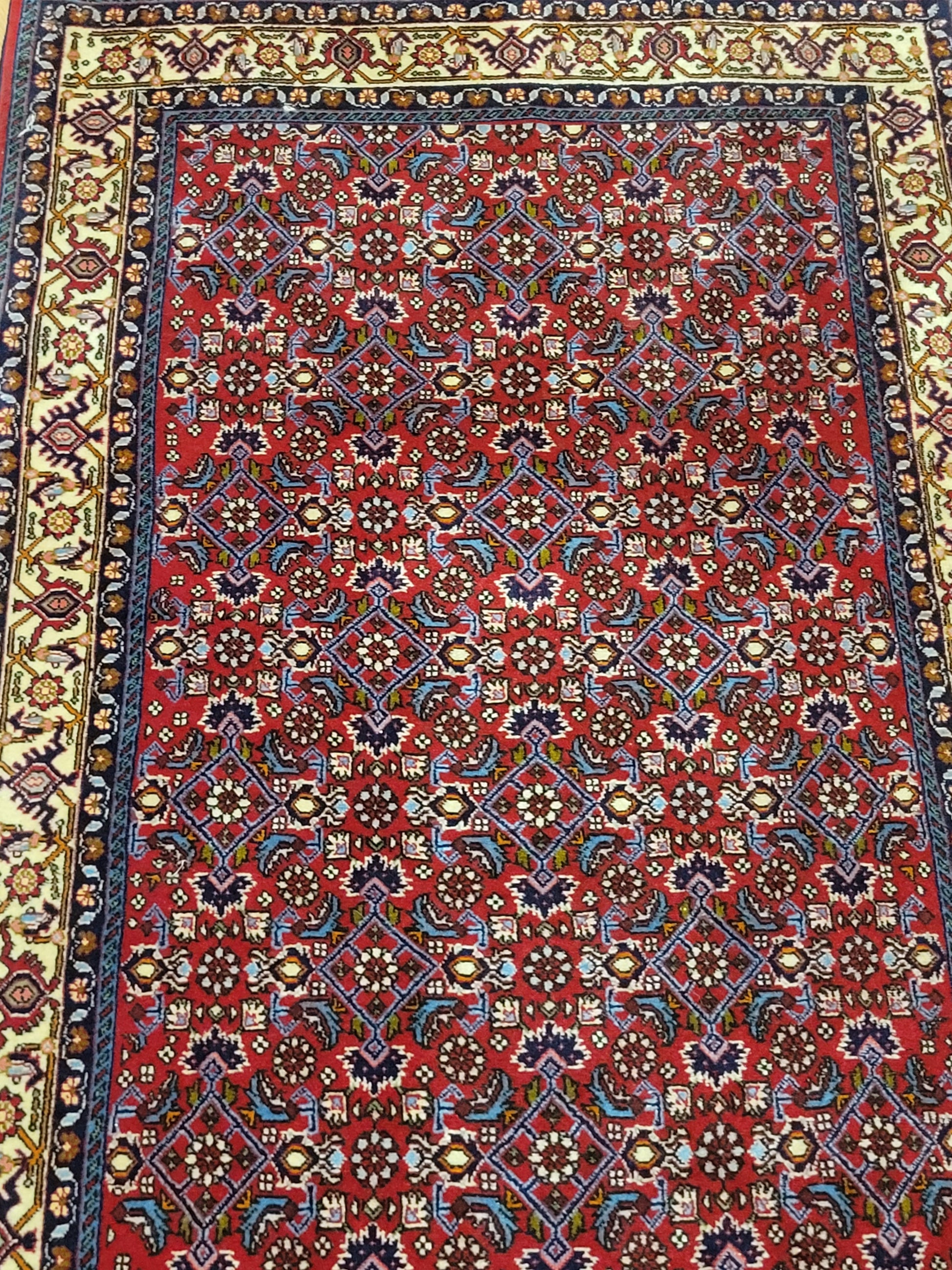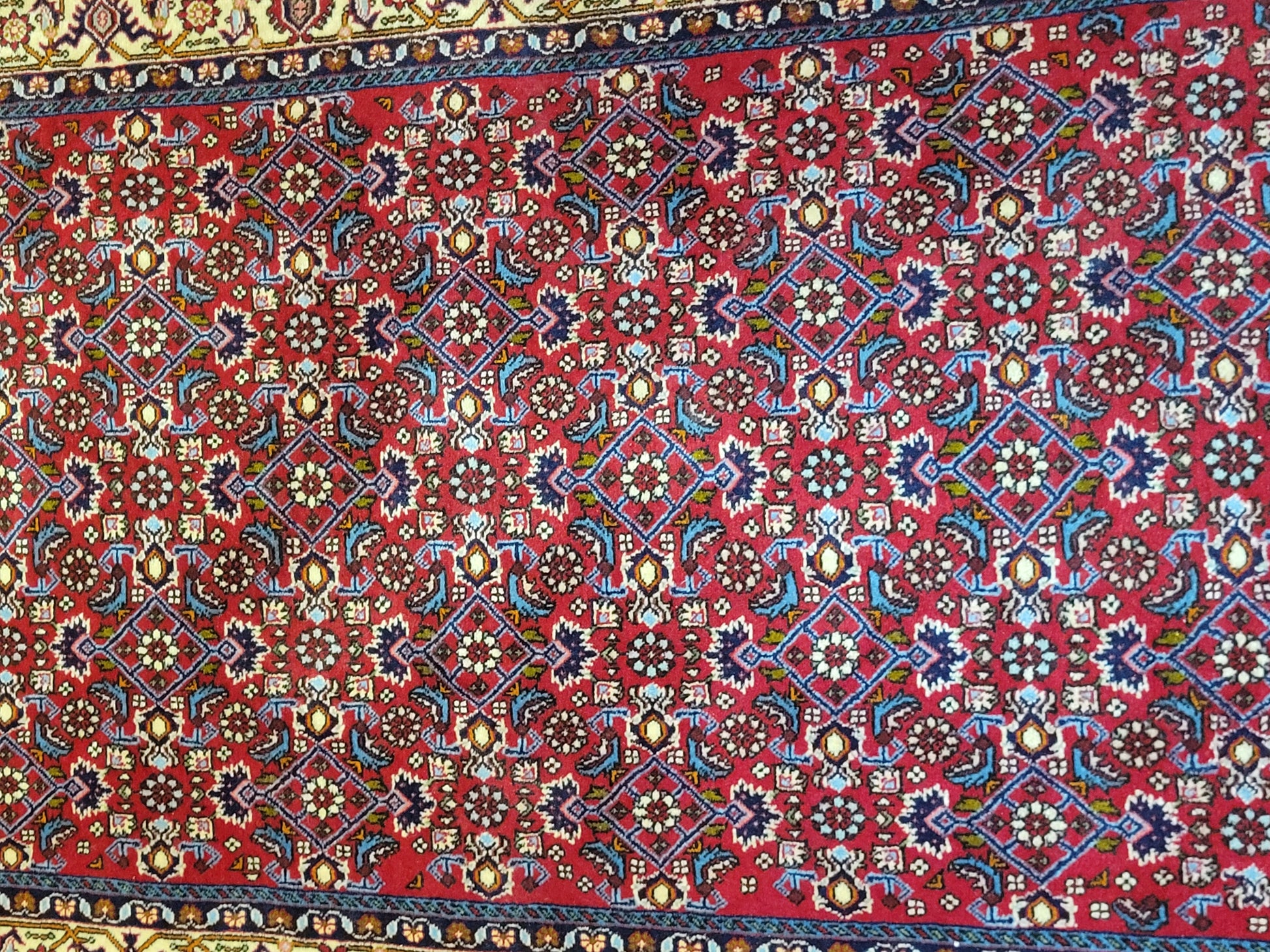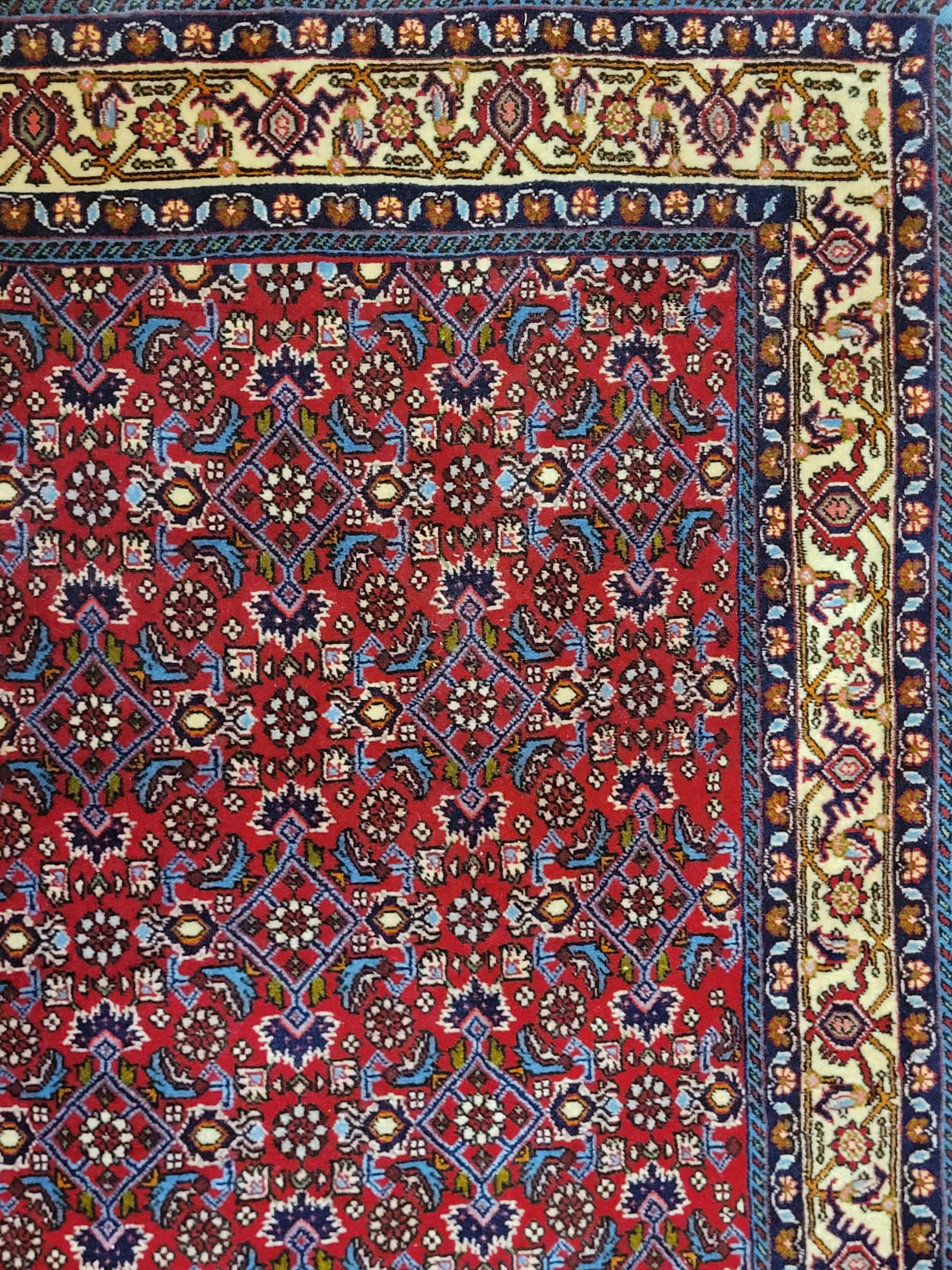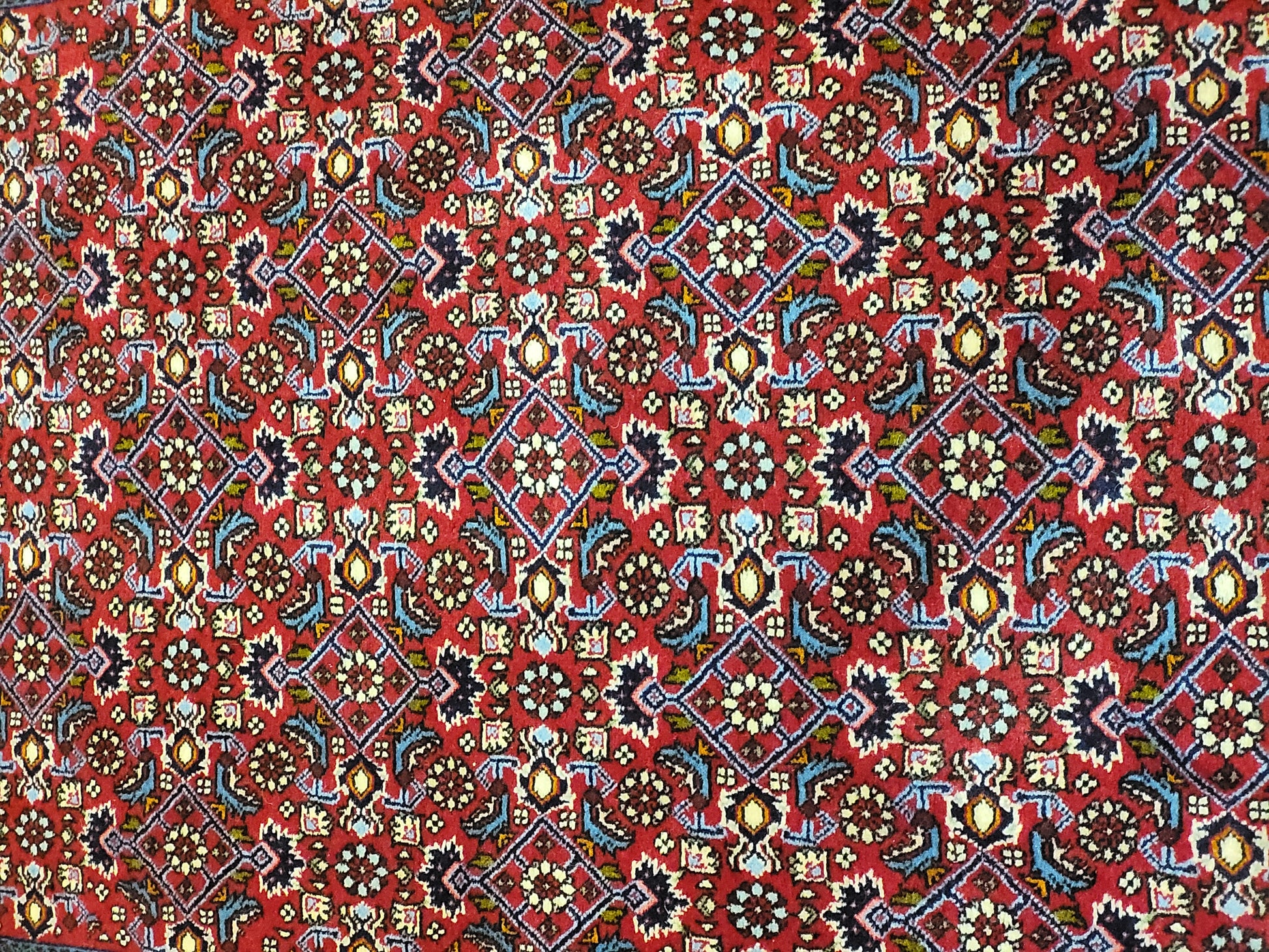 angeboten wird ein klassischer Bidjar Perserteppich, handgeknüpft aus hochwertiger Korkwolle. Das dichte, fein gearbeitete Allover-Muster mit kleinen floralen Motiven und geometrischen Elementen ist typisch für die traditionsreiche Knüpfkunst aus Bidjar und zeichnet sich durch eine besonders langlebige Verarbeitung aus.